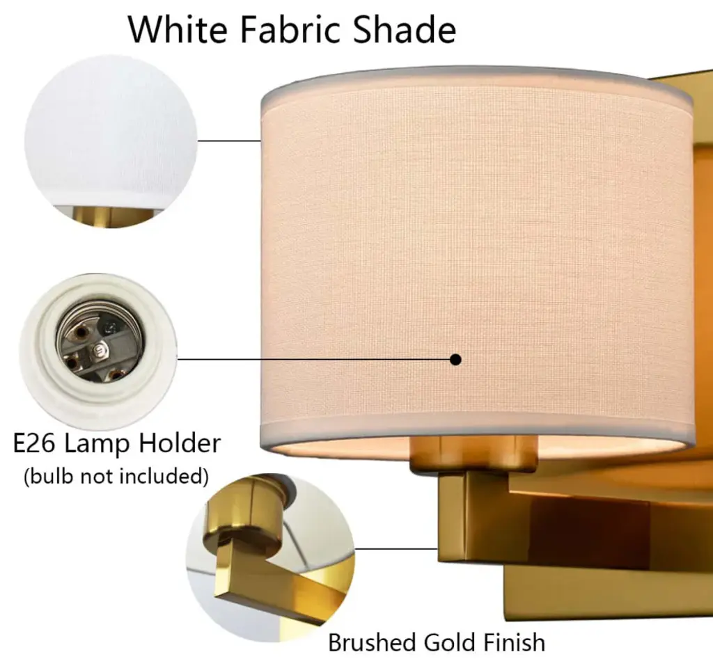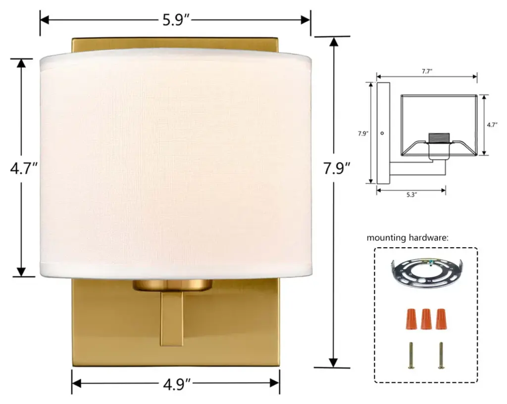 This wall sconce consists of rectangle metal backplate of brass finish and a drum shape white fabric lamp shade, adding a modern statement to your interior. And the E26 lamp holder is ceramic glazed design, high quality and durable.-Features:ETL ListedHardwired-Dimensions:light:5.9" W x 7.9" Hcanopy:4.9" W x 7.9" H -Bulb Requirement: (Not Included)Voltage: 110VWattage: 40 W MaxBase Type: E26