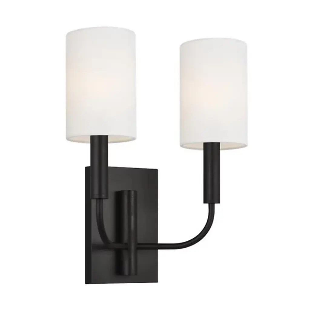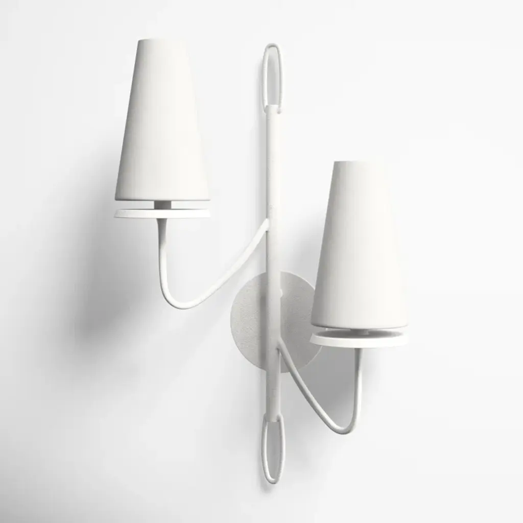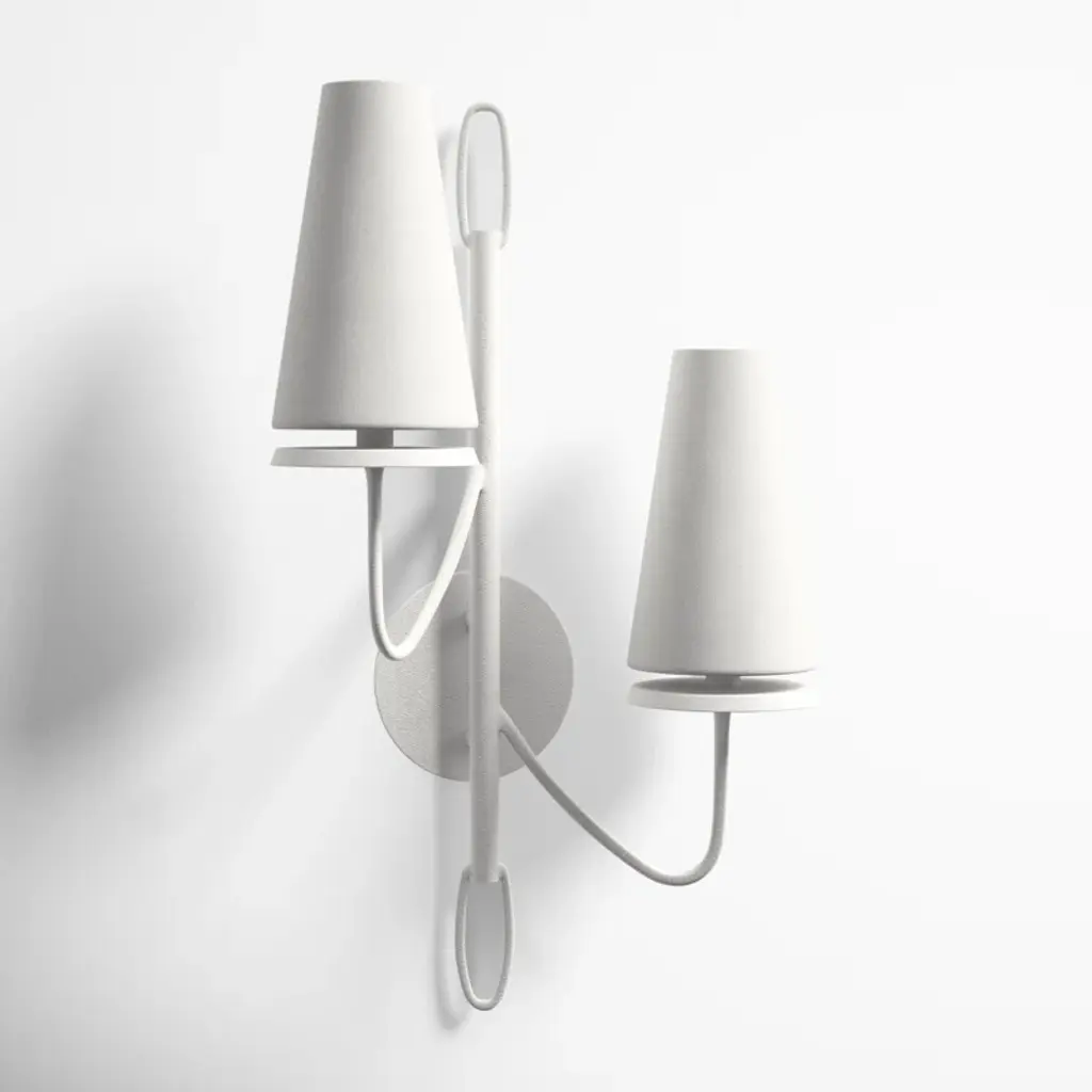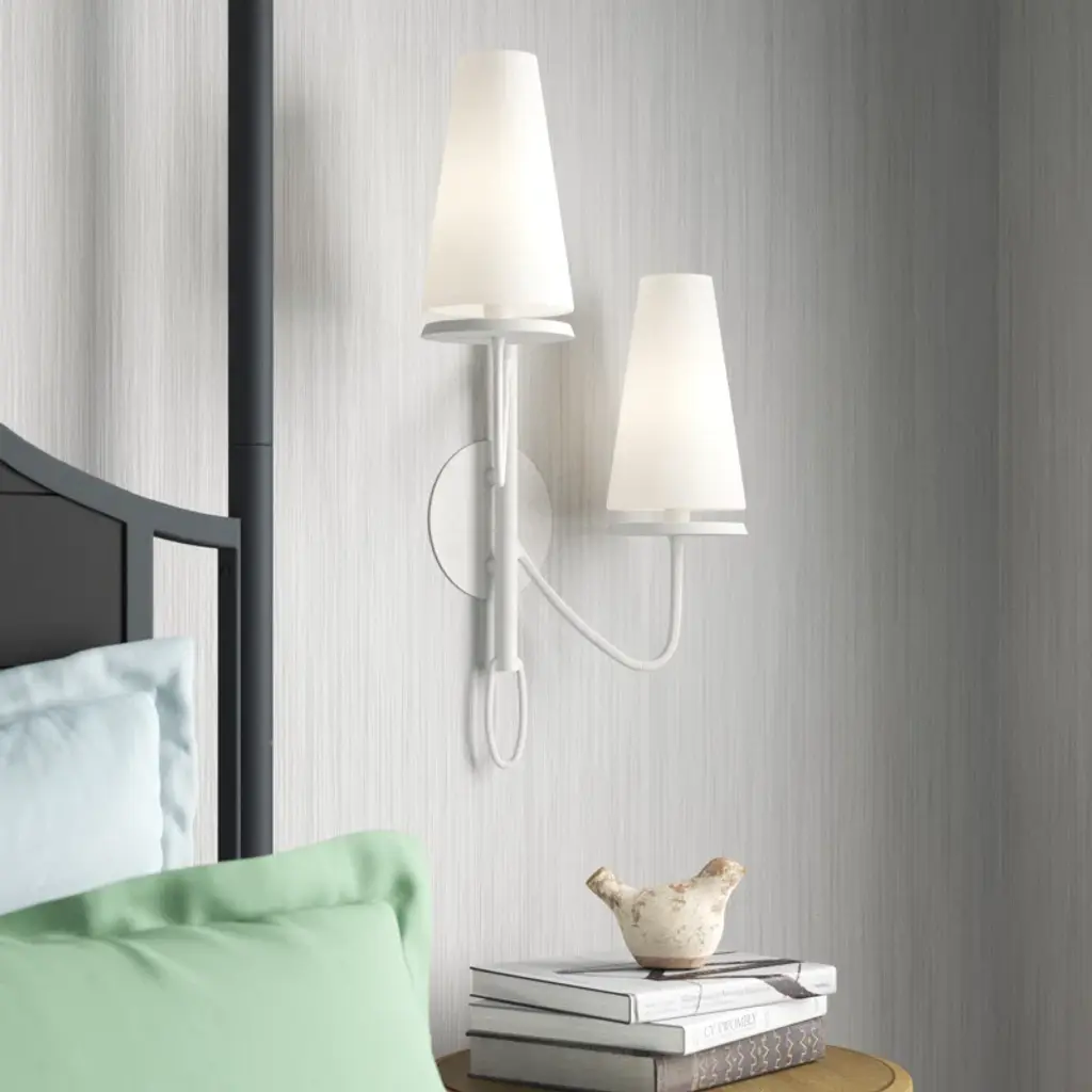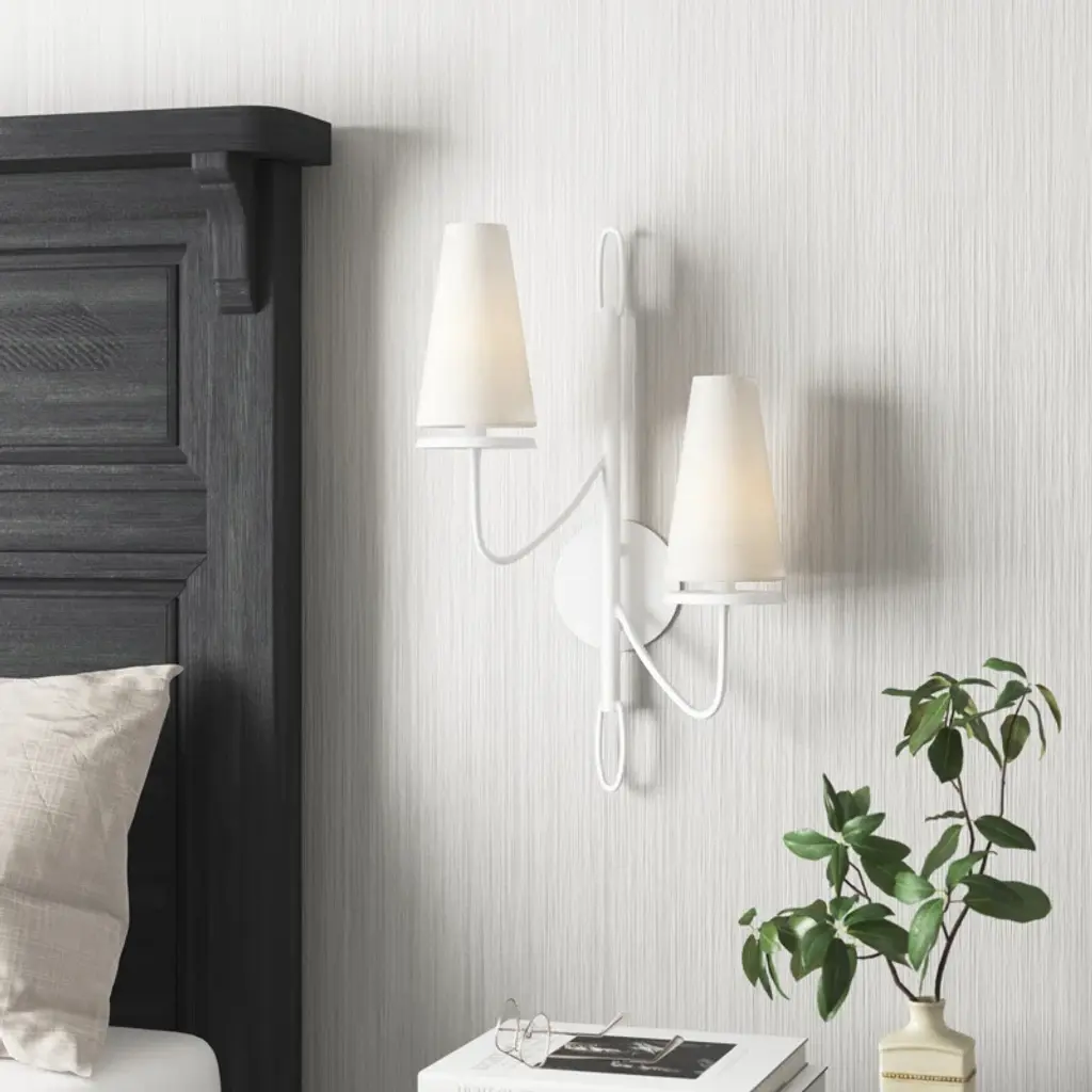 Welcome a touch of rustic elegance into your home with this two-light armed sconce. The structure of this fixture is constructed from iron, while the fixture's off-white cone shades serve as a stylish counterpoint to the subtle warmth of the metal body. Ideal for illuminating any space in your home, the sconce's dimmable feature allows you to set the ambience you desire. Plus, this sconce comes with an integrated dimmer switch for convenience and easy operation.