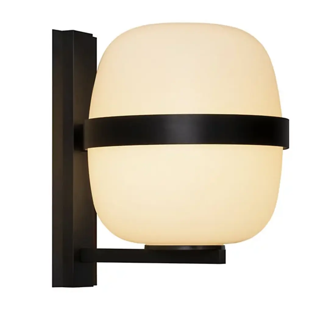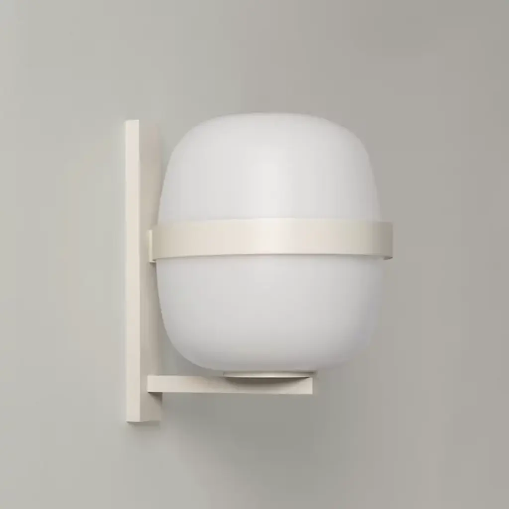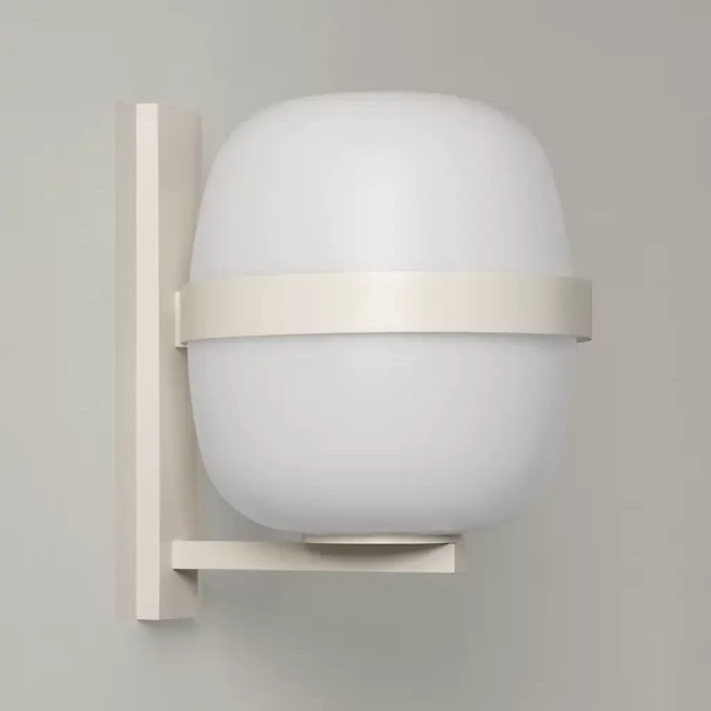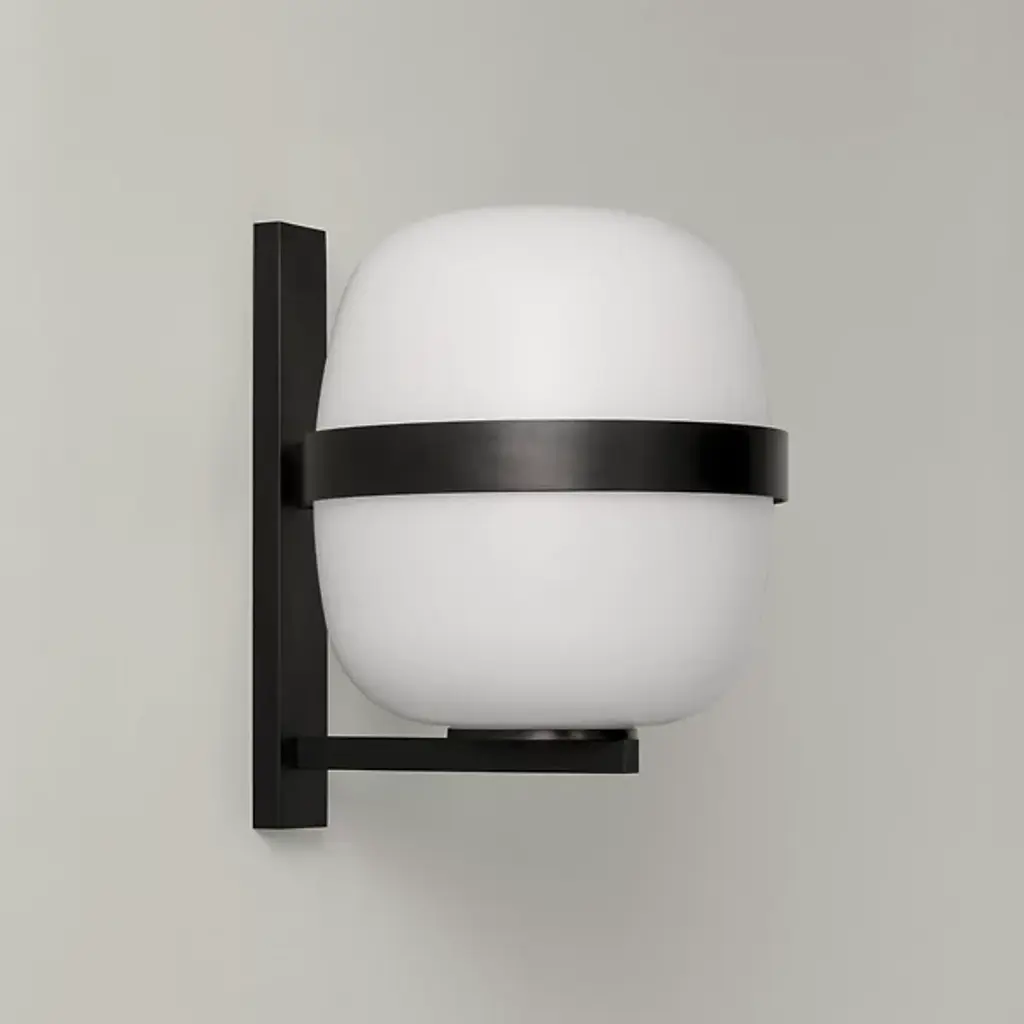 Designed in 1962, the Wally Cesta Wall Sconce from Santa & Cole is a piece of visual comfort, pairing its nurturing light with architecture-complementing lines. Spanish design icon Miguel Mila’s love for inventing things drives his work. Here, Mila synthesizes the essential components of a rattan basket and traditional lantern into a wall-mounted luminaire. The indoor or outdoor piece mounts to the wall with a brief linear backplate. A ring protrudes to wrap the opal lampshade like a rattan strand for a graphic silhouette. This charming shade minimizes glare and displays golden hues. A warm ambient light exits to glaze the surrounding walls.