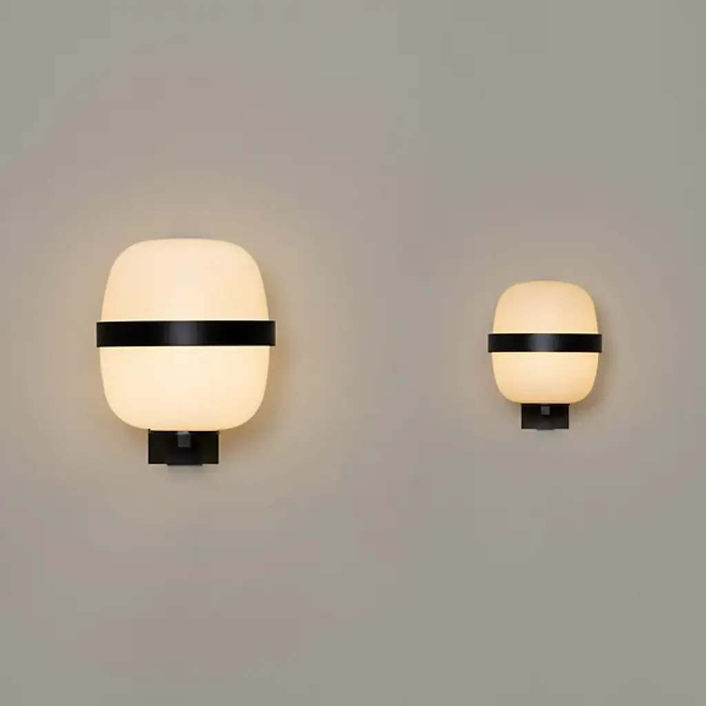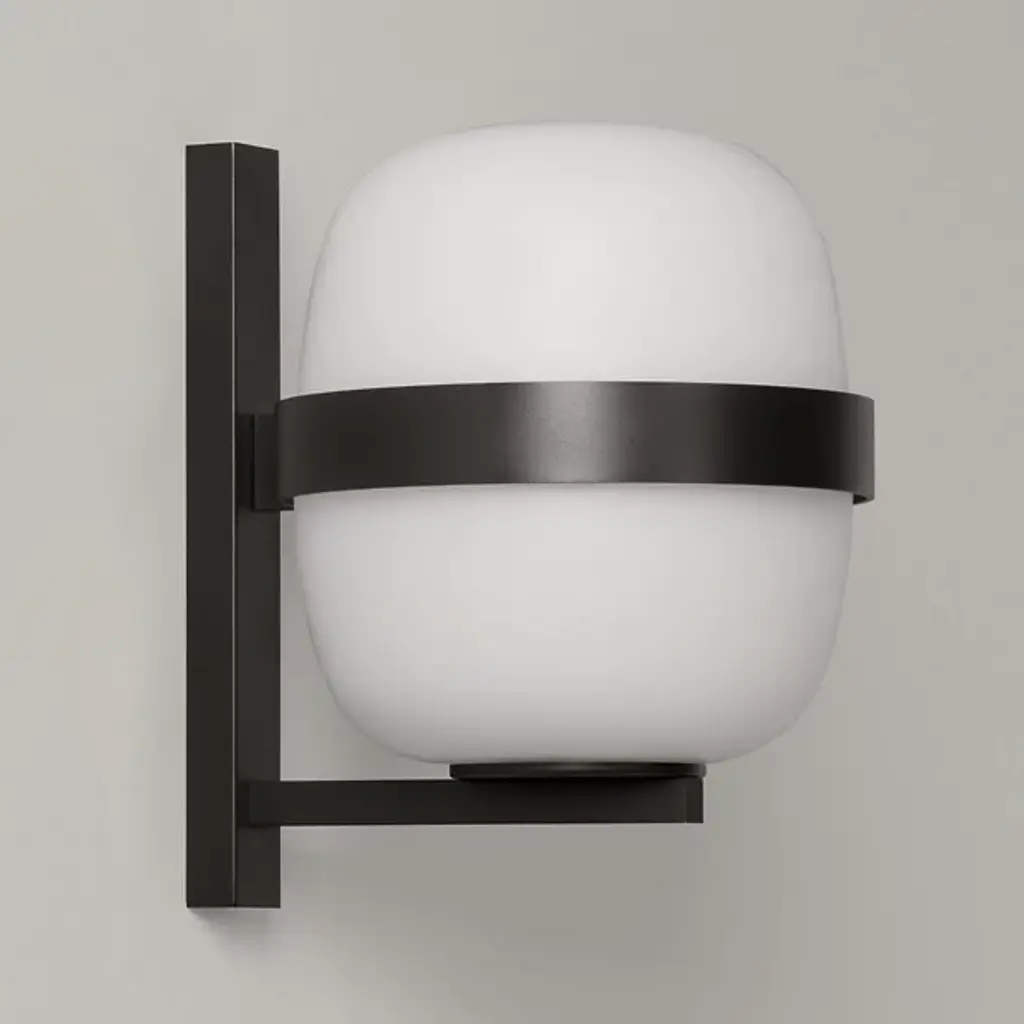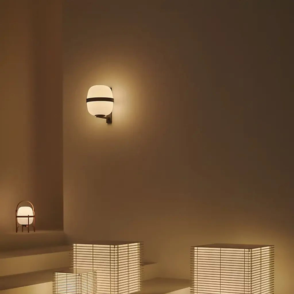 The Santa & Cole Wally Cestita Wall Sconce is exemplary of Miguel Mila’s design sensibilities in 1962, featuring the now iconic white globe shade that is belted with simple metal structural elements. Perched on a slender ledge and attached to a rectangular backplate, Wally is fully secured with a matching metal ring, separating the glass diffuser in to two distinct halves. The resulting light is comfortable to look at, fully diffusing a warm ambience around the fixture.
