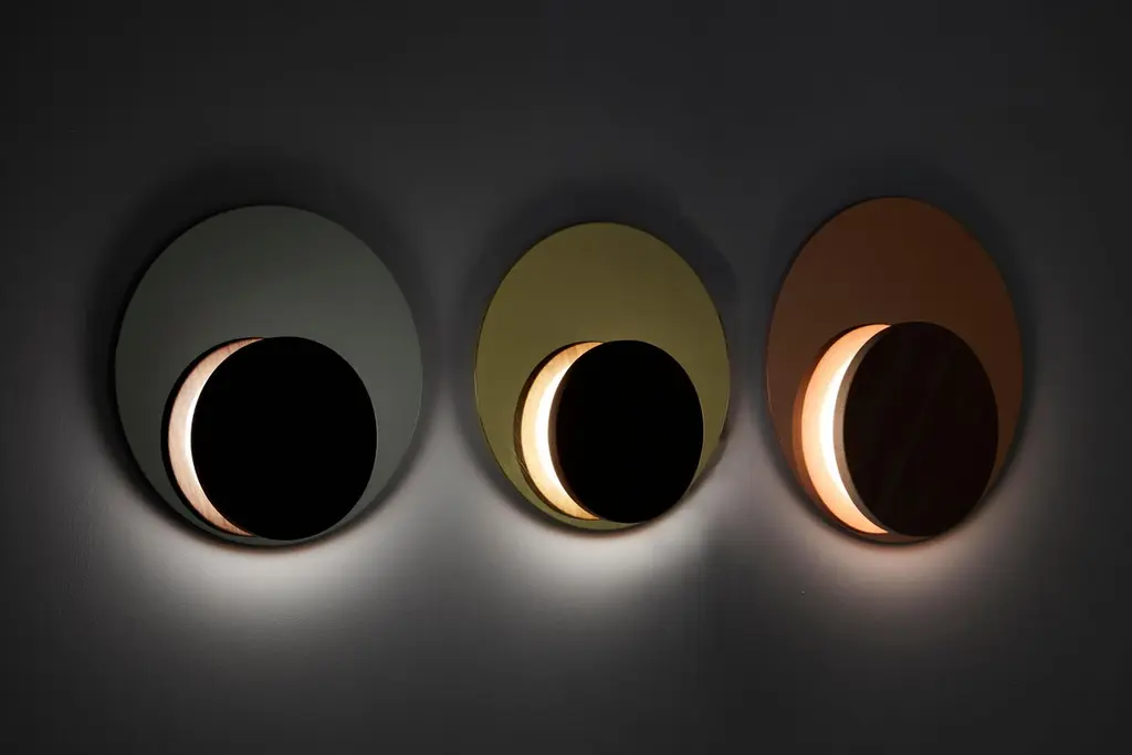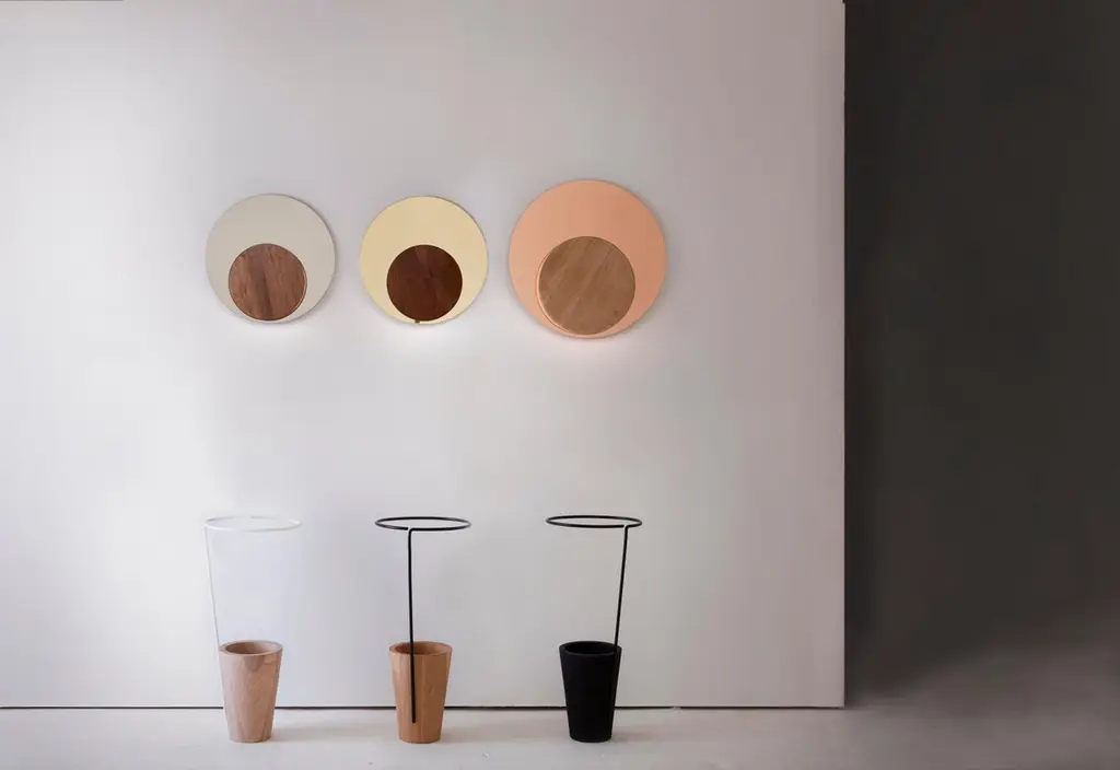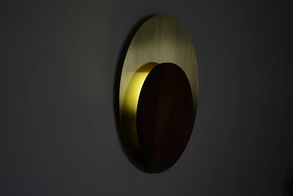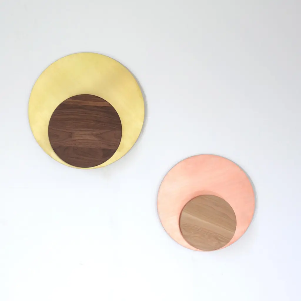 Walnut small rise sconce by Hollis & MorrisDimensions: Diameter 17.5"Materials: Solid wood, hardwax Oil. Acrylic tube, polished metal. LED lights. Also available in natural oak, black oak, white oak, and walnut. And brass, copper, or stainless steel polished metal finish.All our lamps can be wired according to each country. If sold to the USA it will be wired for the USA for instance.The fleeting glory of the sunrise channeled into a dramatic wall sconce. This unique mirror lamp transforms as natural light moves throughout the room. When lit, a warm LED glow reflects off polished brass, copper, or chrome emitting the rich atmospheric intensity of the day’s dawning hours.Based out of Toronto, Hollis & Morris takes its name from an intersection in Halifax where the company started as a series of garage explorations in design. A steadfast commitment to function with a distinctive approach to design. Hollis & Morris creates handmade furniture and lighting which carefully balances modern and honest designs. Versatile, well crafted, and timeless. Pieces by Hollis & Morris easily complement residential, commercial, and hospitality spaces. Driven by respect towards natural and honest processes, trademark integrations of solid wood and metal celebrate the inherent strengths of each material, resulting in thoughtful, quality pieces made to last with you throughout the years.
