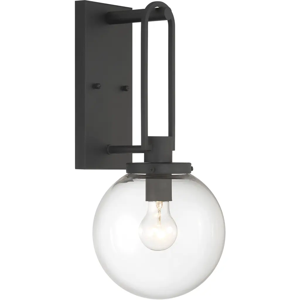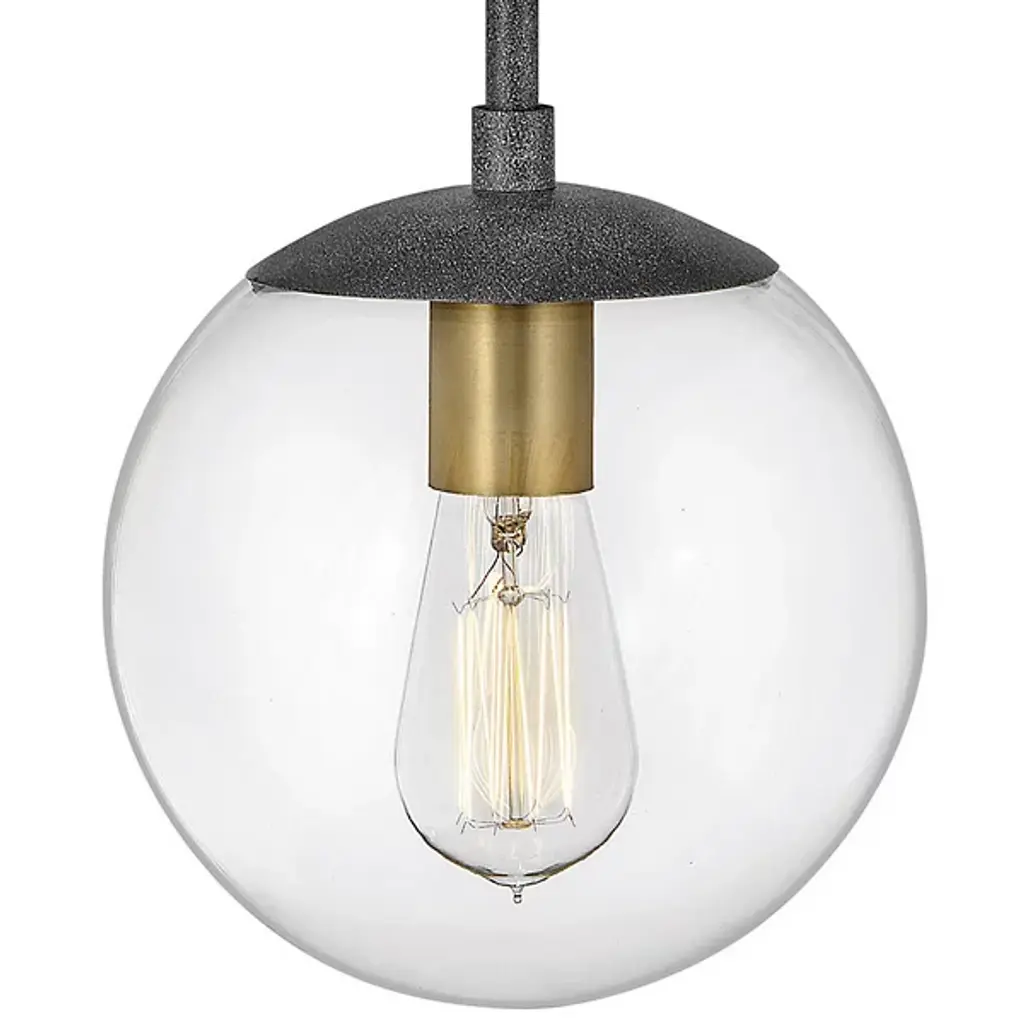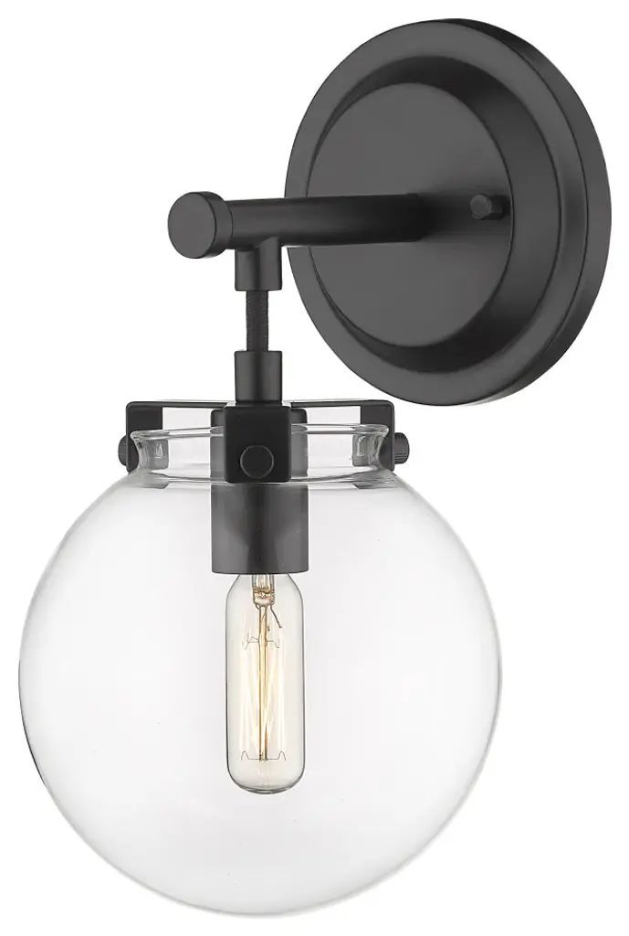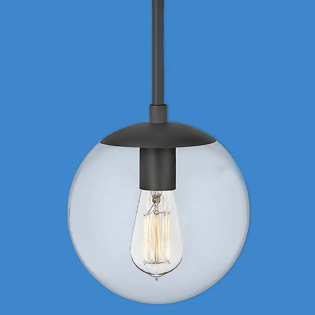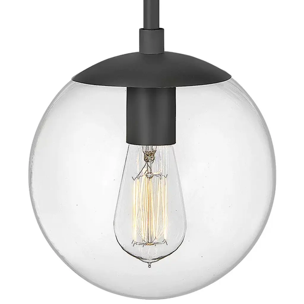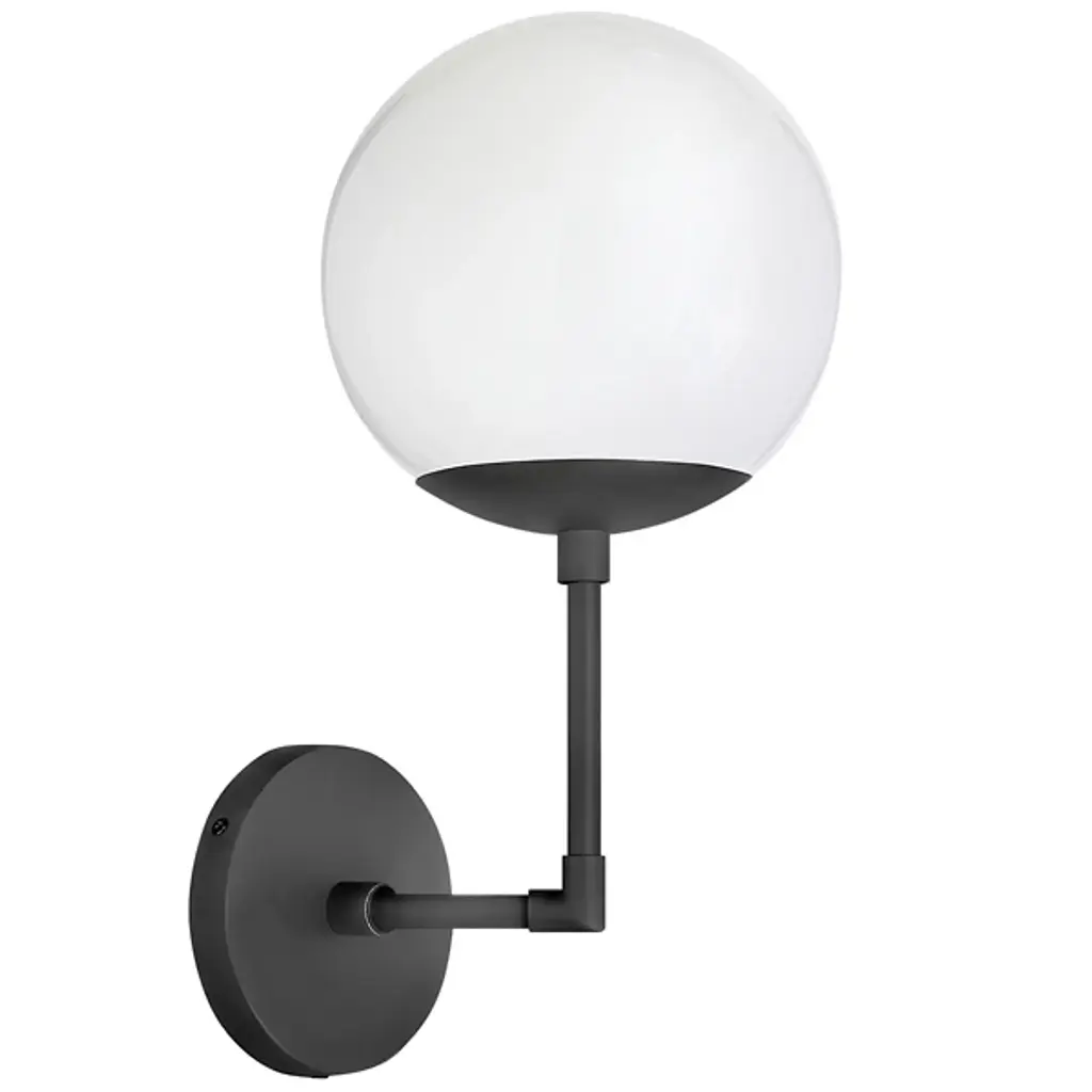 Enhance your space with the mid-century modern style of the Warby Wall Sconce from Hinkley Lighting. From its center, a circular wall plate extends a thin metal arm that sharply angles at ninety degrees and upholds a clear glass sphere at the end. Within the glass shade is a single, downward-facing bulb that spreads a bright and even layer of illumination throughout the area. Able to be mounted facing upward or down, this is a versatile piece that works well with a range of spaces.