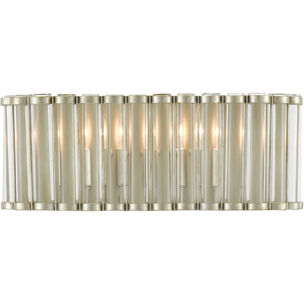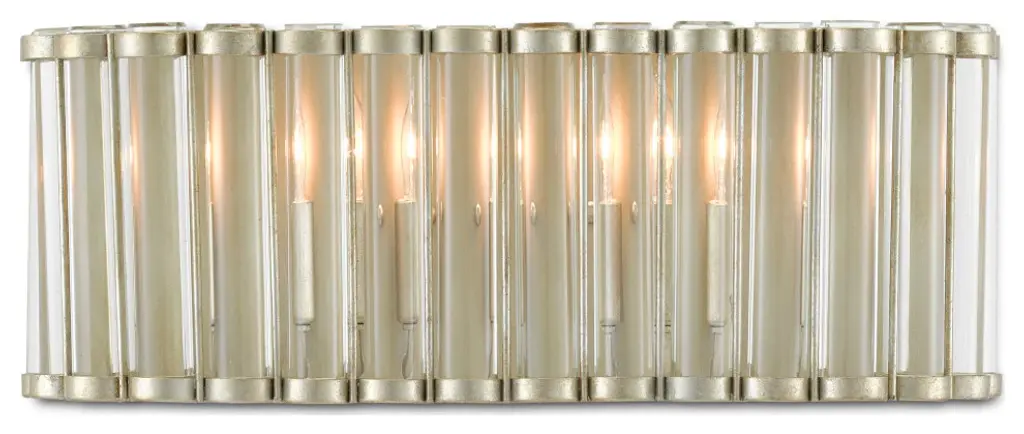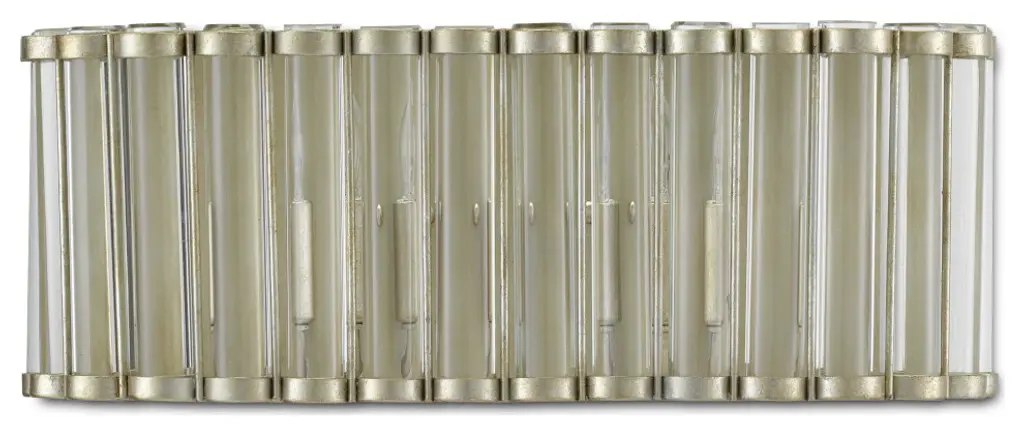 Bunny Williams has achieved a timeless profile with the Warwick Wall Sconce that diffuses light through high-grade optic crystal tubes. Ribbons of wrought iron in a contemporary silver leaf finish hold the canisters of illumination in place so that the curved form is barely discernable from the front. This silver wall sconce is certified for damp locations.Bulb Wattage: 60Bulb Type: G GlobeBulbs Included: Bulbs Not IncludedNumber of Lights: 2Socket Type: E12Voltage: 120v
