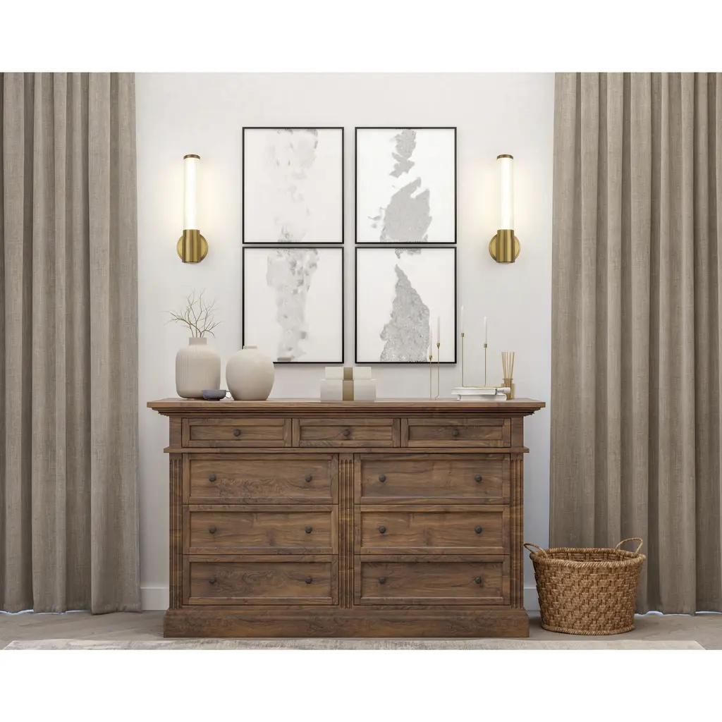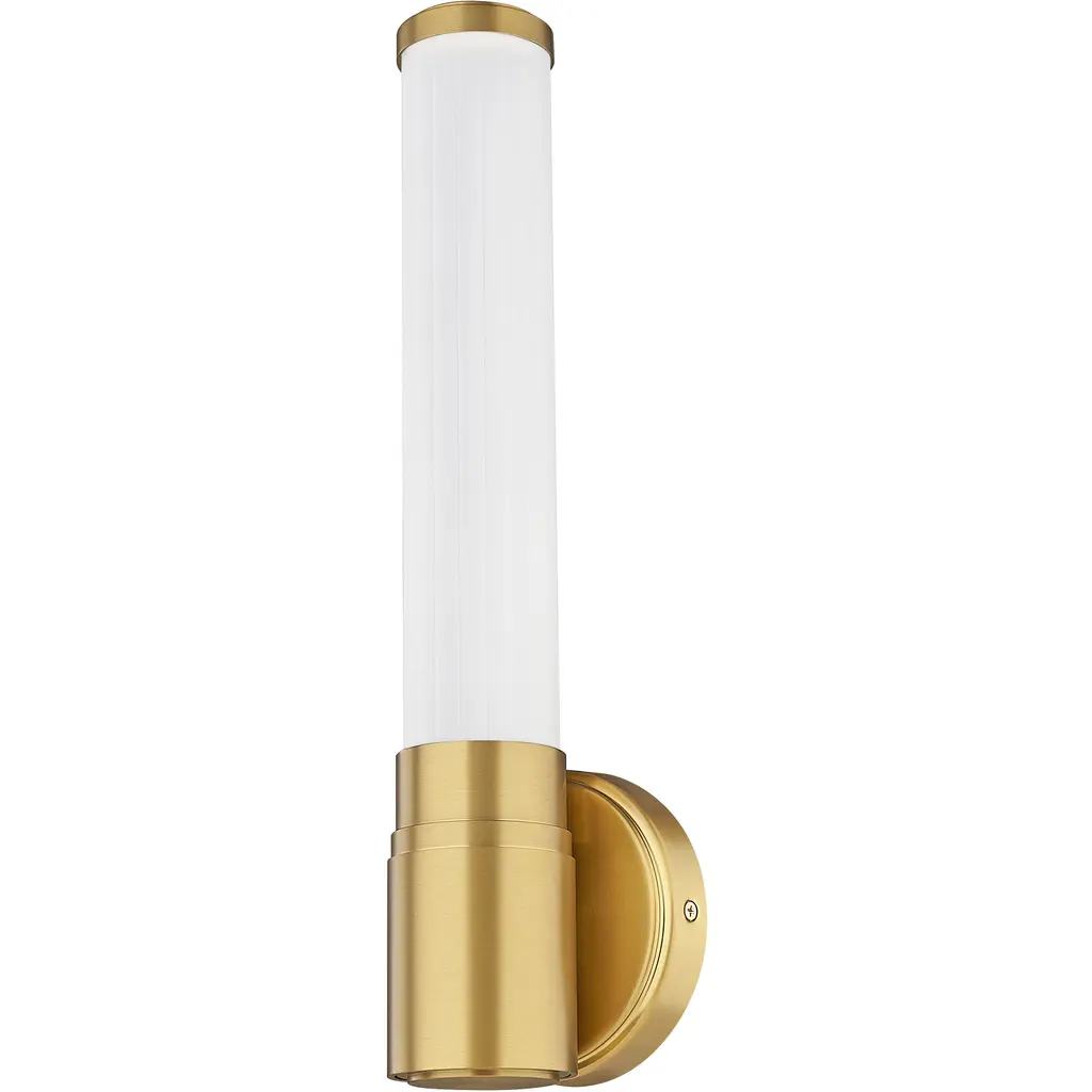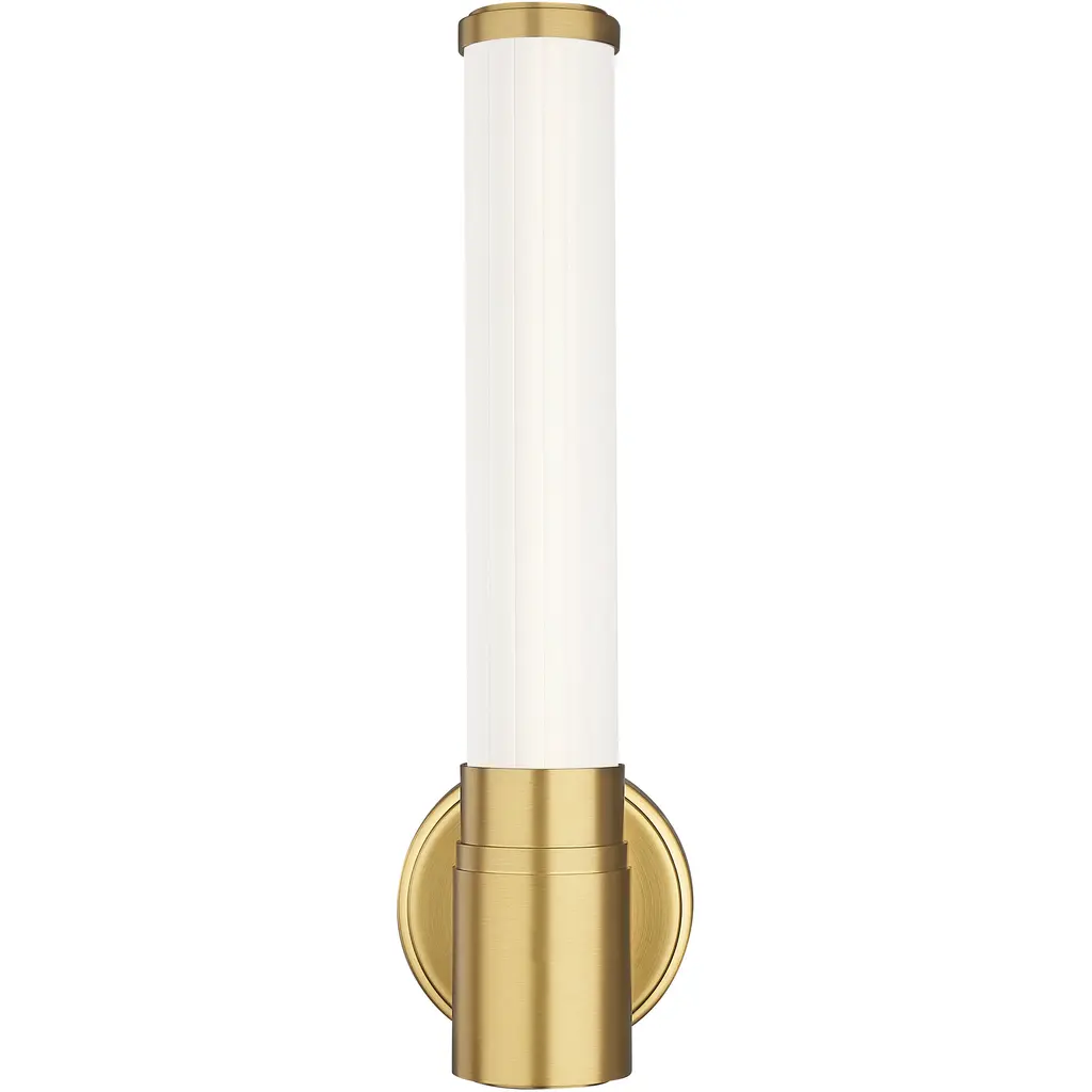 Take your lighting ensemble to stylish new heights with this modern LED wall sconce. Its modern gold finish is warm and rich, highlighting a steel frame with a stepped collar and round wall plate. Its minimalist silhouette is enhanced with a vertical cylinder of ribbed opal glass, offering the perfect complement to its dimmable, energy efficient LED light.