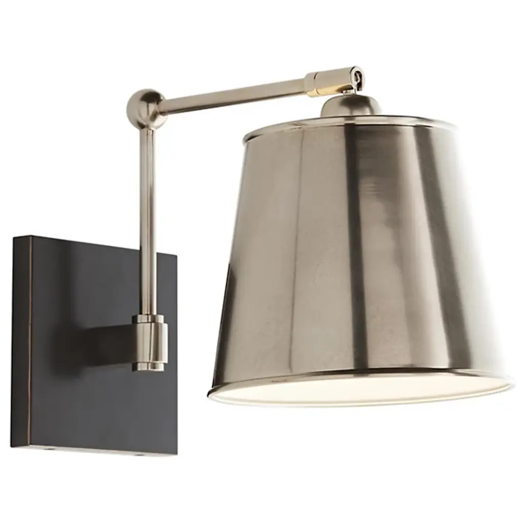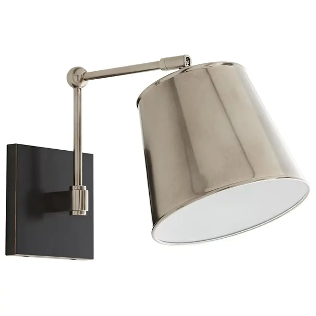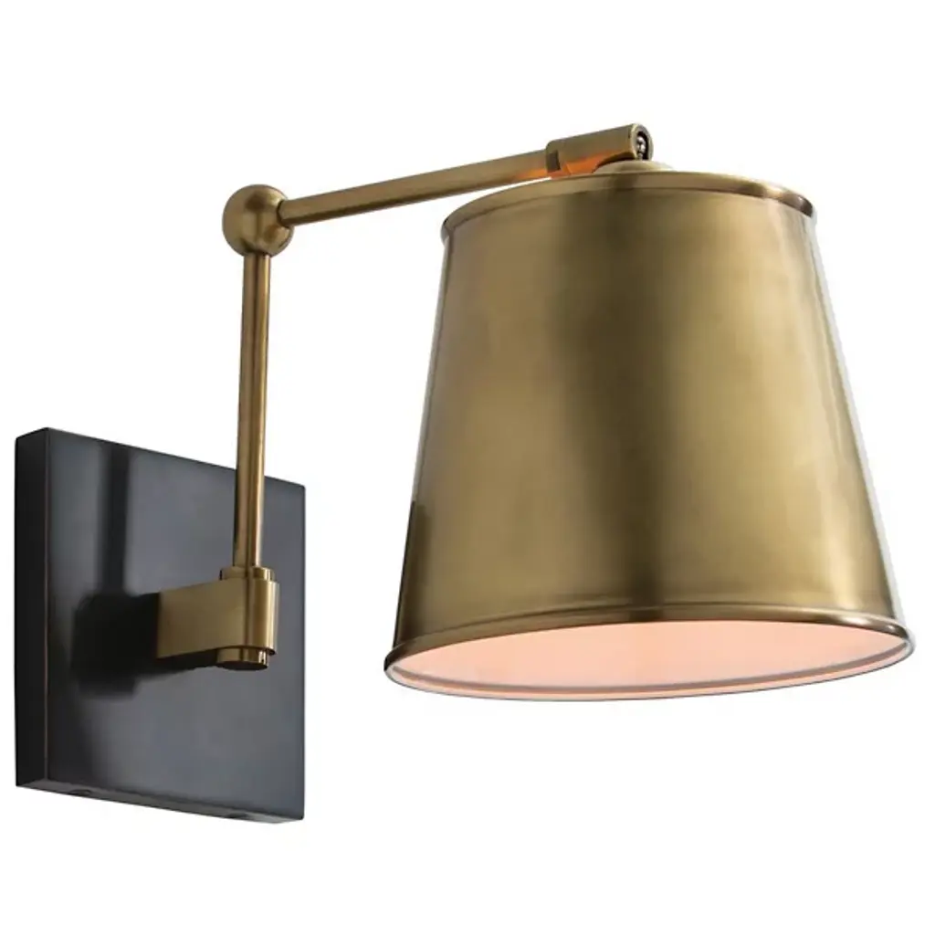The Arteriors Watson Wall Sconce showcases modern sensibility and mid century modern styling blended together. Simple yet effective, the dark backplate contrasts against the rich finish throughout the rest of the piece. The all metal shade is adjustable, perfect for spotlighting your favorite art piece or creating a cozy reading corner in your living room.