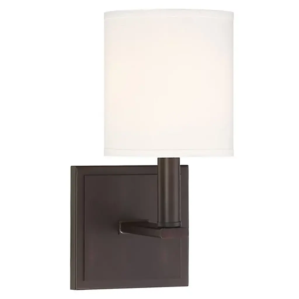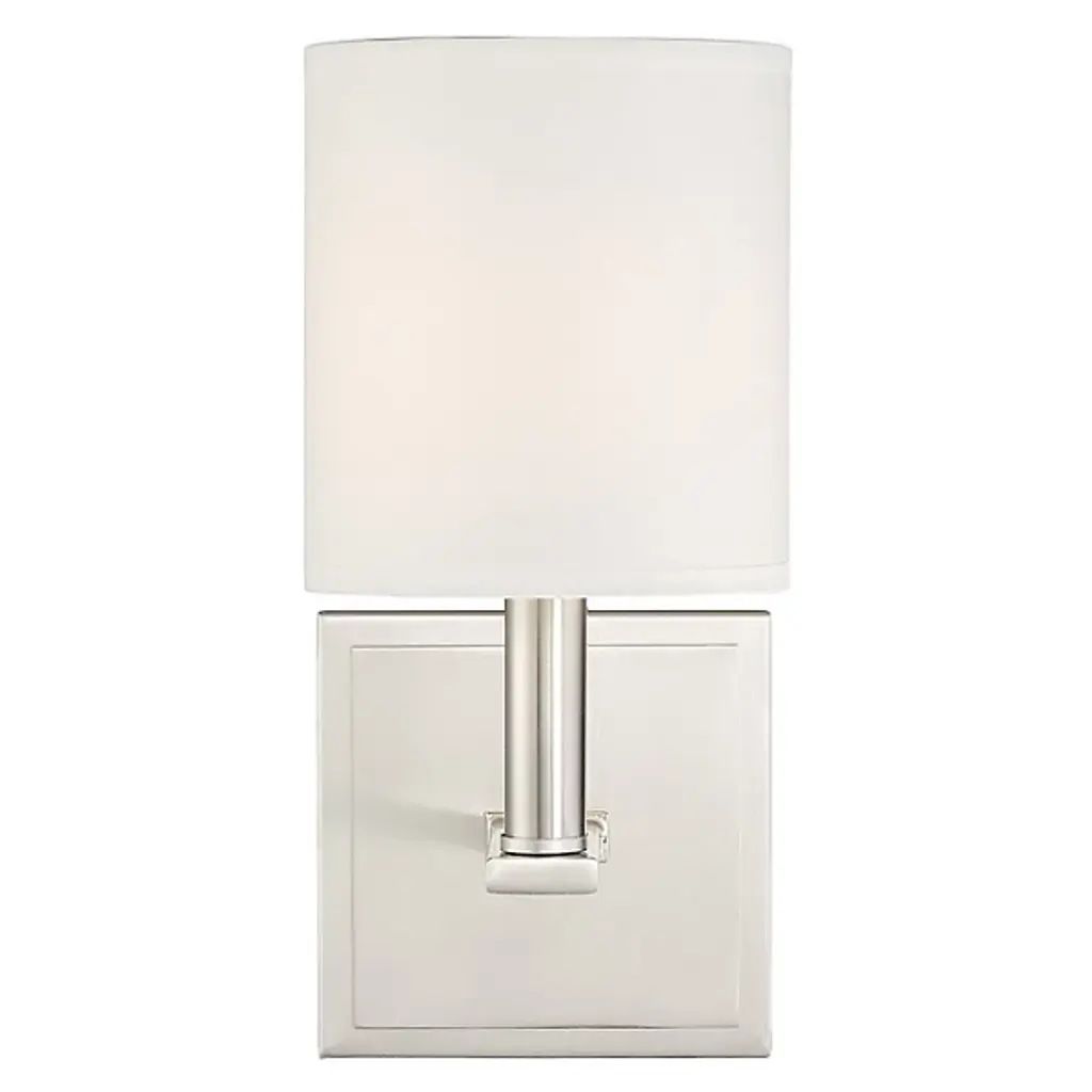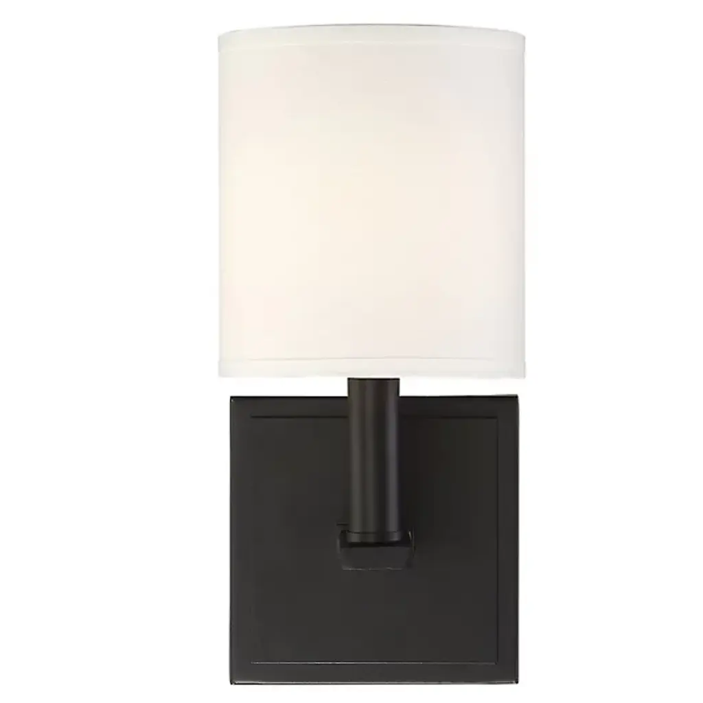 Dot your home with the upstanding elegance of the Waverly Wall Sconce from Savoy House. Entryways, hallways, and living rooms are the perfect candidates for its sumptuous illumination. A fabric shade softens the light from an incandescent bulb into a glare-free glow through a timeless drum form. It sits above a candle-style lamp holder that stands neatly above a metal ledge. A securing metal backplate proclaims an unbridled sophistication across your wall through a refined design of concentric square shapes.