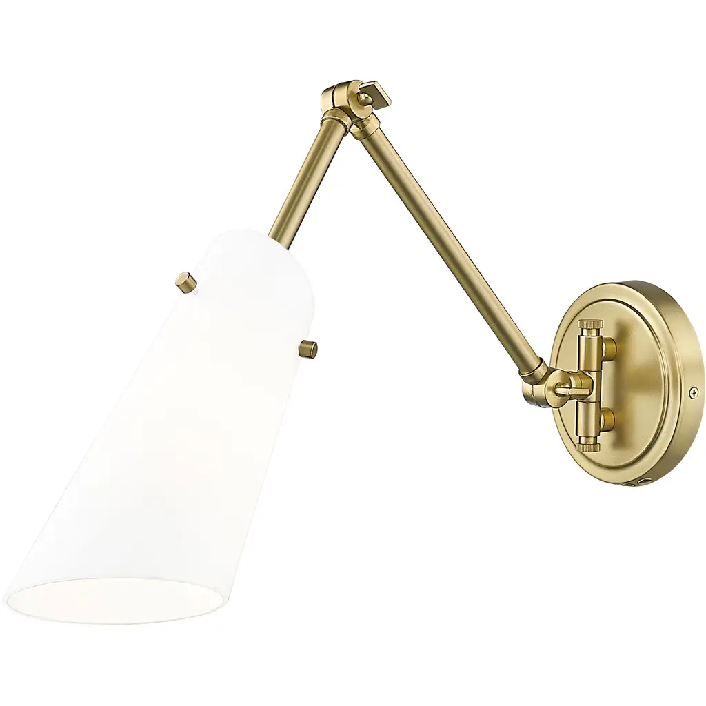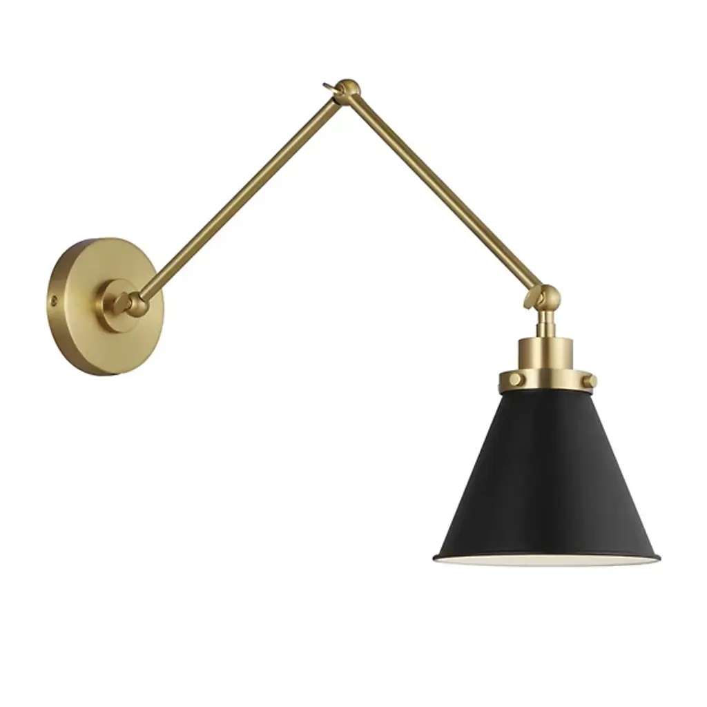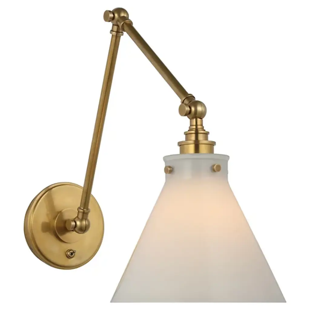 Introduce a clean and elegant silhouette to the walls of your modern home with the Wellfleet Double Arm Adjustable Wall Sconce from Chapman & Meyers. Smooth metal found throughout contrasts beautifully with the matte white shade. A round wallplate extends a long and thin arm that adjusts with ease at three distinct joints. The conical shade houses a single bulb that sends out a crisp and even layer of light to a focused part of the room.