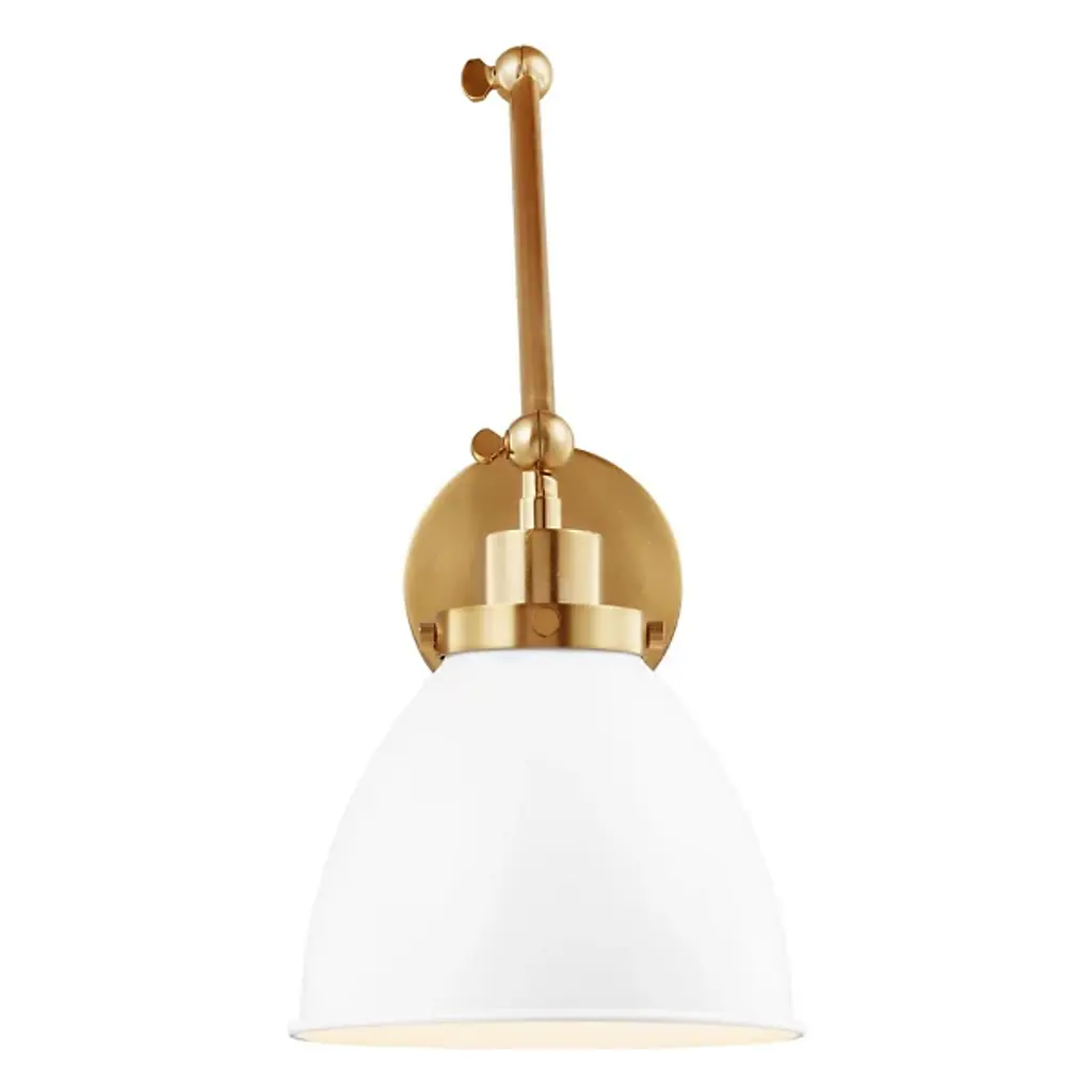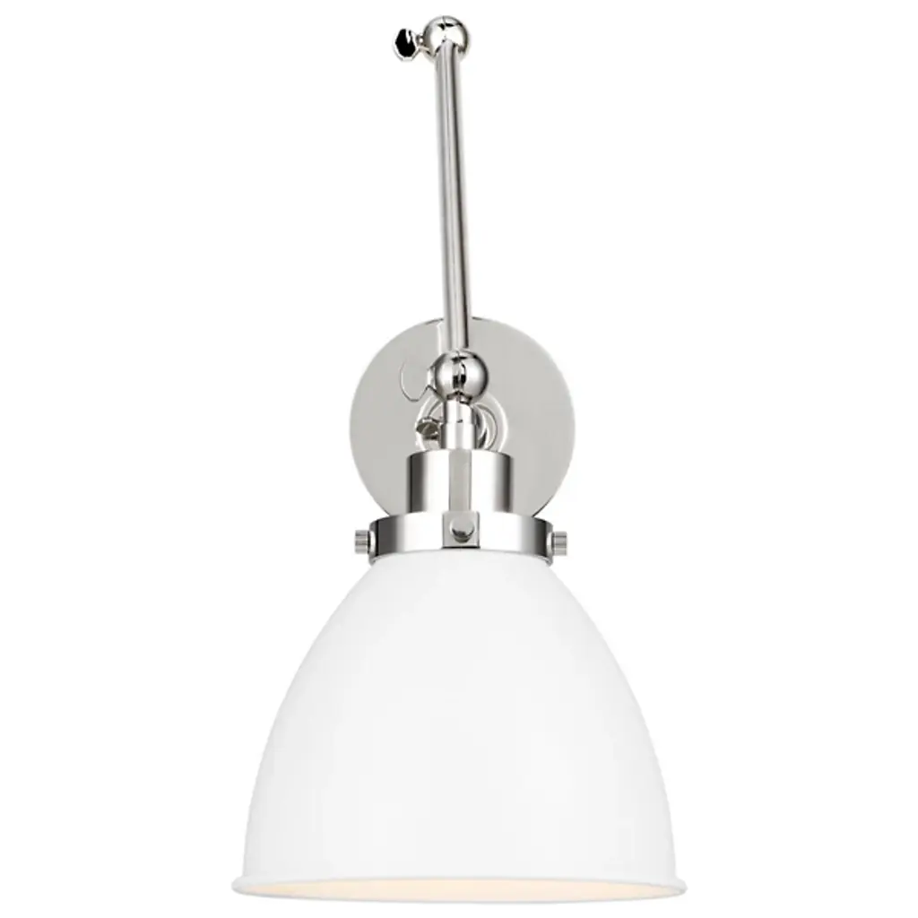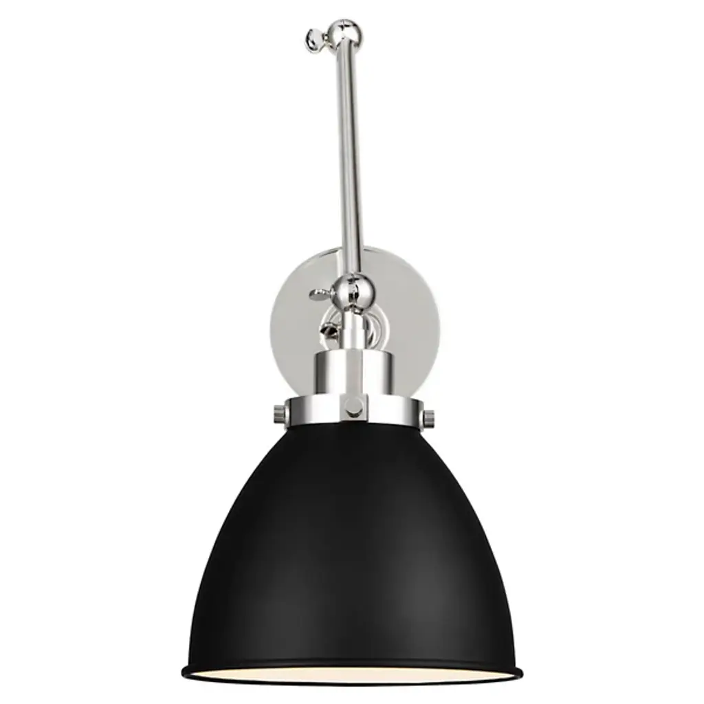 Provide a generous splash of tailored illumination to your intimate or spacious rooms with the Wellfleet Double Arm Dome Wall Sconce from Visual Comfort Studio, formerly known as Chapman & Myers, It's a modern charmer displaying vintage flair. A sleek steel wall plate mounts the piece with a low profile. Shooting out, two short arms produce joints for great adjustability. The arms support a single lamp contained inside a dome shade. The light blazes out from the curves of the shade, delivering a purposeful light best used for tasks, wall washing, or ambiance.