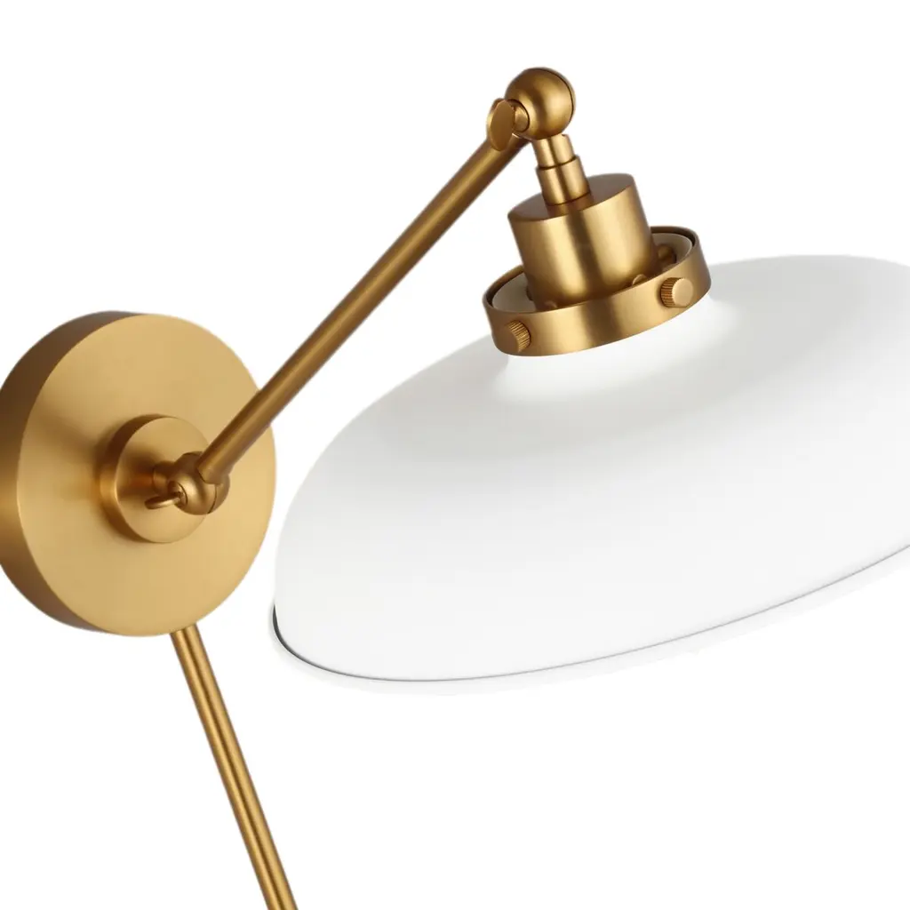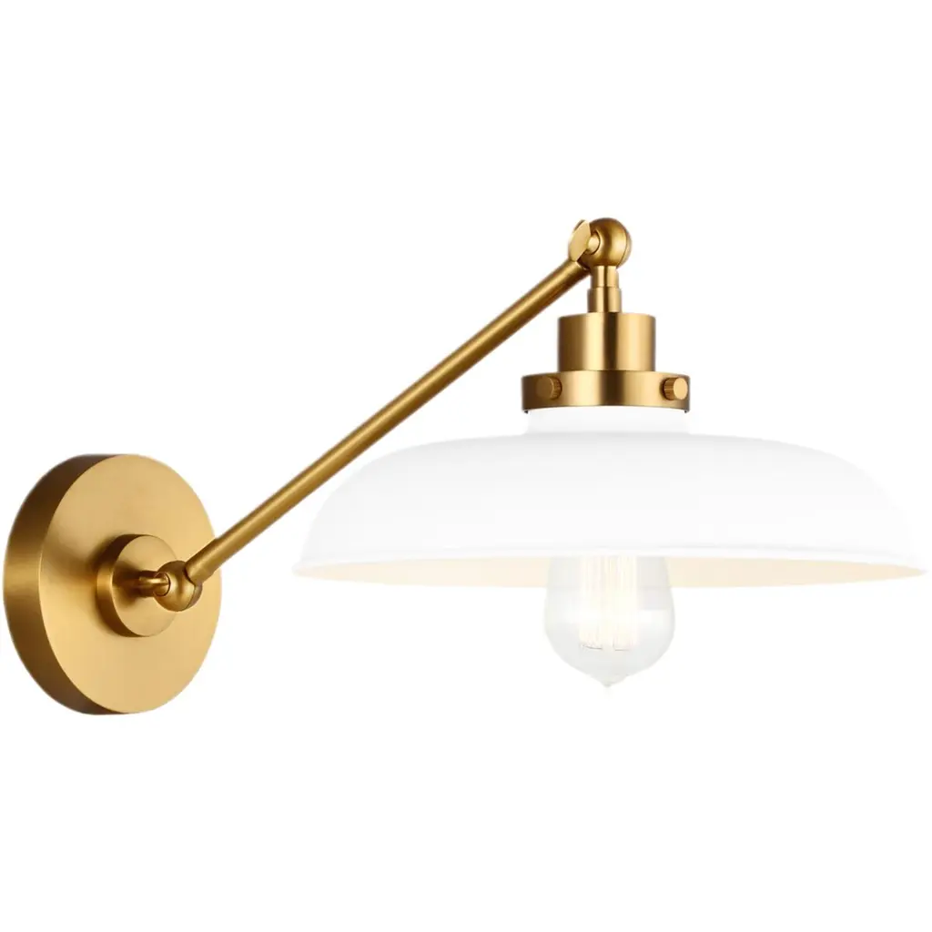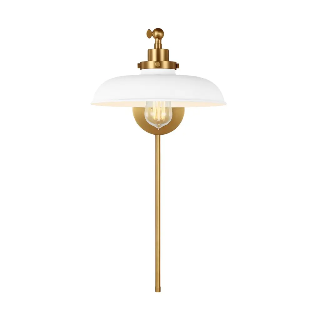 The Wellfleet Single Arm Wide Wall Sconce features a simple profile inspired by vintage utility lights. Its flattened dome shade resembles classic farmhouse lamps, while the sleek frame in a contrasting finish adds a clean, modern touch. Place this sconce next to a work area or over a bedside nightstand. It can be hard-wired, or a plug-in (on/off cord switch and cord cover included).