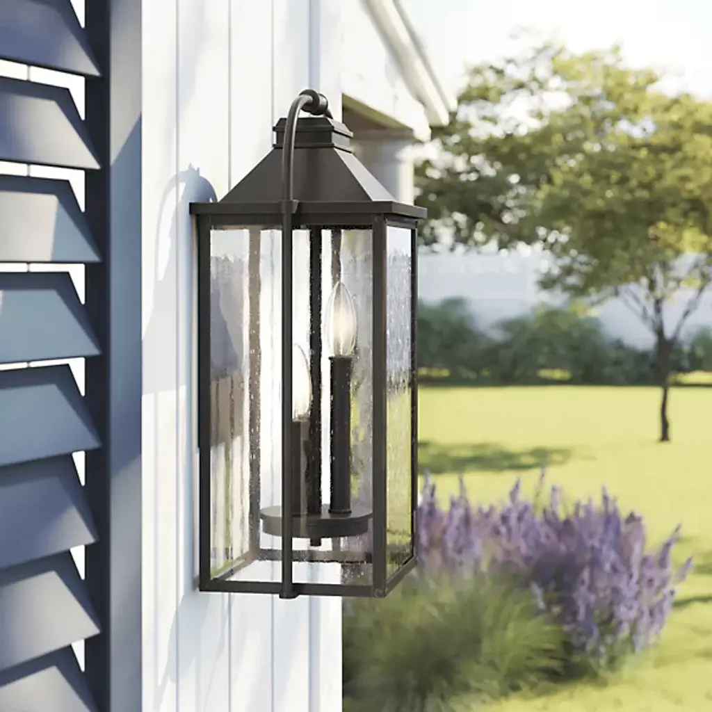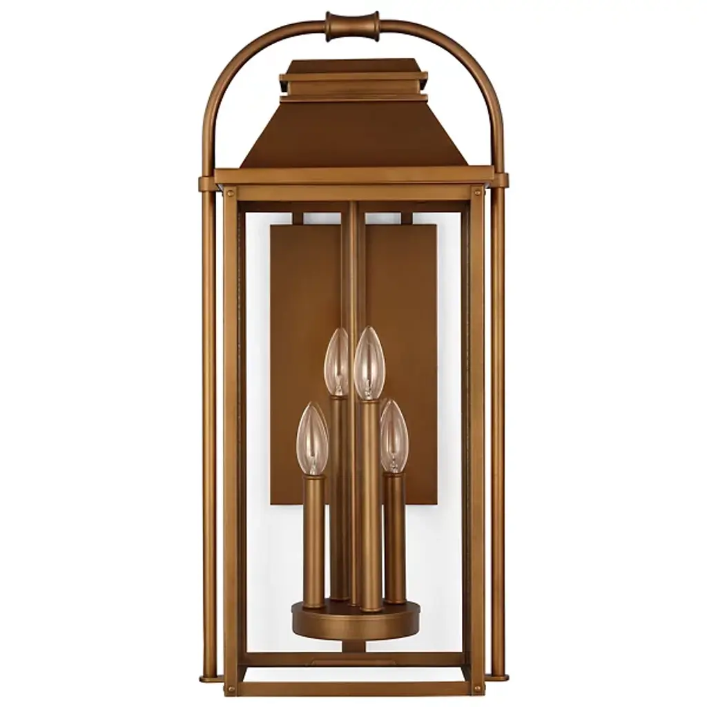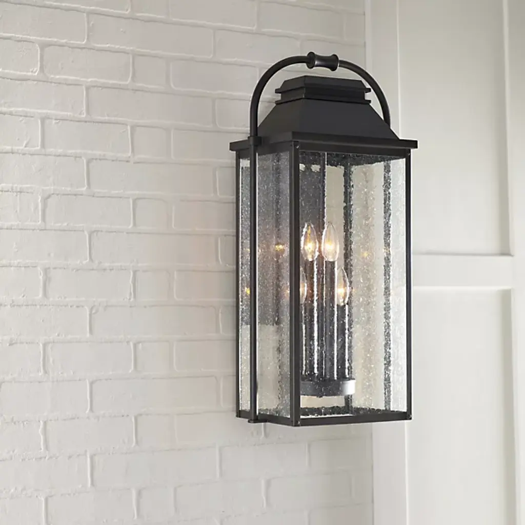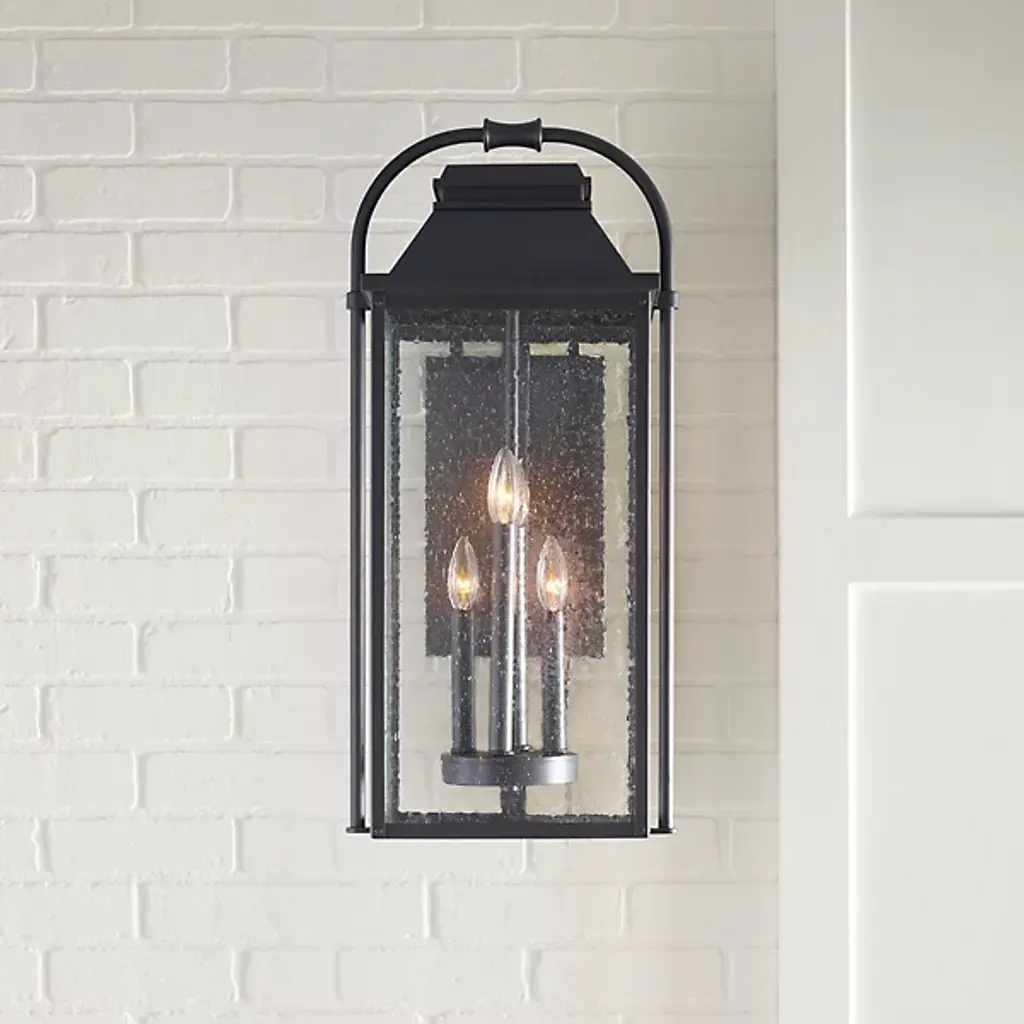 A traditional luminaire with a nautical flair. The Welllsworth Outdoor Wall Sconce by Visual Comfort Studio, formerly known as Sean Lavin, features a geometrical body composed of cast aluminum frame and clear seeded glass panels on all the sides. A crown at the top with elegant detailing is complemented with a handle-like accent, giving this wall sconce a traditional lantern look. Four candle structures housed within this shade produce a warm, diffused glow that beautifully brightens outdoor spaces like entryways, porches, balconies or backyards.