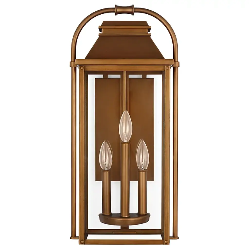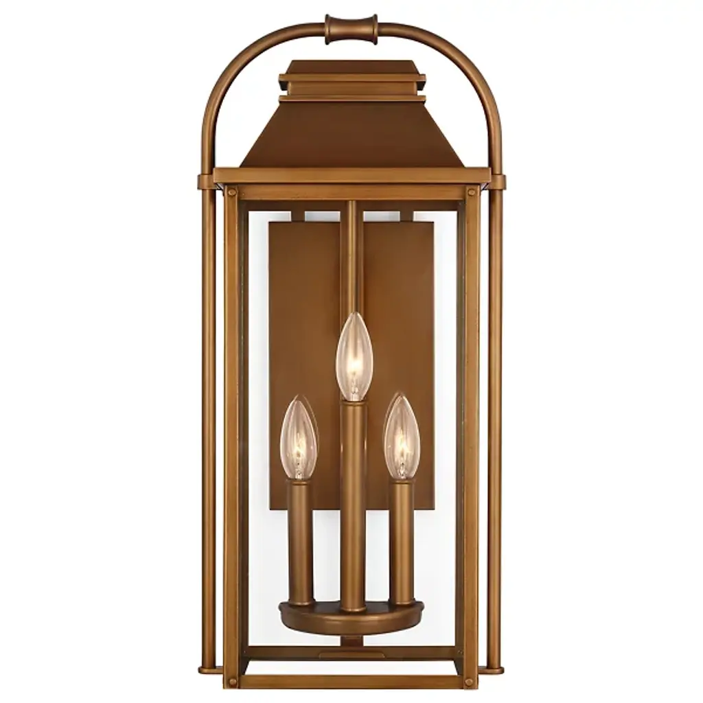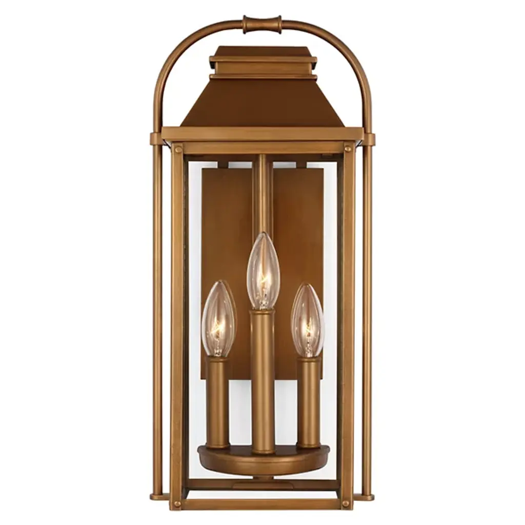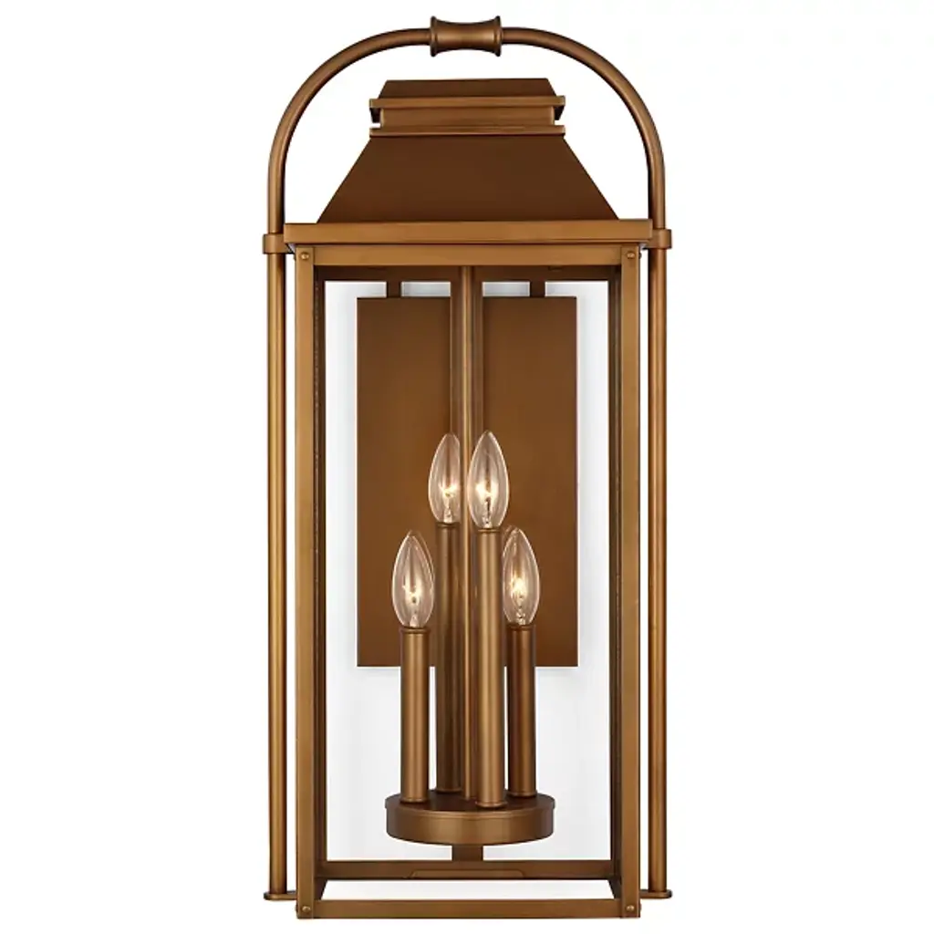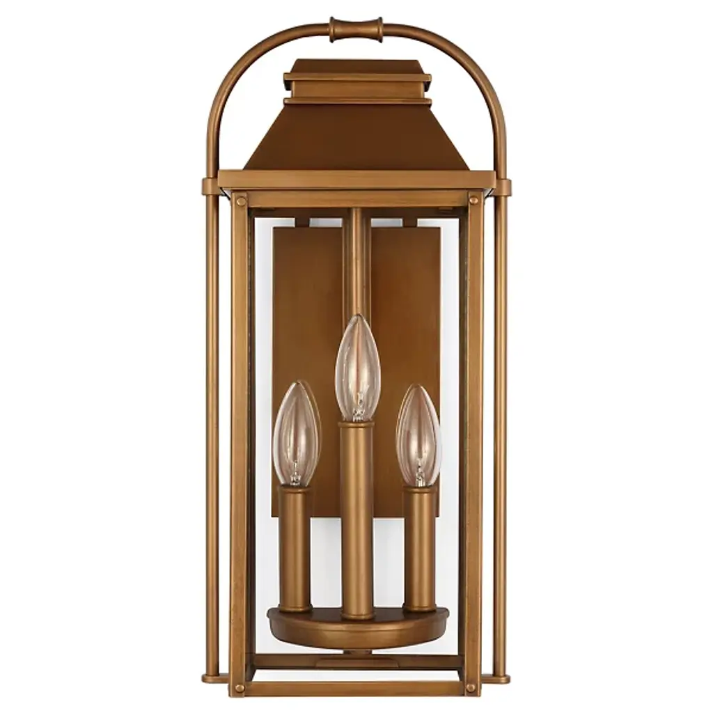 A traditional luminaire with a nautical flair. The Welllsworth Outdoor Wall Sconce by Visual Comfort Studio, formerly known as Sean Lavin, features a geometrical body composed of cast aluminum frame and clear seeded glass panels on all the sides. A crown at the top with elegant detailing is complemented with a handle-like accent, giving this wall sconce a traditional lantern look. Four candle structures housed within this shade produce a warm, diffused glow that beautifully brightens outdoor spaces like entryways, porches, balconies or backyards.