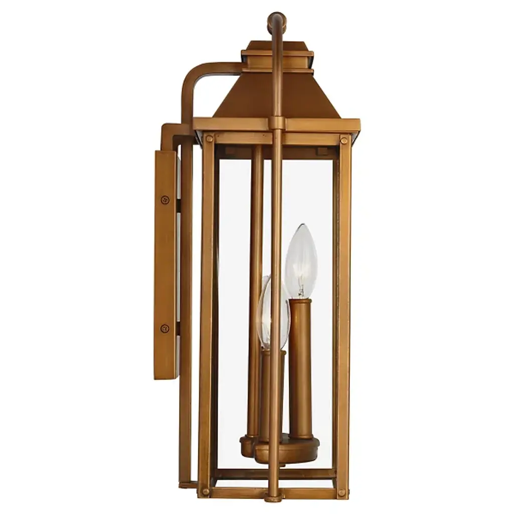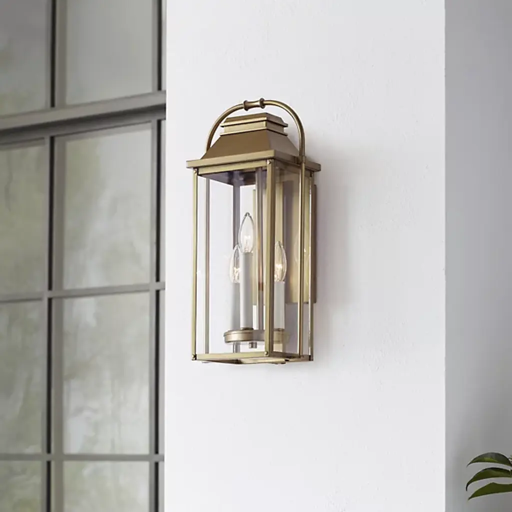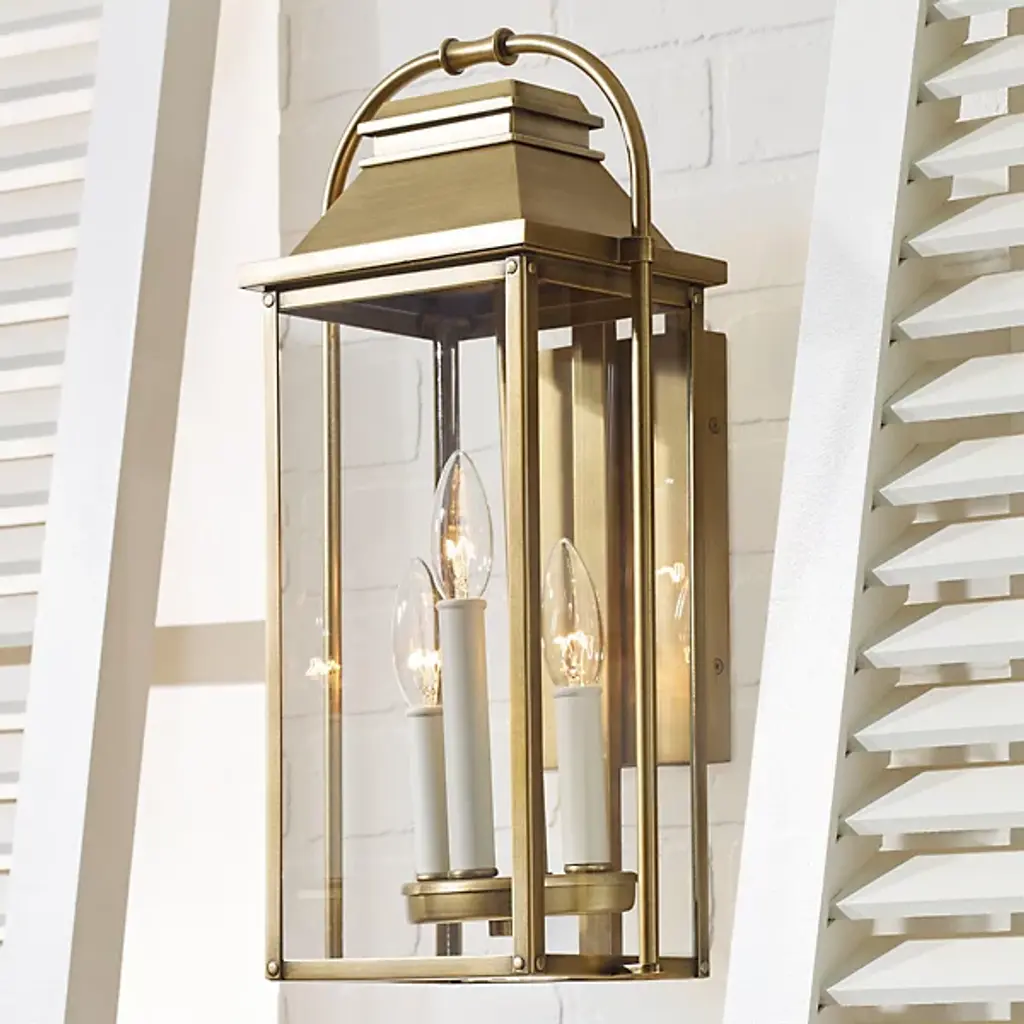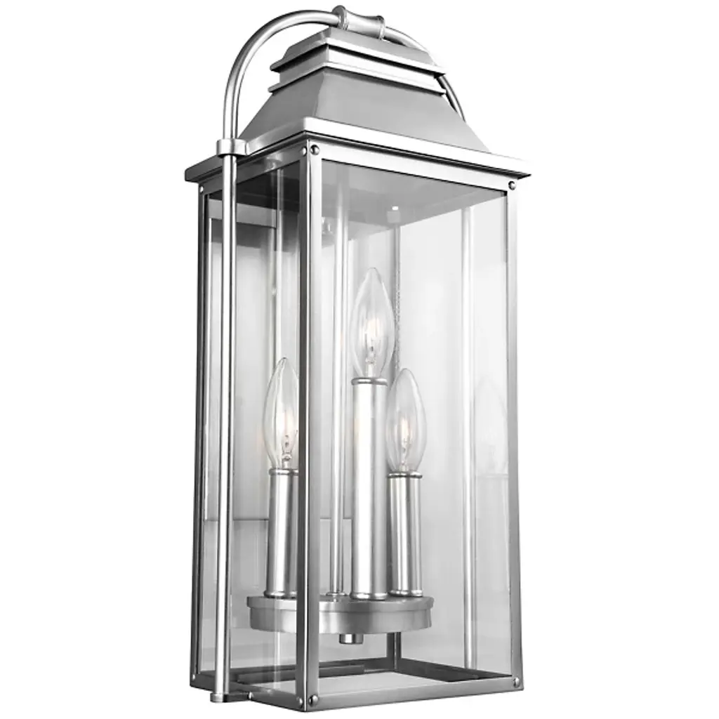 A traditional luminaire with a nautical flair. The Welllsworth Outdoor Wall Sconce by Visual Comfort Studio, formerly known as Sean Lavin, features a geometrical body composed of cast aluminum frame and clear seeded glass panels on all the sides. A crown at the top with elegant detailing is complemented with a handle-like accent, giving this wall sconce a traditional lantern look. Four candle structures housed within this shade produce a warm, diffused glow that beautifully brightens outdoor spaces like entryways, porches, balconies or backyards.