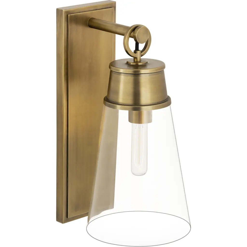 Infuse warmth and sophistication to a modern space with the Wentworth wall sconce, a superb choice for updating contemporary spaces with chic sparkle. Its conical shade made of clear glass suspends with a charming loop ring and mounts to a sleek, slender wall plate, all metal elements reflecting a rich rubbed brass finish. This wall light borrows a page from romantic nautical aesthetics.