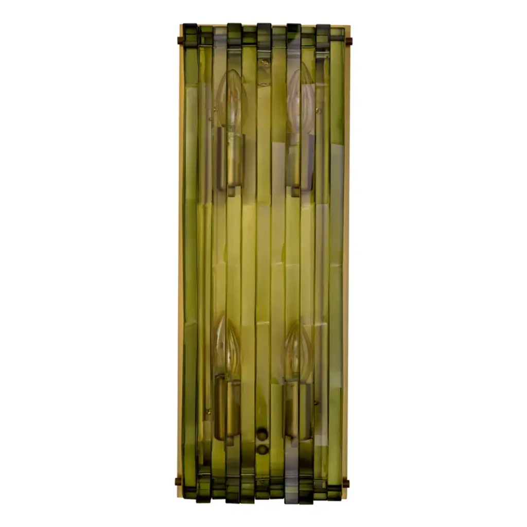 Thick plates of green glass create a striking relief pattern with geometric lines, giving the large Nuvola wall lamp an architectural appearance. Mounted on an antique brass fixture, the glass refracts the light, thus creating a wonderful play of light in your interior.