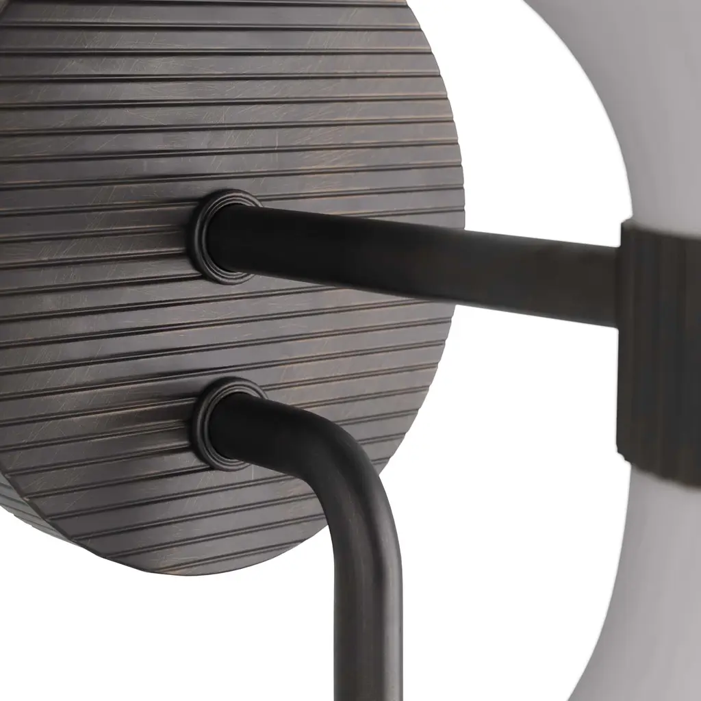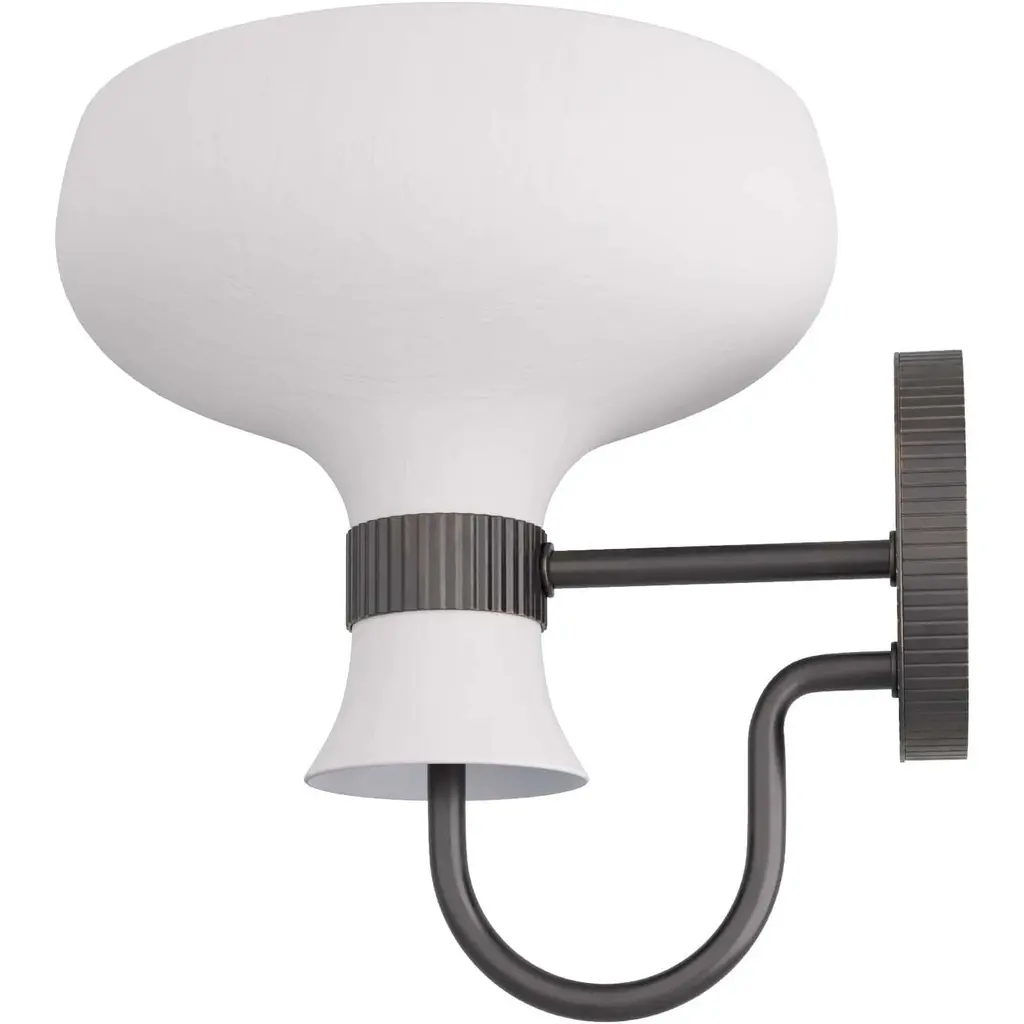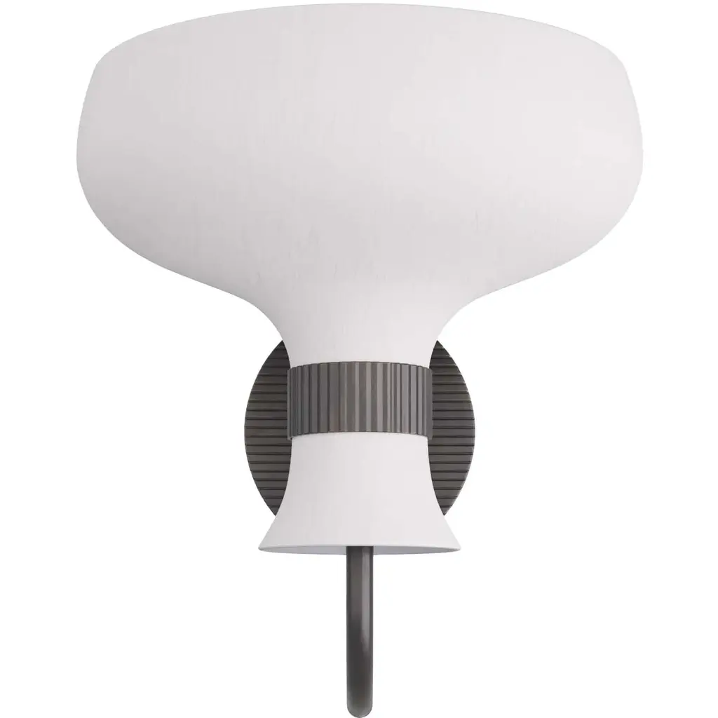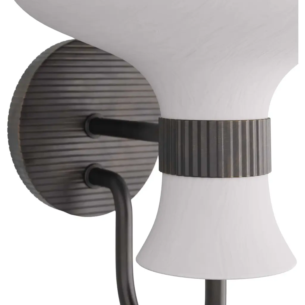 A high-contrast mix of materials dresses up the westcliff sconce and lends modern elegance to its surroundings. The sleek, midcentury-inspired torchiere is created in a framework of blackened iron, with ribbed clamp detailing and a round backplate. Graceful, tulip-shaped shades in white gesso direct light upwards. Finish will vary. Damp-rated, although limited covered outdoor conditions may affect finish.