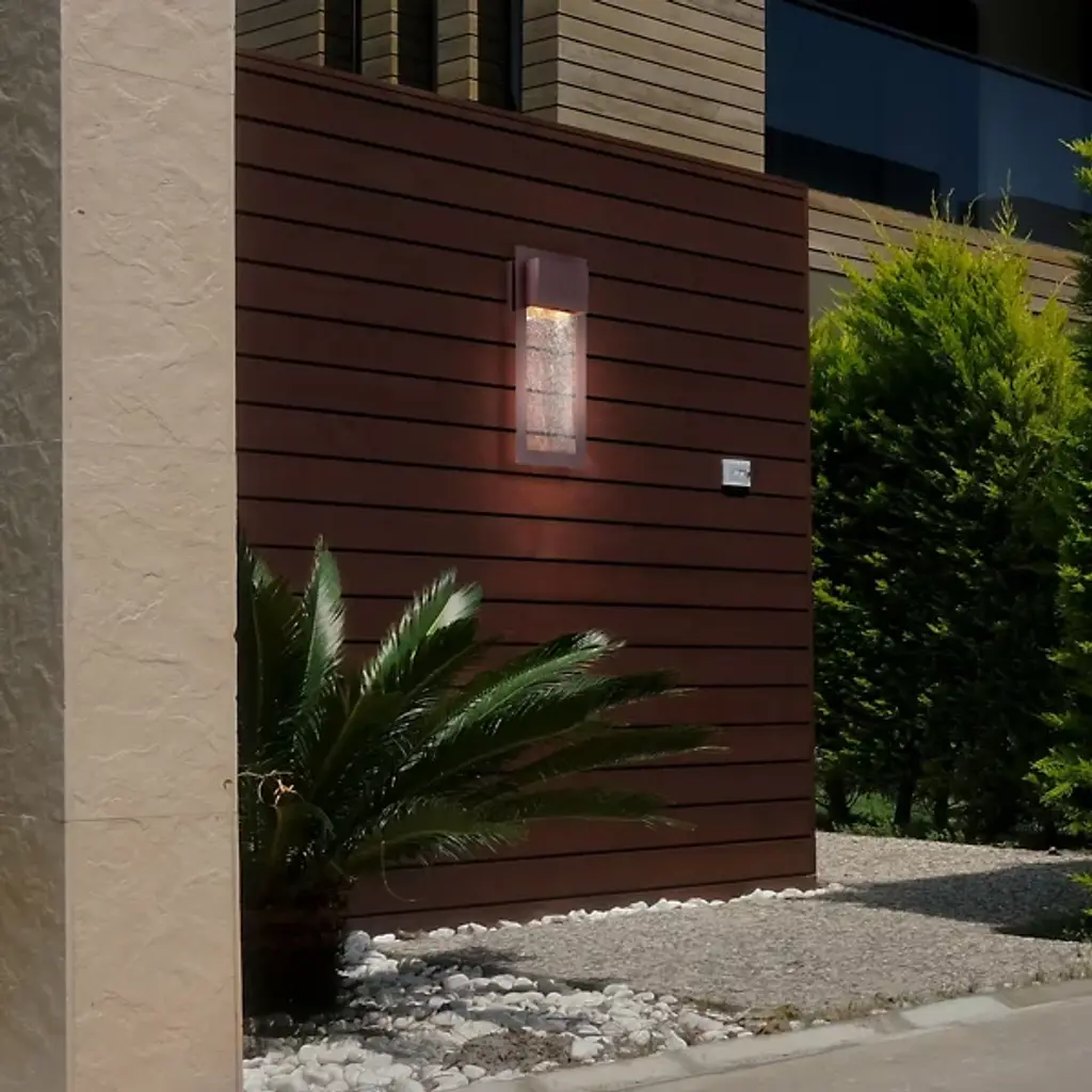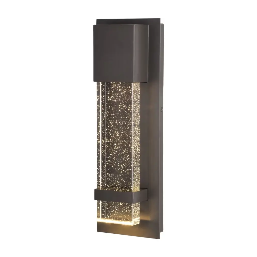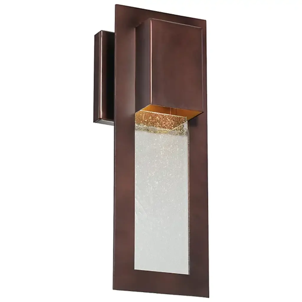 Architectural, minimal style. The The Great Outdoors: Minka-Lavery Westgate Outdoor Wall Sconce features a clean, modern design for transitional outdoor spaces. Warmly finished in Alder Bronze, the rectangular frame is clean and angular, and conceals the light source in the top of the fixture. Clear Seeded glass reflects the light over its bubbly surface, adding texture and a touch of coziness.