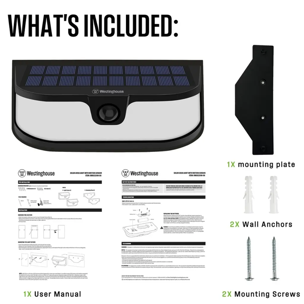 Enhance the security and ambiance of your outdoor spaces with this 4-pack of Westinghouse 1200 Lumen Solar LED Motion Activated Wall Lights, perfect for illuminating your property while providing energy-efficient security lighting. 1200 Lumens of Bright White Light: Each light delivers 1200 lumens of bright white LED light when motion is detected, ensuring high visibility and safety.Motion Detection: Detects movement up to 26 feet away, activating the light at full brightness for 30 seconds before returning to a low-light standby mode.Advanced Solar Technology: Provides up to 8 hours of security light, ensuring reliable operation through the night with efficient solar charging.Dual Lighting Modes: Emits 20 lumens of continuous light for a soft glow, and 1200 lumens when motion is detected, offering both energy savings and maximum brightness when needed.Long Battery Life: Powered by 3.7V 2000mAh 18650 rechargeable lithium batteries, included with each light for long-lasting performance.5000K Daylight White Light: Offers clear and bright illumination with a 5000K color temperature, enhancing visibility and safety at night.Durable Construction: Made from durable plastic with a black finish and frosted lens, designed to withstand outdoor elements and weather conditions.Easy Installation: Comes with wall anchors, mounting plate, and screws, making installation quick and simple.Automatic Pairing: When one light detects motion, both lights illuminate, providing a broader coverage area for enhanced security.Wide Detection Angle: Features a 120° motion detection angle, improving coverage for larger outdoor spaces.Perfect for lighting up driveways, patios, fences, steps, and more, this 4-pack of motion-activated solar lights offers a practical and reliable solution for home security and outdoor illumination."Enhance the security and ambiance of your outdoor spaces with this 4-pack of Westinghouse 1200 Lumen Solar LED Motion Activated Wall Lights, perfect for illuminating your property while providing energy-efficient security lighting. 1200 Lumens of Bright White Light: Each light delivers 1200 lumens of bright white LED light when motion is detected, ensuring high visibility and safety. Motion Detection: Detects movement up to 26 feet away, activating the light at full brightness for 30 seconds before returning to a low-light standby mode. Advanced Solar Technology: Provides up to 8 hours of security light, ensuring reliable operation through the night with efficient solar charging. Dual Lighting Modes: Emits 20 lumens of continuous light for a soft glow, and 1200 lumens when motion is detected, offering both energy savings and maximum brightness when needed. Long Battery Life: Powered by 3.7V 2000mAh 18650 rechargeable lithium batteries, included with each light for long-lasting performance. 5000K Daylight White Light: Offers clear and bright illumination with a 5000K color temperature, enhancing visibility and safety at night. Durable Construction: Made from durable plastic with a black finish and frosted lens, designed to withstand outdoor elements and weather conditions. Easy Installation: Comes with wall anchors, mounting plate, and screws, making installation quick and simple. Automatic Pairing: When one light detects motion, both lights illuminate, providing a broader coverage area for enhanced security. Wide Detection Angle: Features a 120° motion detection angle, improving coverage for larger outdoor spaces. Perfect for lighting up driveways, patios, fences, steps, and more, this 4-pack of motion-activated solar lights offers a practical and reliable solution for home security and outdoor illumination."