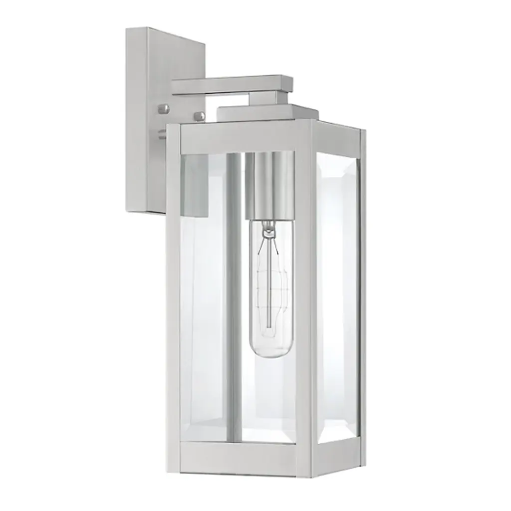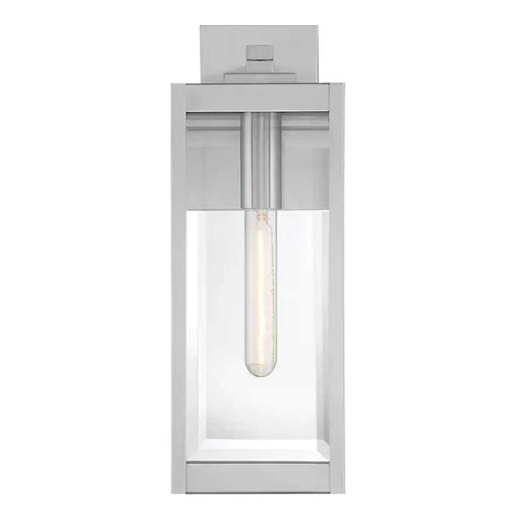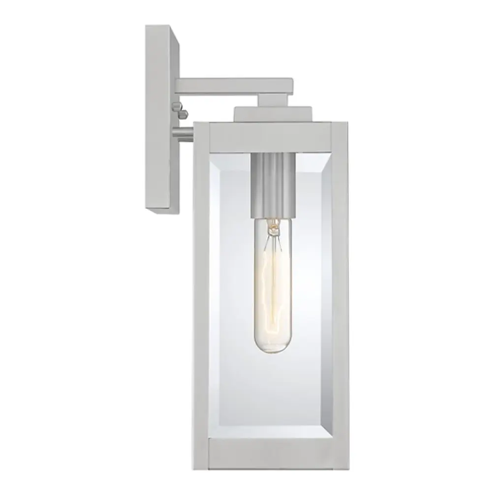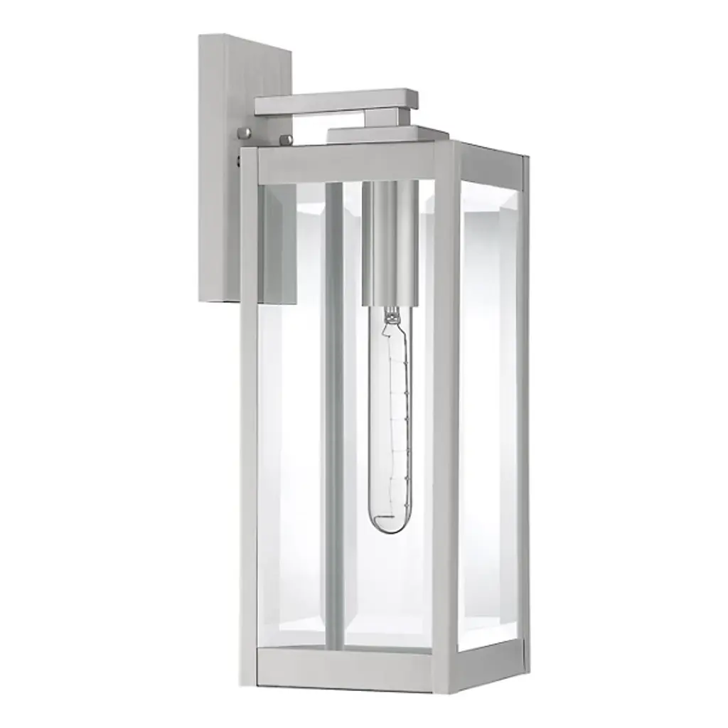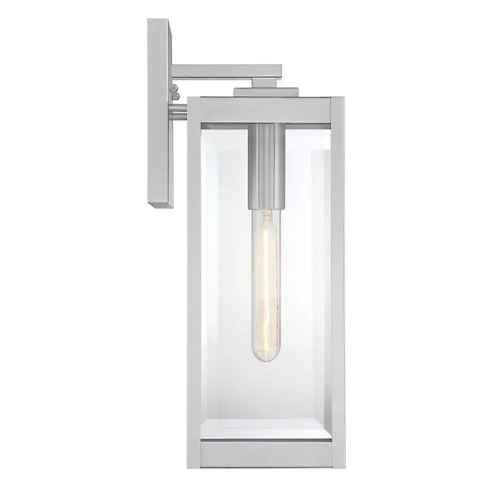 A sleek and modern style that can’t be ignored. The Westover Outdoor Wall Sconce by Quoizel features a clean and simplistic silhouette to complement any modern exterior space. Stainless steel forms its elongated shade and a rectangular backplate, holding clear beveled glass panels on each side. Inside, a cylindrical socket holds a bulb to emit a warm wash of light. Its minimalistic style and smooth framework elevate a space without overpowering surroundings.