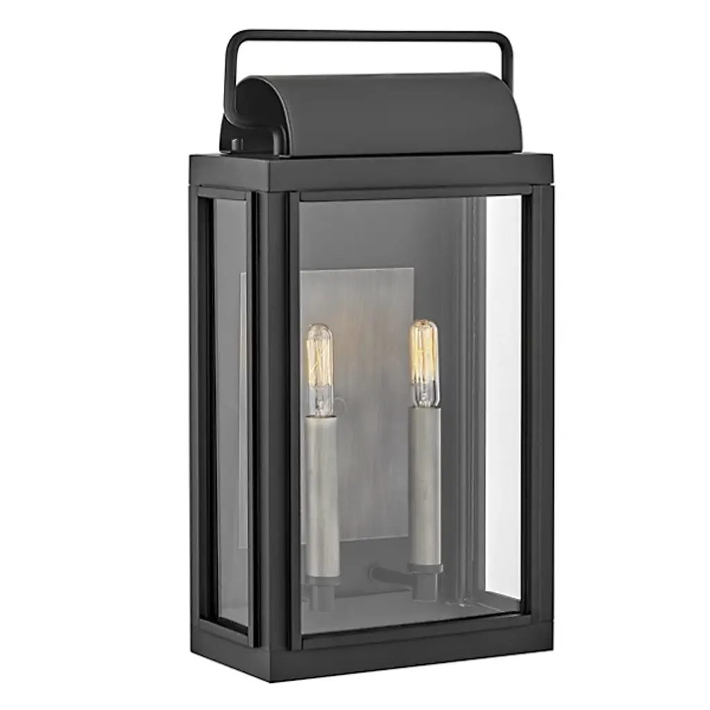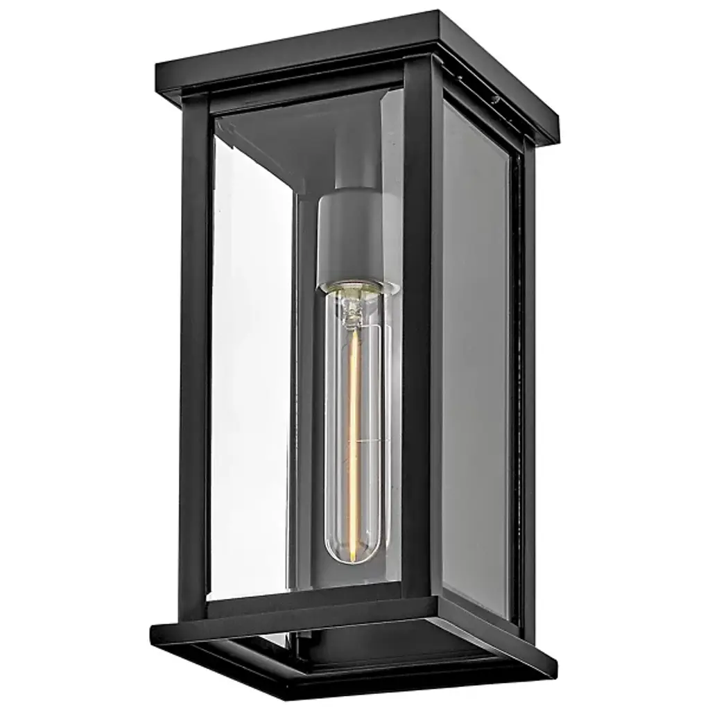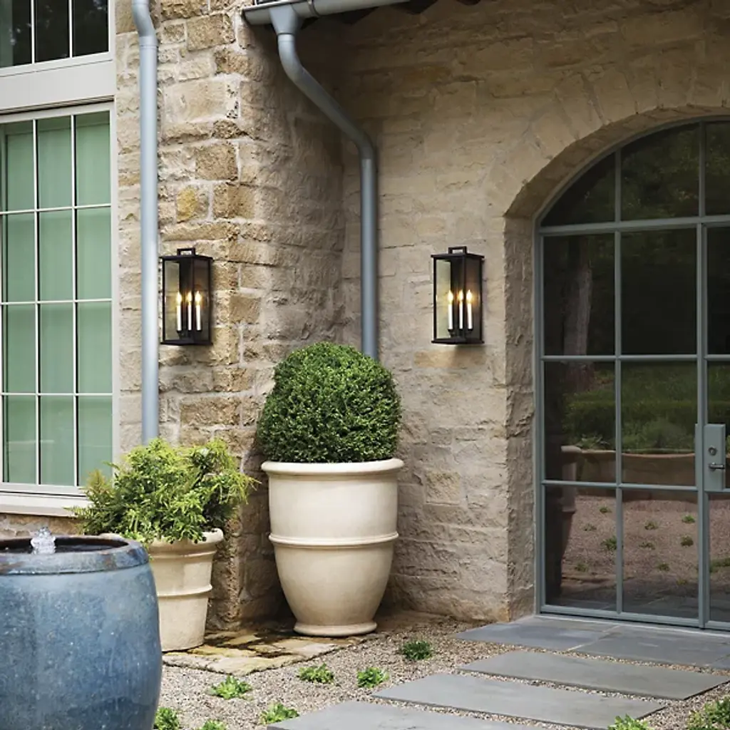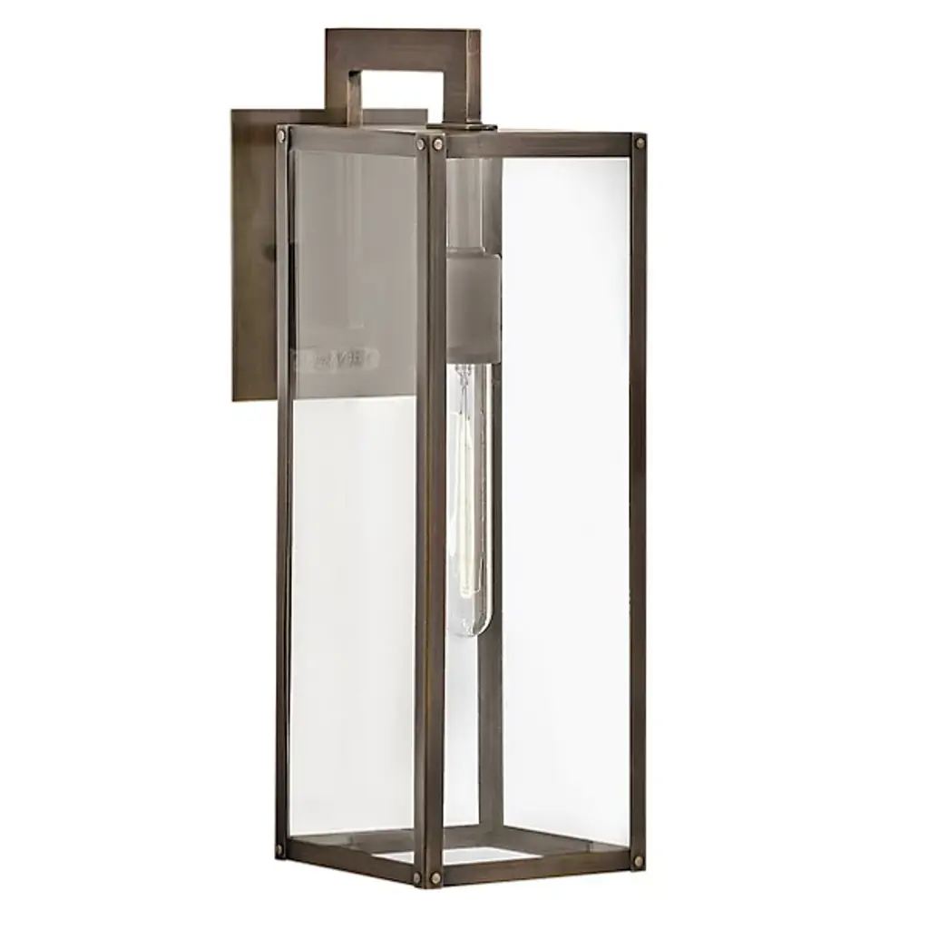 Elevate your home’s exteriors with the clean style of the Weymouth Outdoor Wall Sconce from Hinkley Lighting. This fixture takes the concept of a traditional lantern lamp and updates it with sharp lines and an angular silhouette to modernize a home’s façade. A slender, rectangular frame supports clear beveled glass panels enclosing its candelabra lamping. One's bulbs emit soothing light that brightens the area and complements the piece’s bold aesthetic.