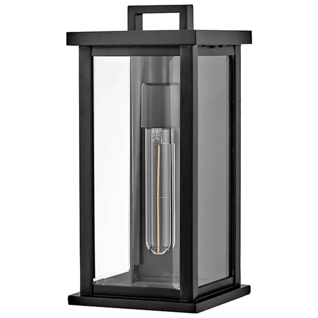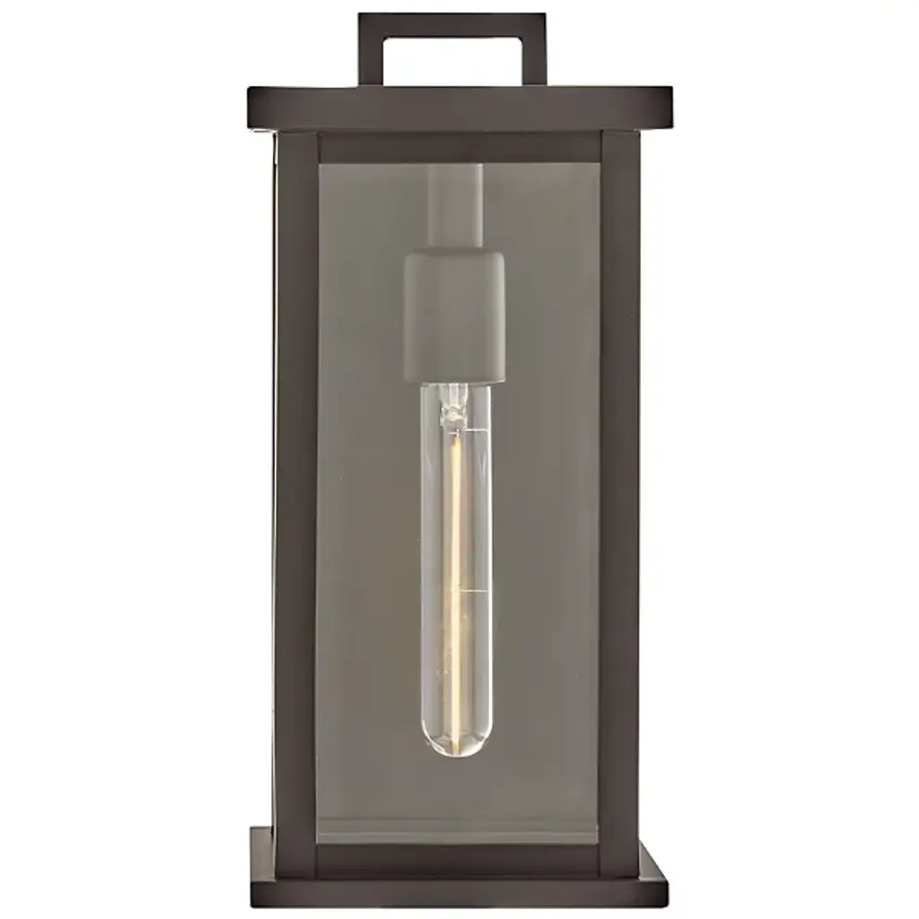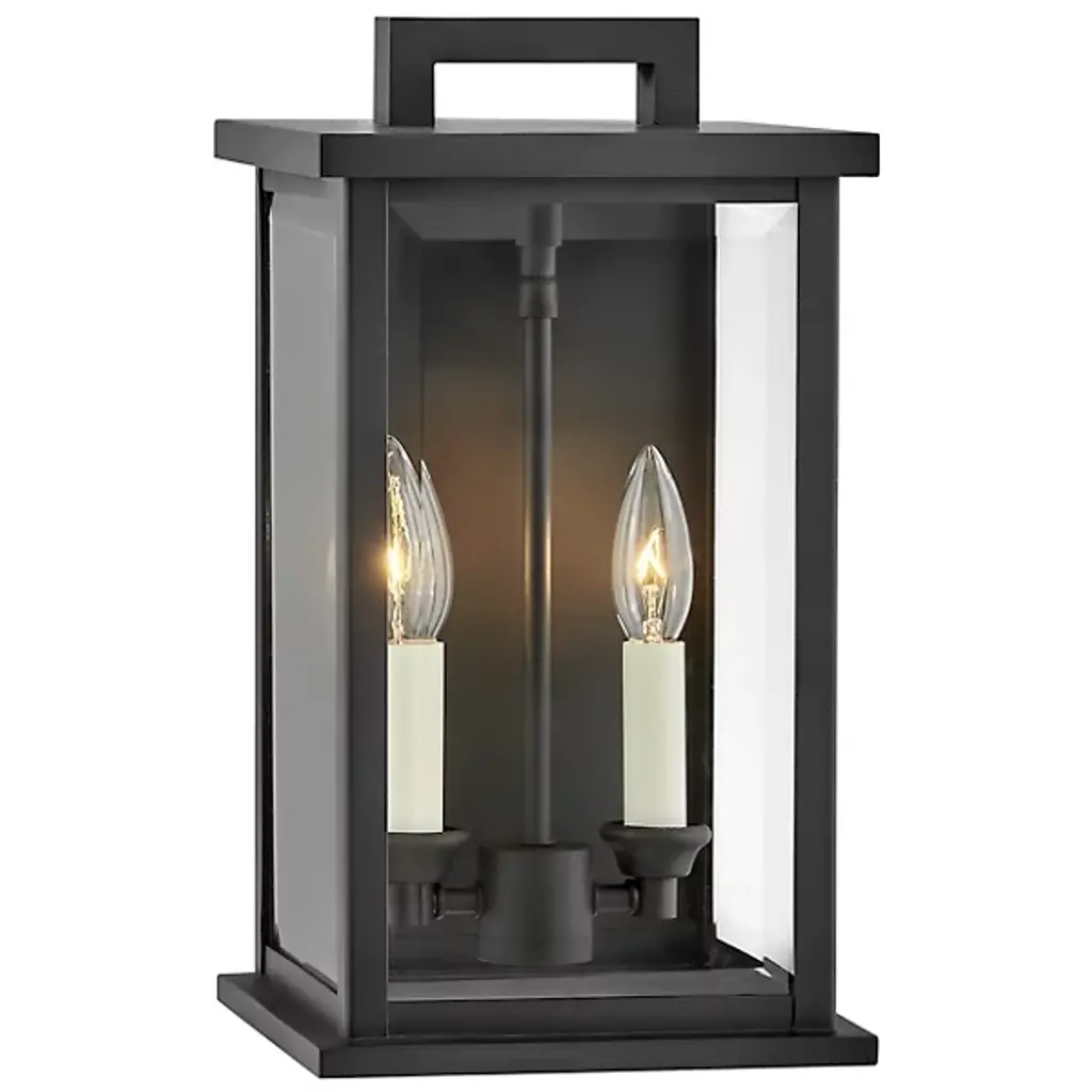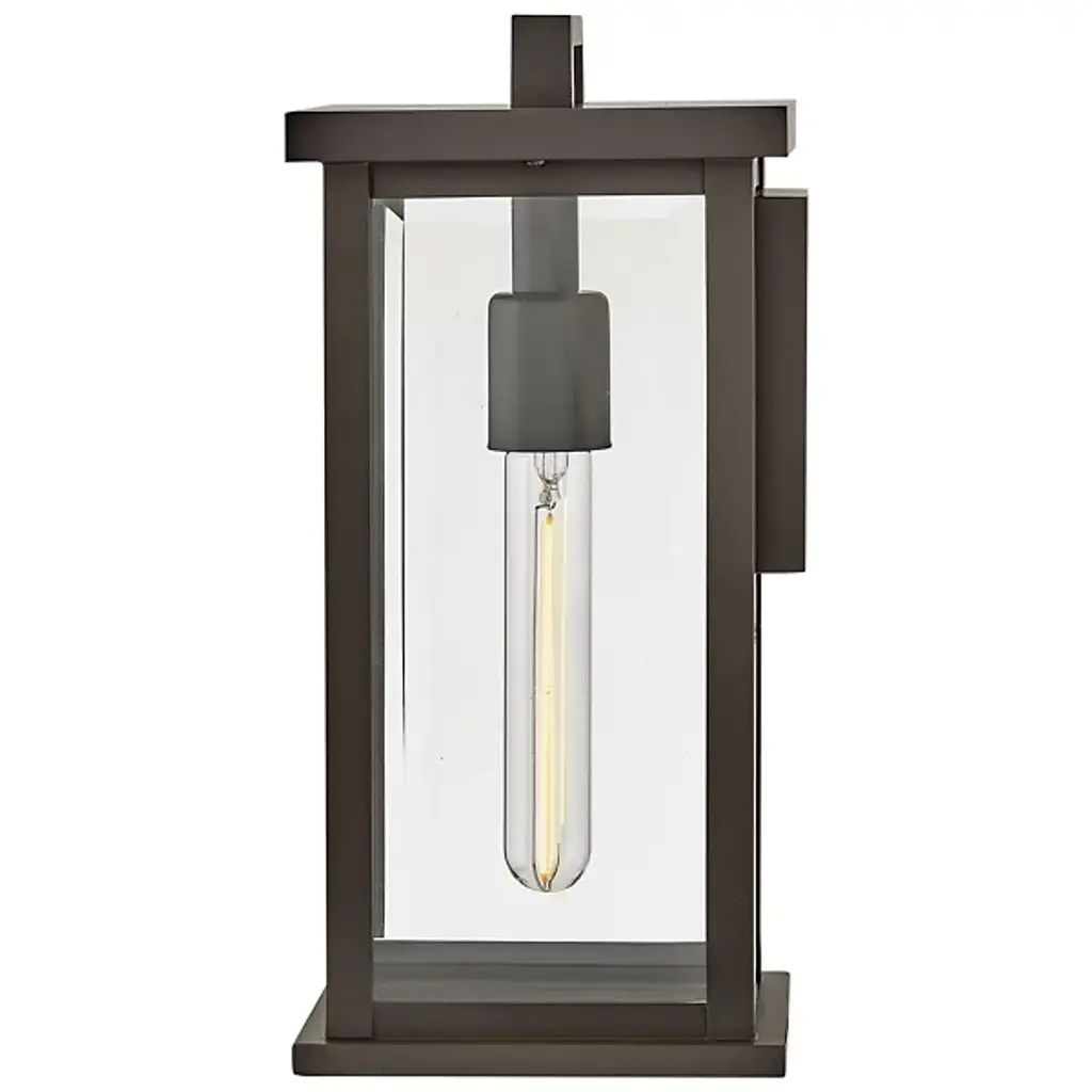 Elevate your home’s exteriors with the clean style of the Weymouth Outdoor Wall Sconce from Hinkley Lighting. This fixture takes the concept of a traditional lantern lamp and updates it with sharp lines and an angular silhouette to modernize a home’s façade. A slender, rectangular frame supports clear beveled glass panels enclosing its candelabra lamping. One's bulbs emit soothing light that brightens the area and complements the piece’s bold aesthetic.