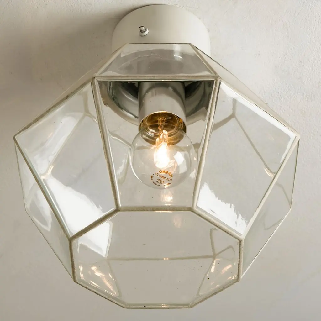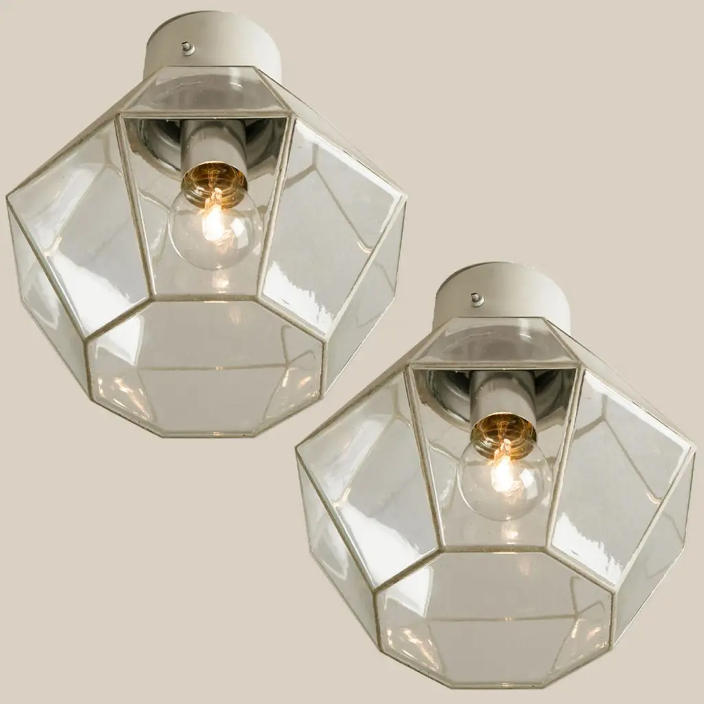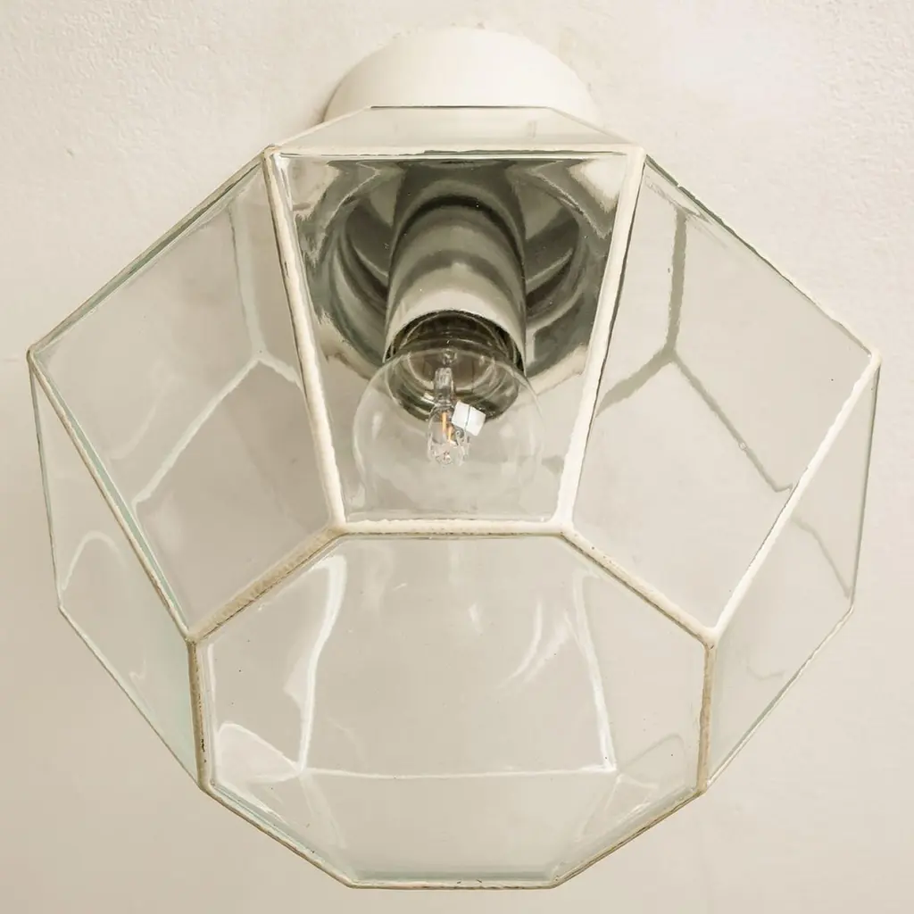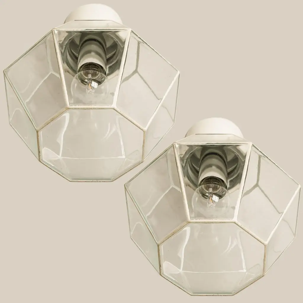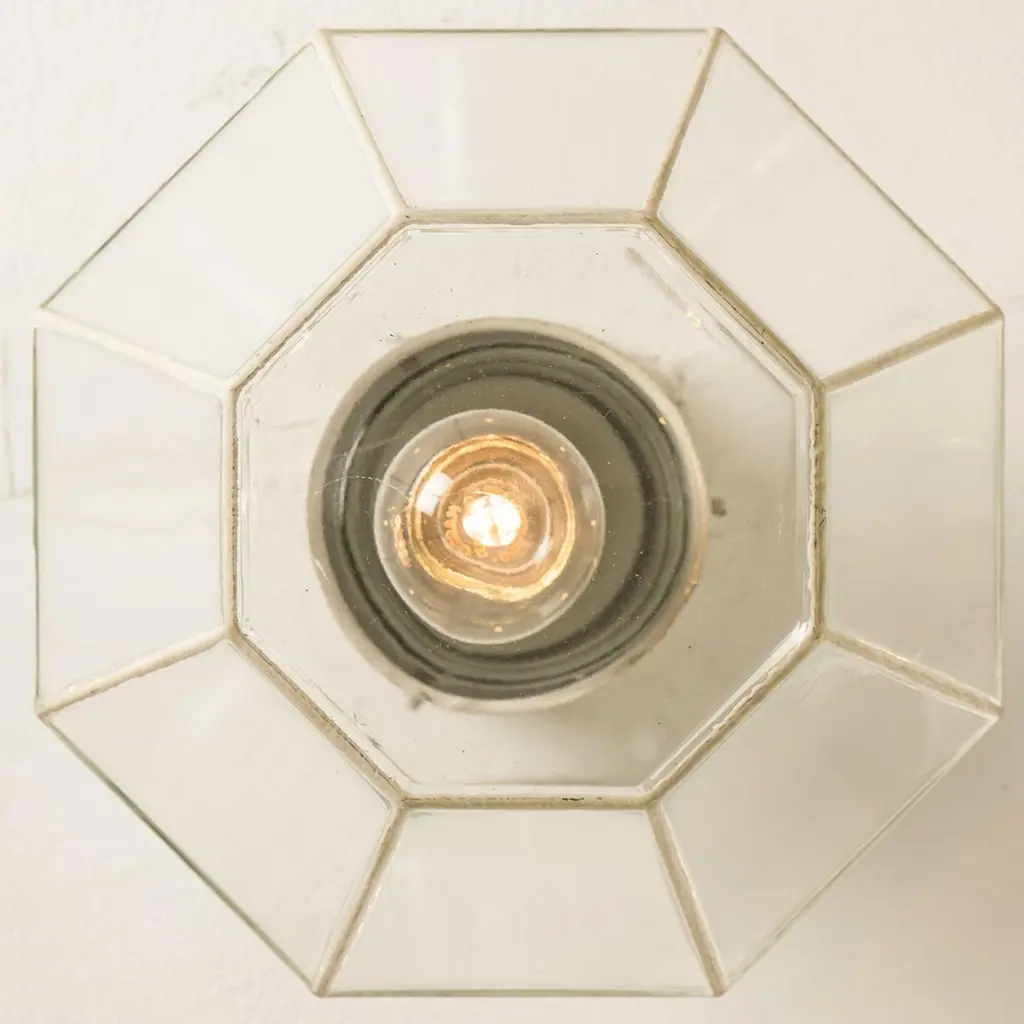 A beautiful set of octagonal glass light flush mounts or wall lights, manufactured by Glasshütte Limburg in Germany during the 1970s. Beautiful craftsmanship. Illuminates beautifully.Please note the price is for one piece. Two pieces available.Measurements: diameter 10.2 "26 cm.In very good condition, cleaned and well wired. Each lamp, features one E27 socket.