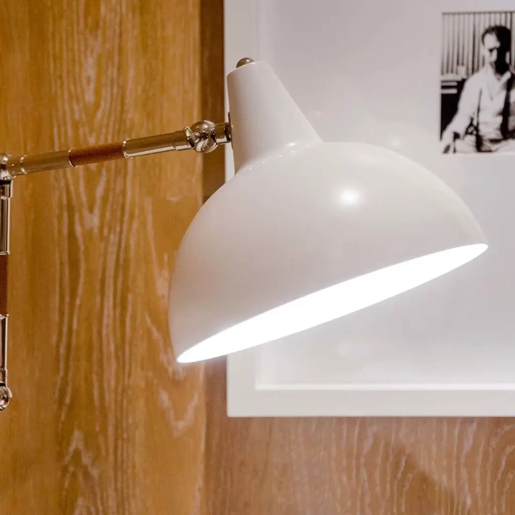 A revisitation of retro desk lamps, the Lamal Wall Light radiates timeless style. With three different hinges, the light with a painted metal shade is easy to position over a work space or next to a bed as a reading lamp. The arm is accented with brown leather inserts. Bulb: 1 x max 60W E27.