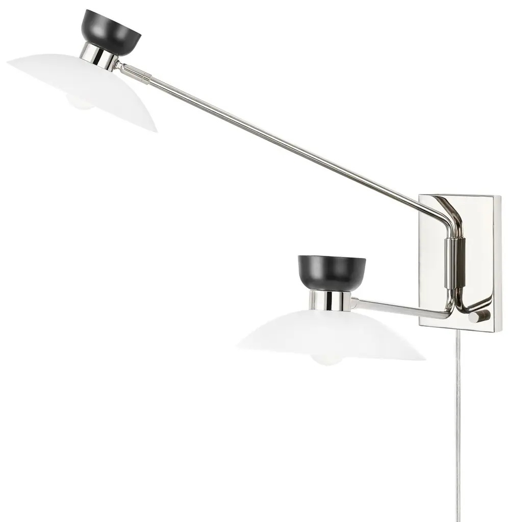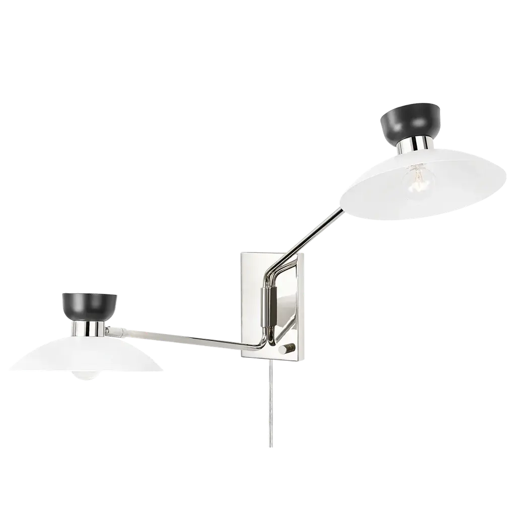Like a flowering lotus, Whitley expands outward. Dueling finishes in soft black and white present a yin yang effect, anchored by a crisp metal arm in aged brass or polished nickel. Available as a pendant in two sizes and a dramatic swing arm wall sconce. Not sure where to place the wall light? Try Whitley over a reading banquet or writing desk.