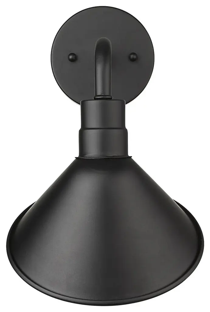 With this Wide Shade Matte Black LED Wall Light you can add a touch of industrial design to any space in your home, whether indoors or out. The wall bracket has a circular shape to which there is a circular metal rod attached. The metal rod curves at the end and attaches to the light shade. The wide tapered shape of the shade sits slightly askew and adds a nice touch of depth to the overall look. The matte black color of this wall sconce means you can use it indoors and outdoors easily. 12.5" H x 8" W x 12.25" D