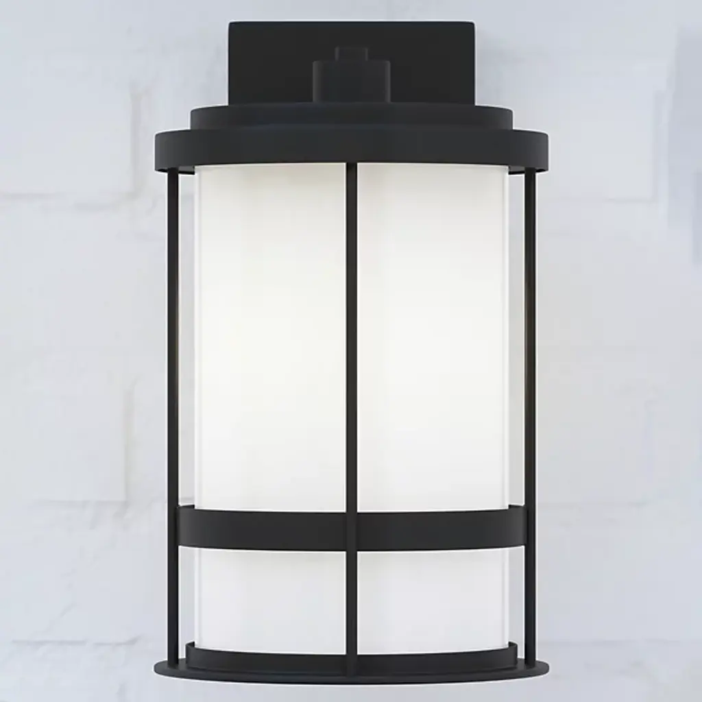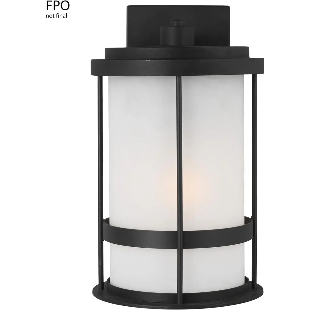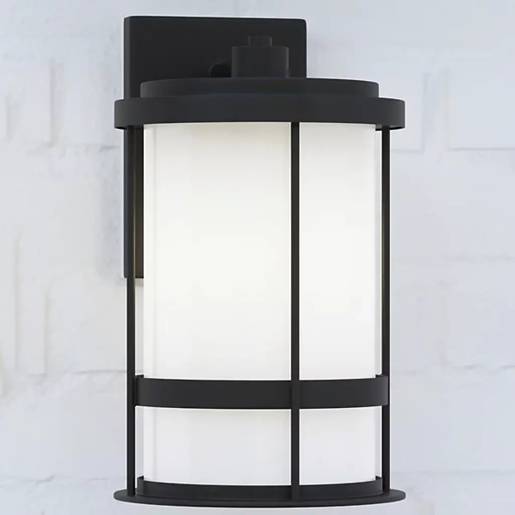 Increase visibility in outdoor spaces and magnify your curb appeal with the Wilburn Outdoor Wall Sconce from Generation Lighting, formerly known as Sea Gull Lighting, A rounded, robust construction that starts with a sharp-cornered aluminum wall mount, it uses a short stem to extend a clean-surfaced lantern-style lamp downwards. Damp-rated lamping is held within a cylinder of satin etched set glass between round metal endcaps and embellished by slender stems, creating a restrained, contemporary look that spills out a warm, wide-reaching ambiance all around it.