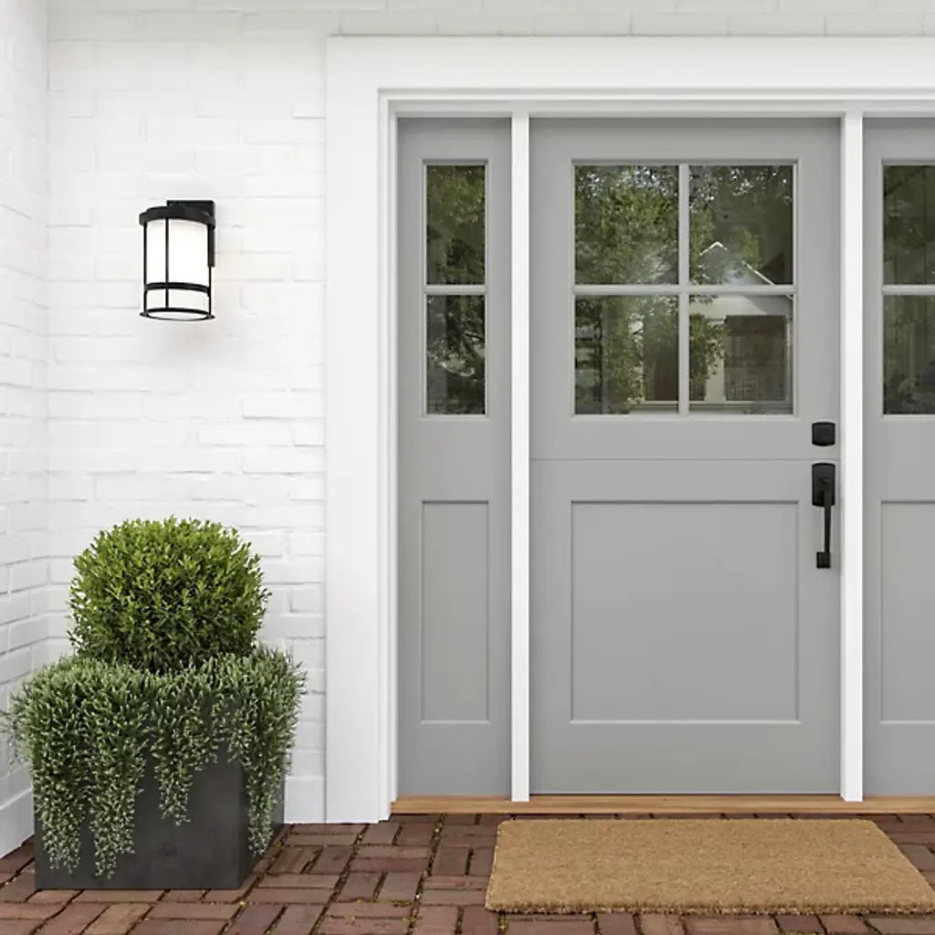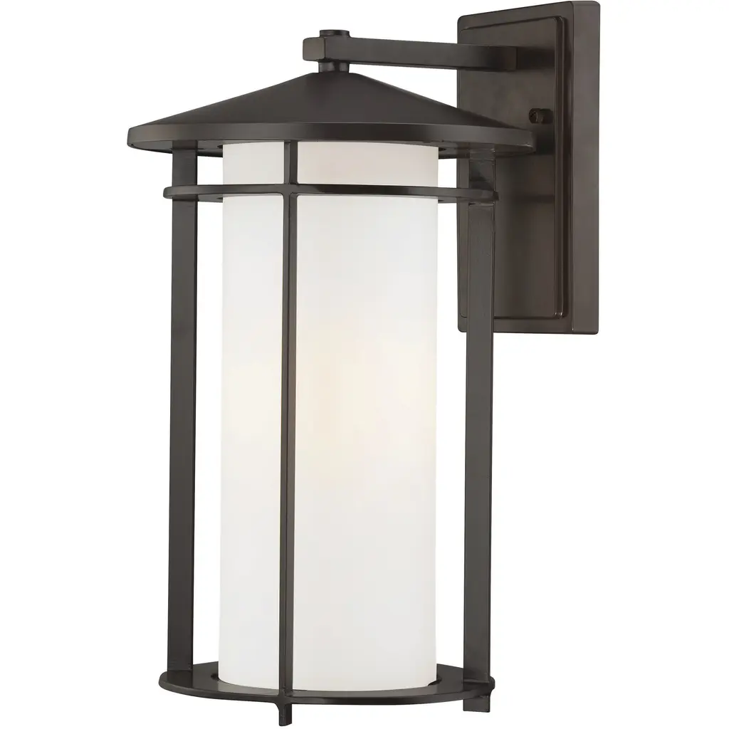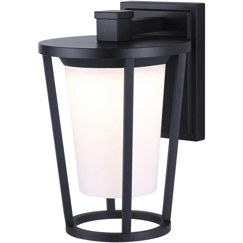 Increase visibility in outdoor spaces and magnify your curb appeal with the Wilburn Outdoor Wall Sconce from Generation Lighting, formerly known as Sea Gull Lighting, A rounded, robust construction that starts with a sharp-cornered aluminum wall mount, it uses a short stem to extend a clean-surfaced lantern-style lamp downwards. Damp-rated lamping is held within a cylinder of satin etched set glass between round metal endcaps and embellished by slender stems, creating a restrained, contemporary look that spills out a warm, wide-reaching ambiance all around it.