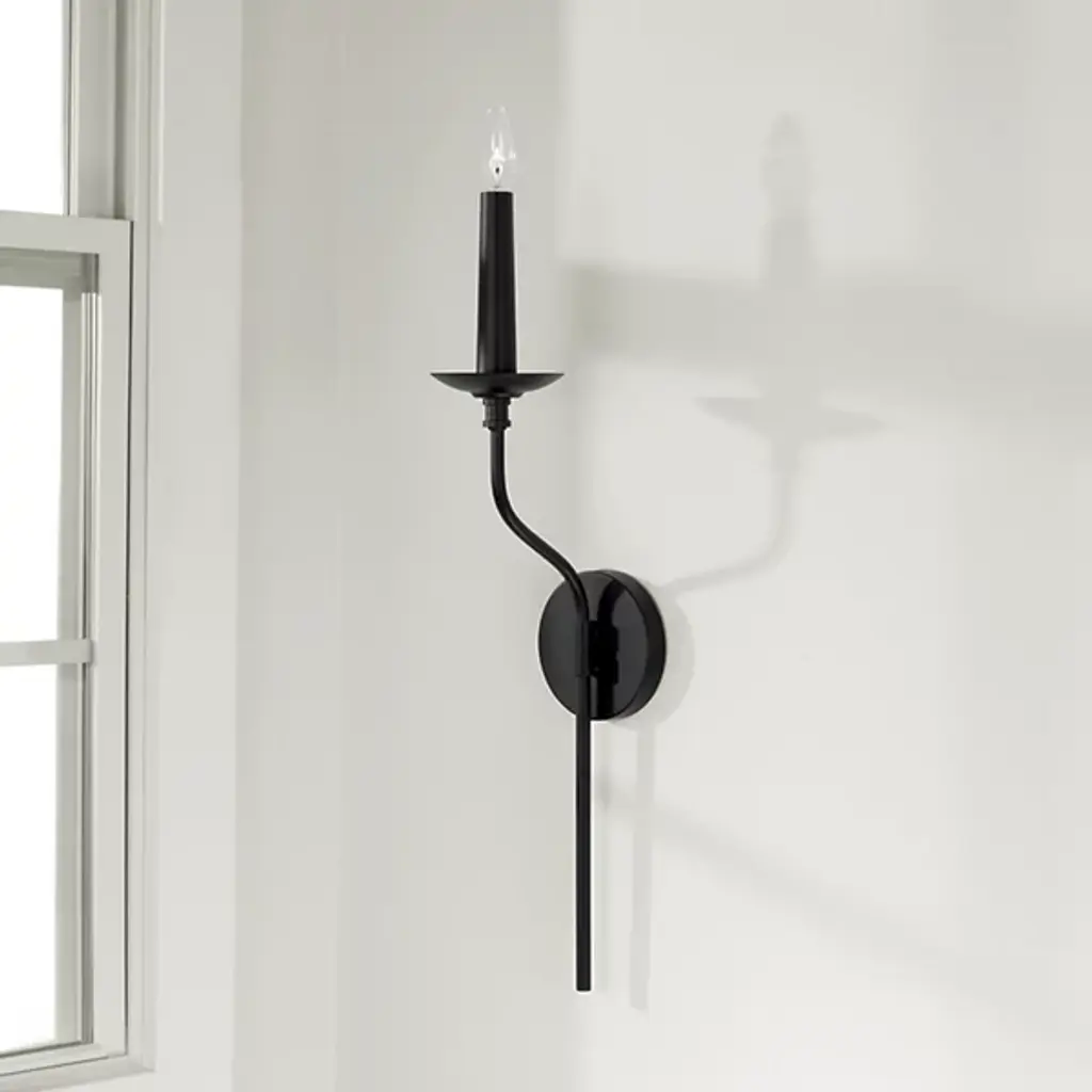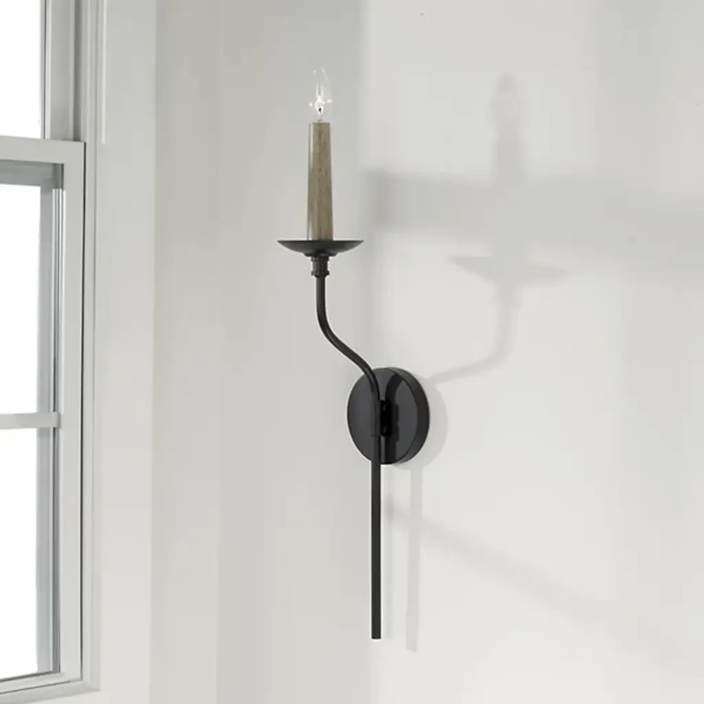 The Wilder Wall Sconce from Capital Lighting unites rustic modern and farmhouse styles, creating a captivating fixture that brings character to your space. The curved arm gracefully stems from a round backplate, bolstering a bobeche that supports a brilliant LED. Wilder provides functional illumination and brings a candlelight aura to your surroundings. Crafted from high-quality metal, this wall sconce is a statement piece that embodies style and durability. It features interchangeable candle sleeves.