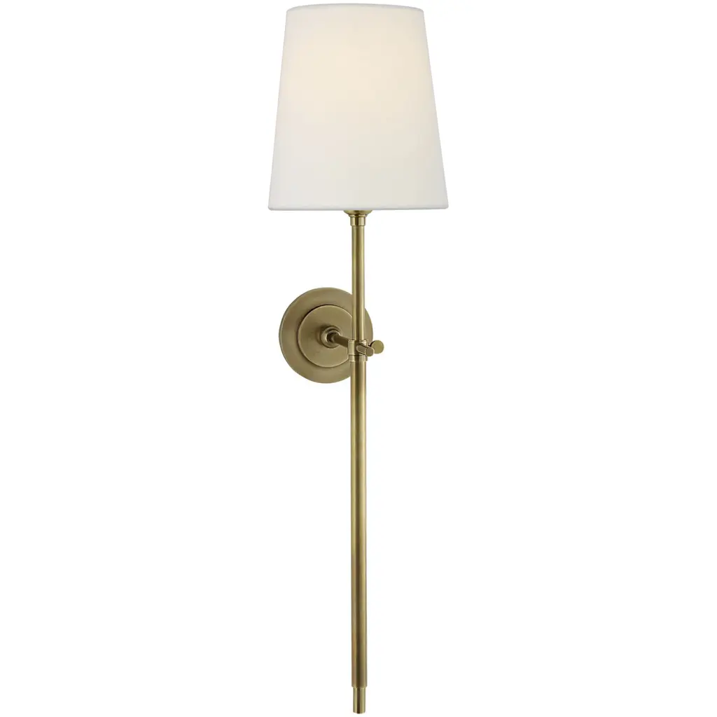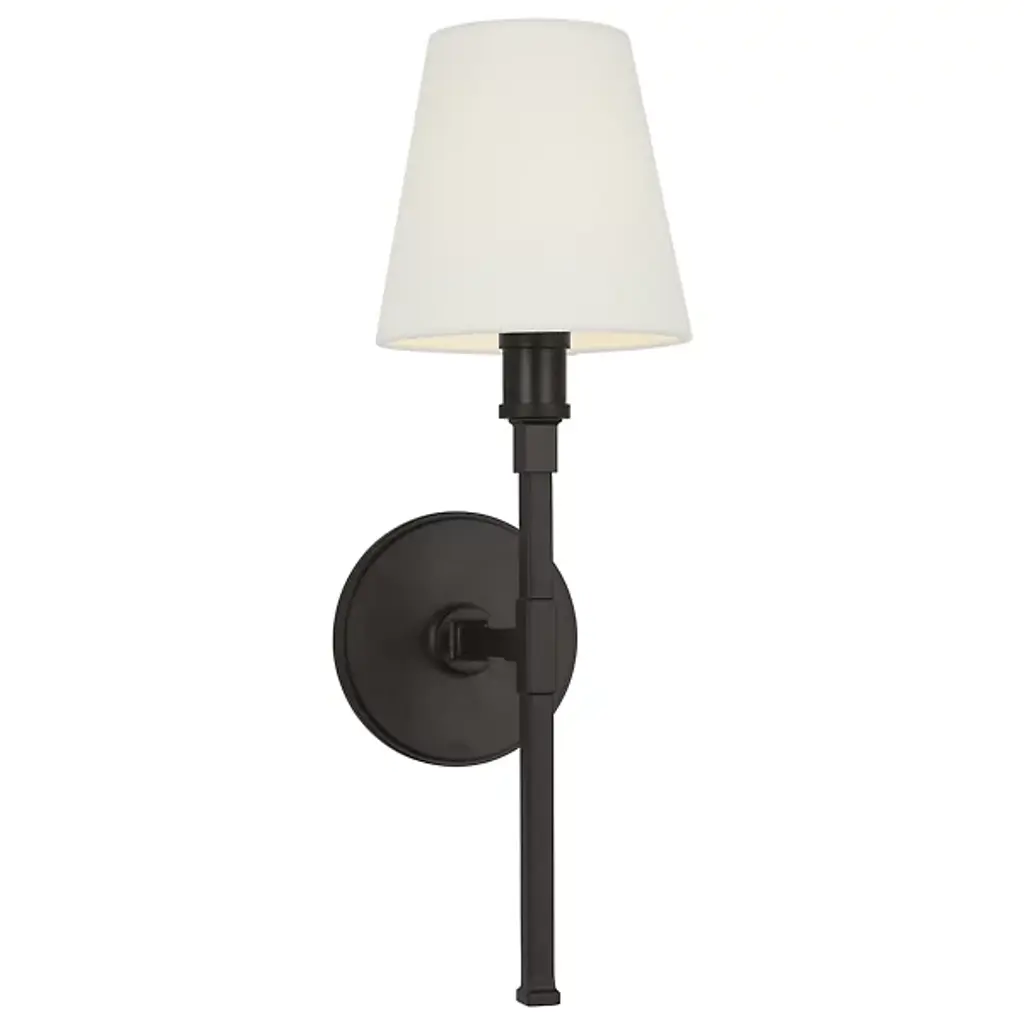 The William Wall Sconce from Alder & Ore dresses up the many walls of the home with a design blending time-honored lighting motifs and mid-century flair. It slots nicely into tight nooks with a circular backplate accented with stepped shapes. The stem in front creates a lovely baton-like silhouette. The ultra-sleek lamp holder on top references traditional lighting with a bobeche accent. Crowning the piece, a silk shade also draws from the traditional lighting’s cone form. This shade receives a golden gradient as a rich ambient light sifts through.