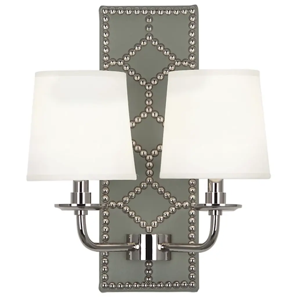 Modern style with a chic antique inspiration. The Robert Abbey Williamsburg Lightfoot Wall Sconce features a decorative wall plate upholstered in leather and studded with blacksmith nail heads. The look recalls the hand-smithed construction of a bygone era, updated here with a contemporary palette and modern mix of materials. Two Fondine fabric shades lend an air of tradition that nevertheless contributes to a relaxed overall impression.