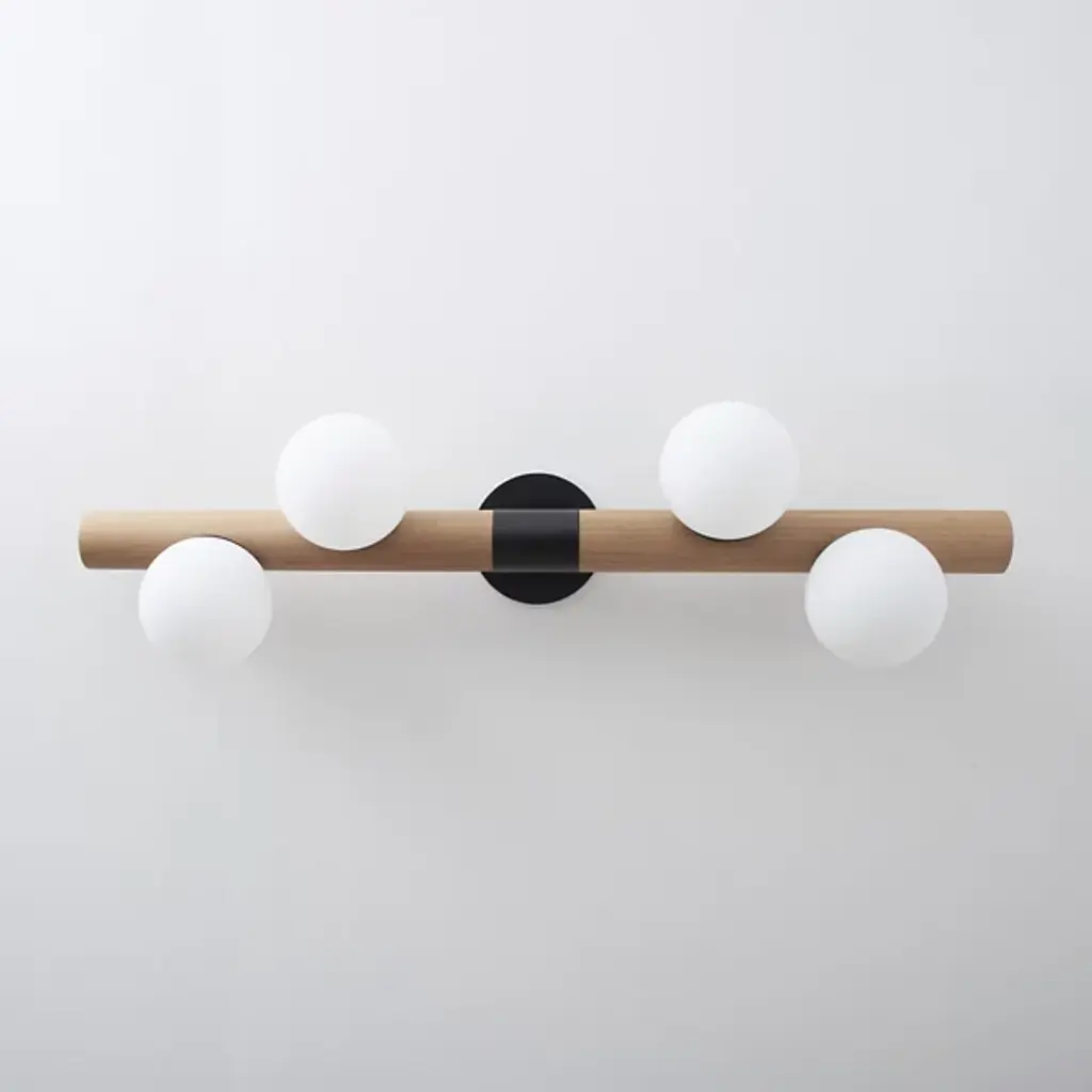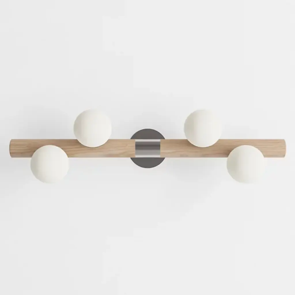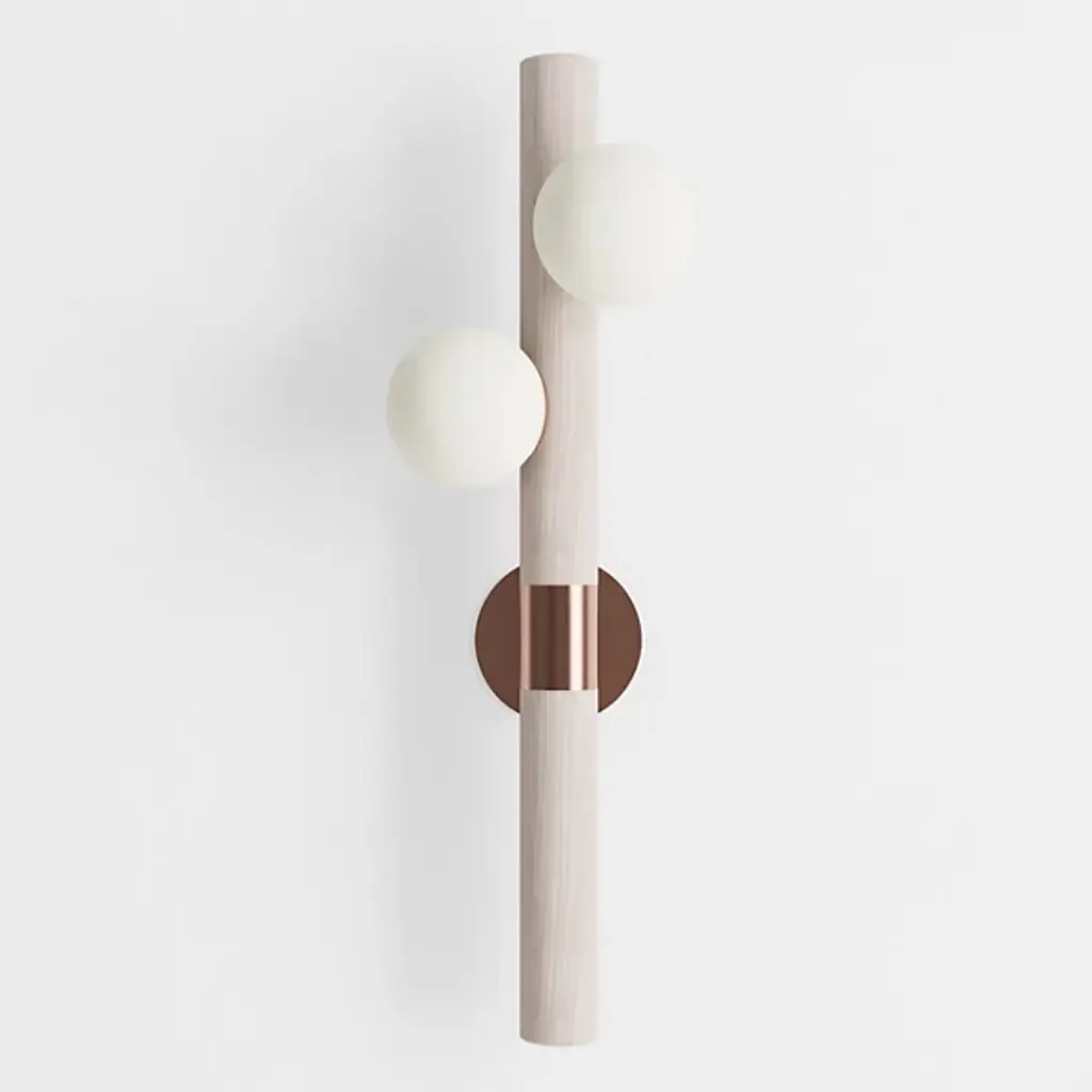 Bring a contemporary aesthetic to your decorative arrangement with the Willow Wall Sconce by hollis+morris. Your wall sconce is the realized vision of designer Mischa Couvrette. Couvrette’s focus on environmental sciences informs his material selections in this decorative piece. Wood has been finely shaped into a cylindrical form to provide support for a collection of globes. These globes, composed of frosted glass, are brightly lit by an LED. The eye is drawn to the steel casing that forms a lovely band at the sconce’s center.