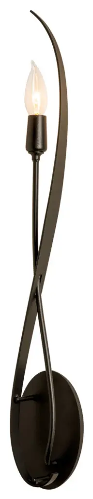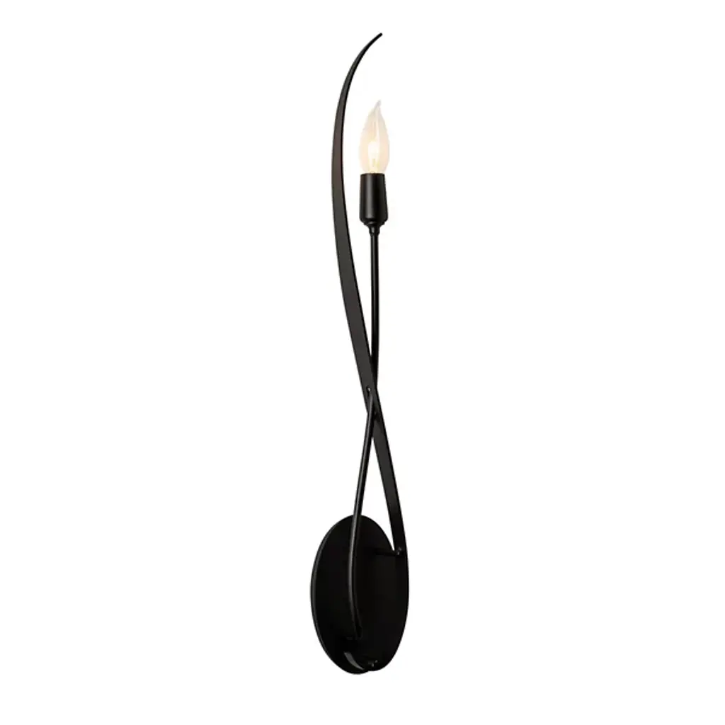 The Willow Wall Sconce by Hubbardton Forge balances simplicity with the sophisticated. Anchored by a round wall plate, a beautifully crafted metal arm curves around itself, reaching up to balance an exposed candelabra on one end and gracefully swoops to frame this light source at the other. With an elegant, classic look, the silhouette of this wall sconce has an organic feel as it casts a welcoming layer of illumination onto its surroundings.