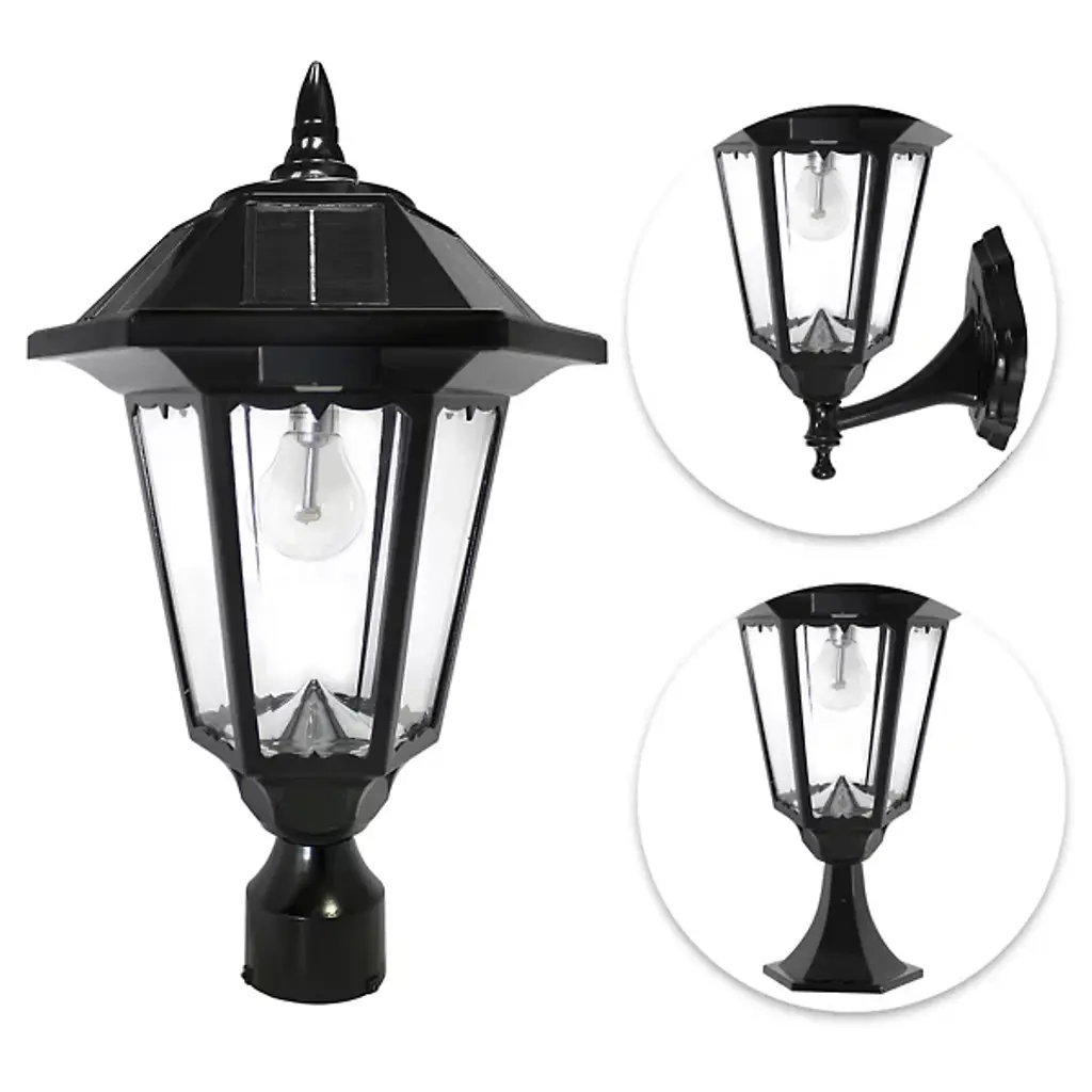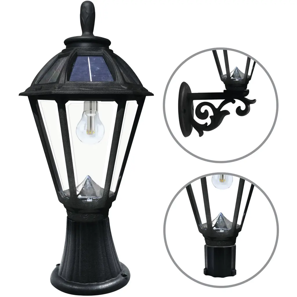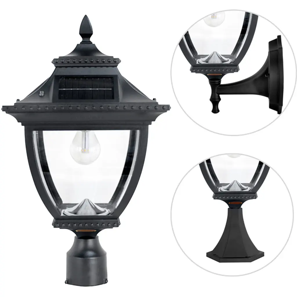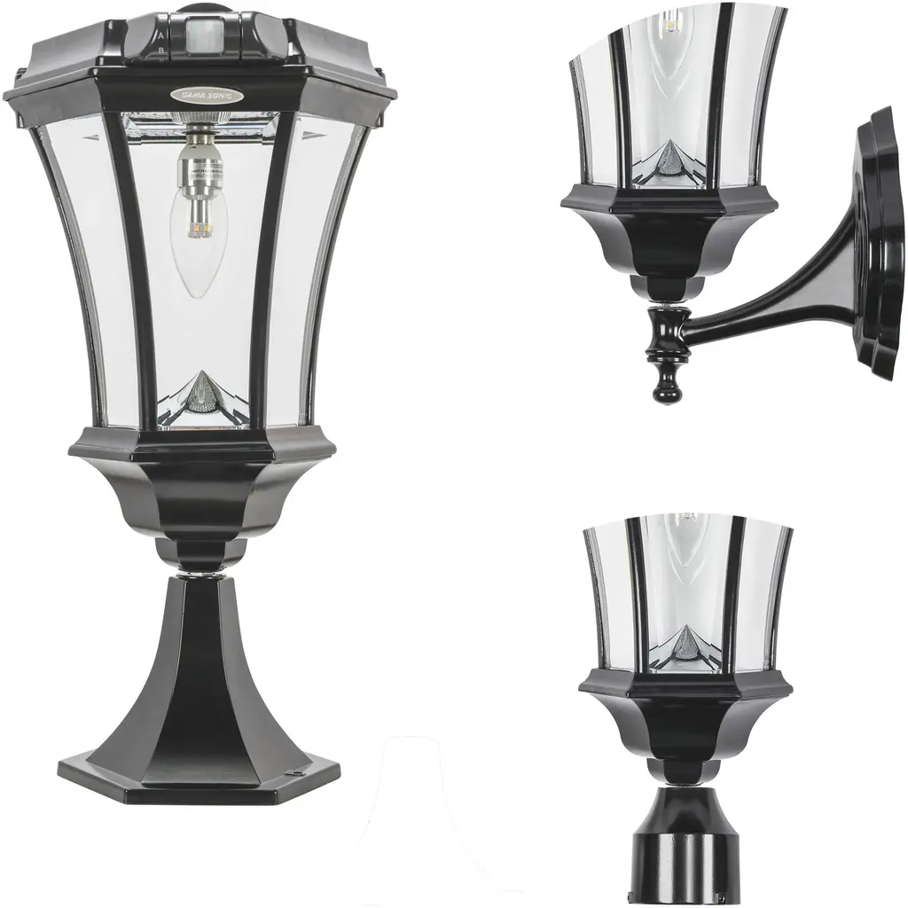 The Windsor Solar LED Wall Sconce / Pier Mount / Post Light from Gama Sonic is a stylish and efficient alternative to traditional outdoor lighting. It boasts a 19th-century lamp design constructed from rust-resistant cast aluminum with a powder-coated finish and beveled glass panes. With no need for electrical wiring, it's a hassle-free replacement for conventional outdoor lighting. Powered by solar energy, it charges its internal Lithium Ion battery pack through six integrated solar panels during the day. At dusk, 12 bright-white LEDs automatically light up, providing 150 lumens of brightness on a full solar charge. The fixture is designed for dusk-to-dawn operation, and you can switch to economy mode if the battery isn't fully charged.