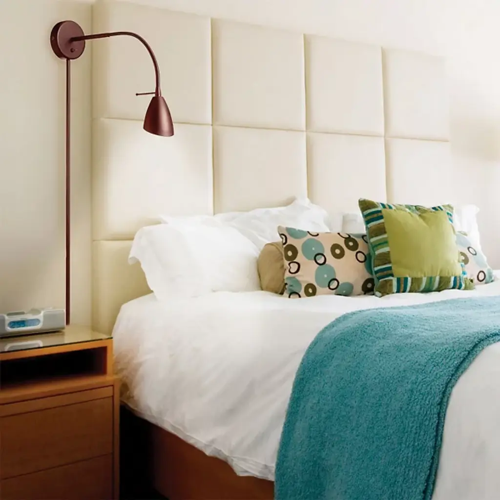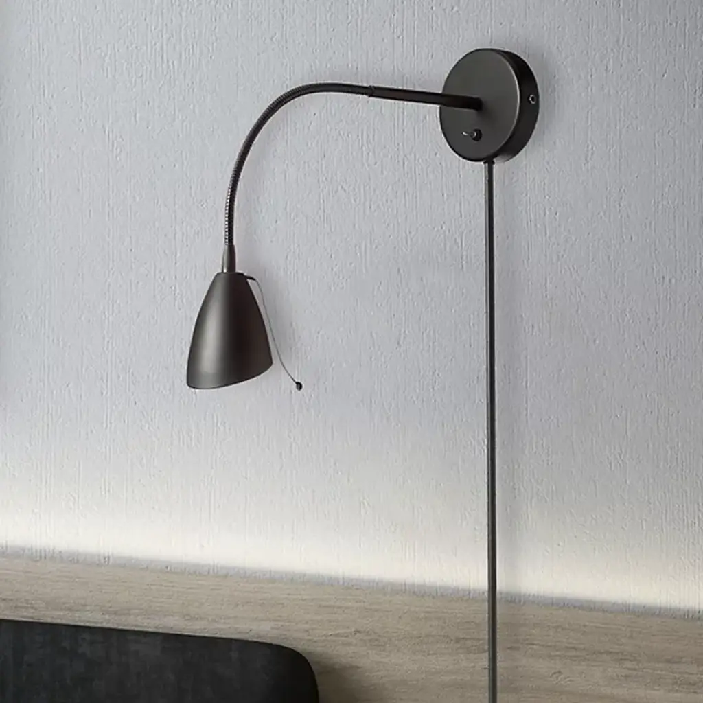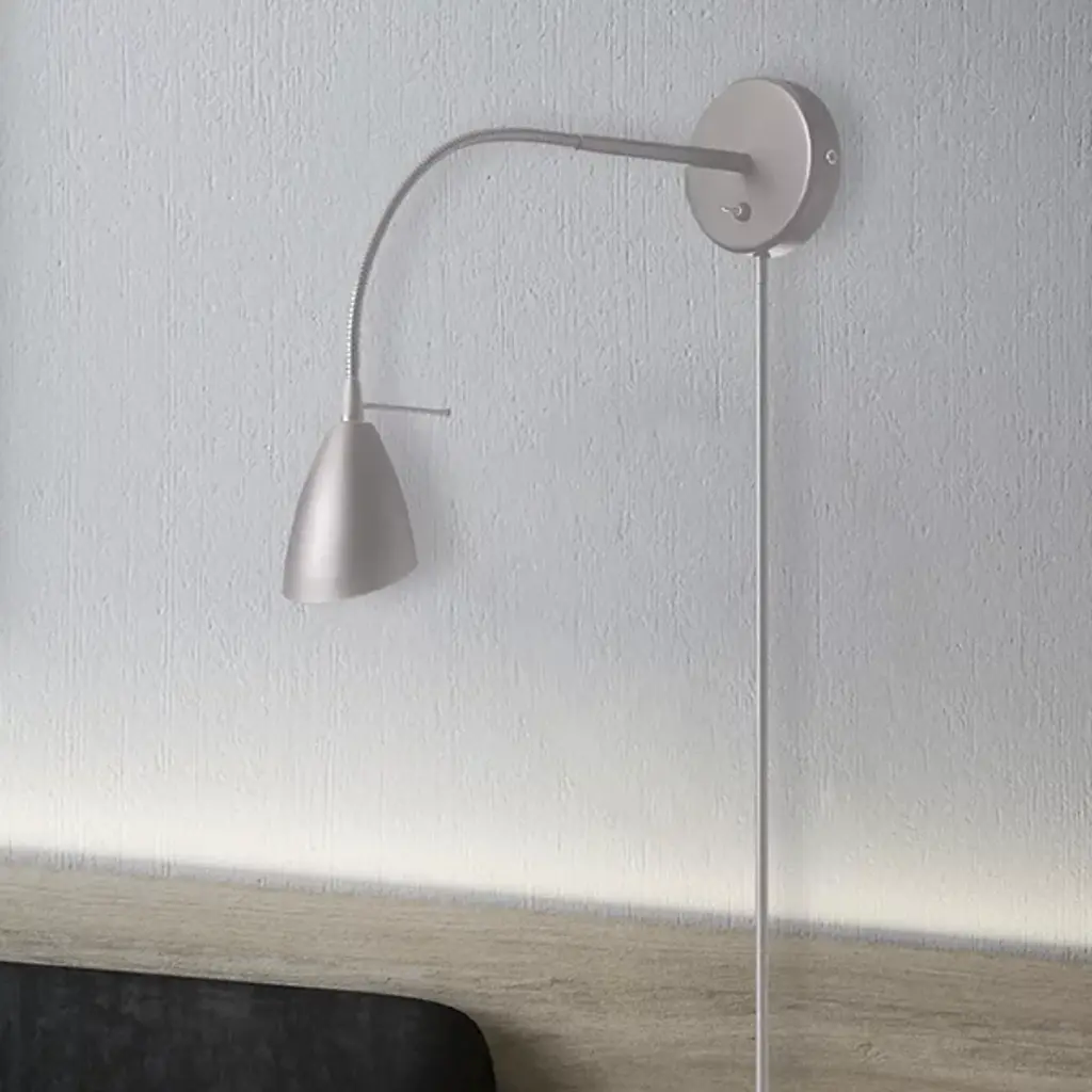 The Winford Gooseneck Wall Sconce from Dainolite adds sweeping elegance to contemporary or minimalist interiors. Supported by a smooth circular wall mount with a single switch and long cord channel, it uses a short horizontal stem to support a flexible gooseneck set just above its adjustable lamping. The single-socket is placed inside a bevel-cut flared metal shade, easily able to place a focused pool of light wherever it is needed while reducing glare from the sides.