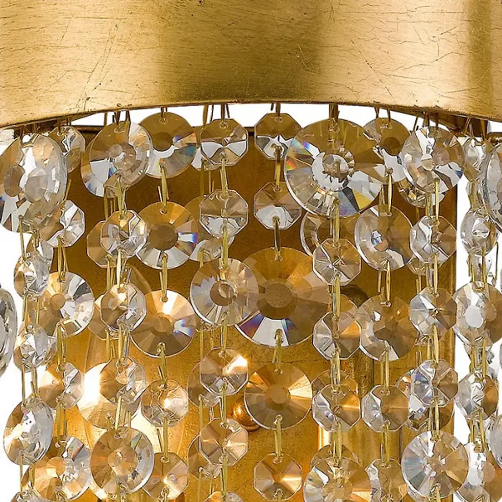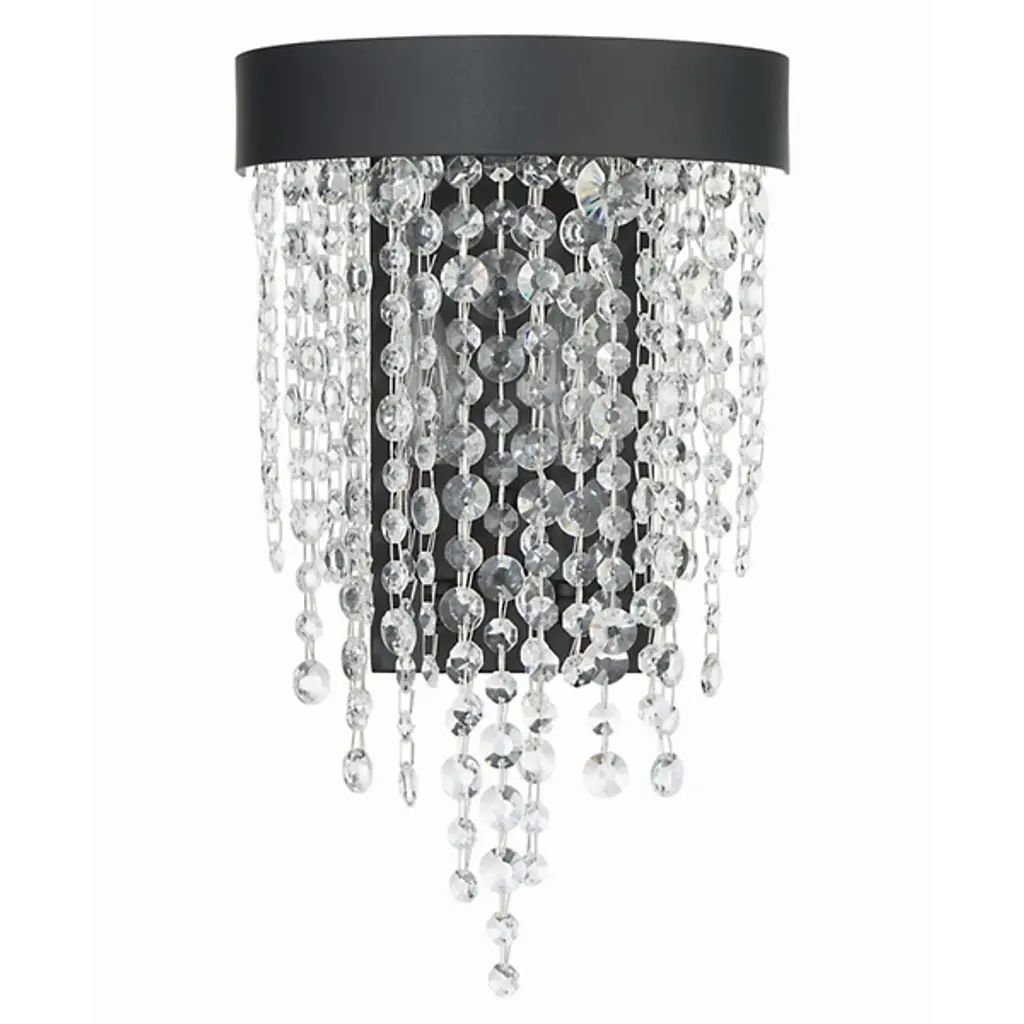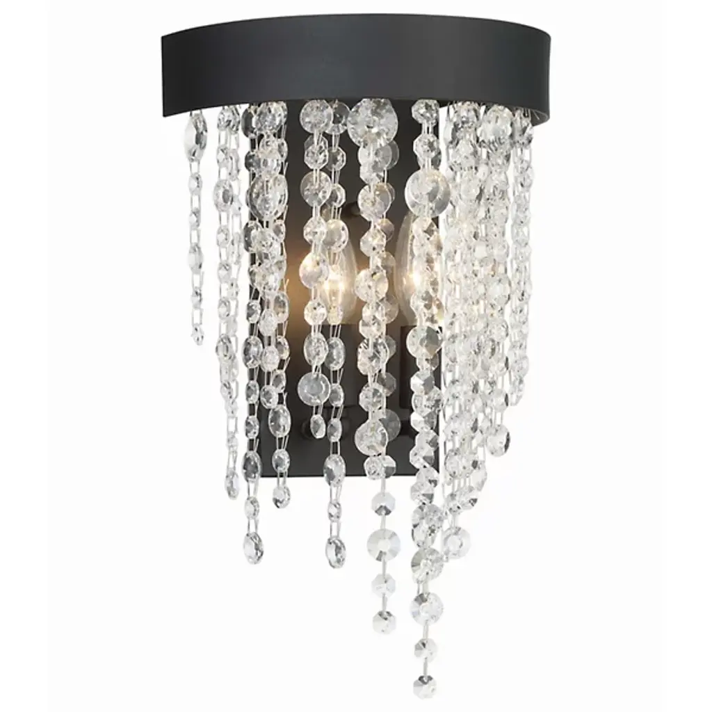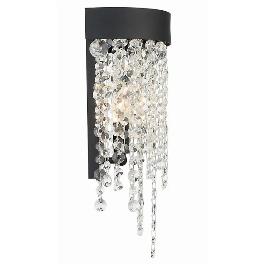 Go for the win with the Winham Wall Sconce by Crystorama, a contemporary construction with shiny retro notes. A rectangular wall mount holds out a half-cylinder hood above the lamping, dropping chains of faceted crystal over down-oriented lamping. The design choice serves to slightly subdue the light sockets beneath the crystal, offering a shimmering waterfall of color that comes to a point at the fixture’s base and creates a warm, sparkling glow.