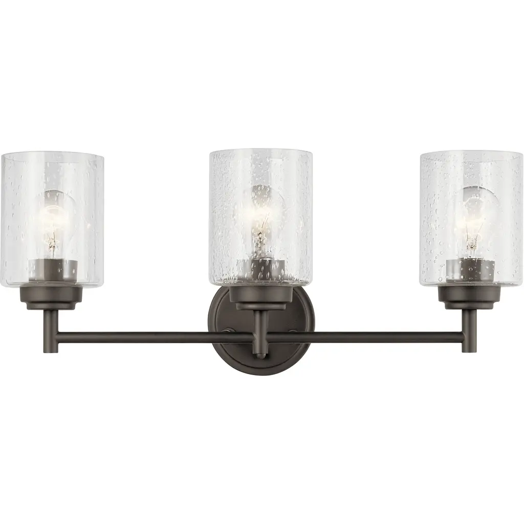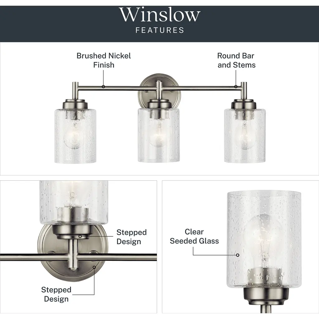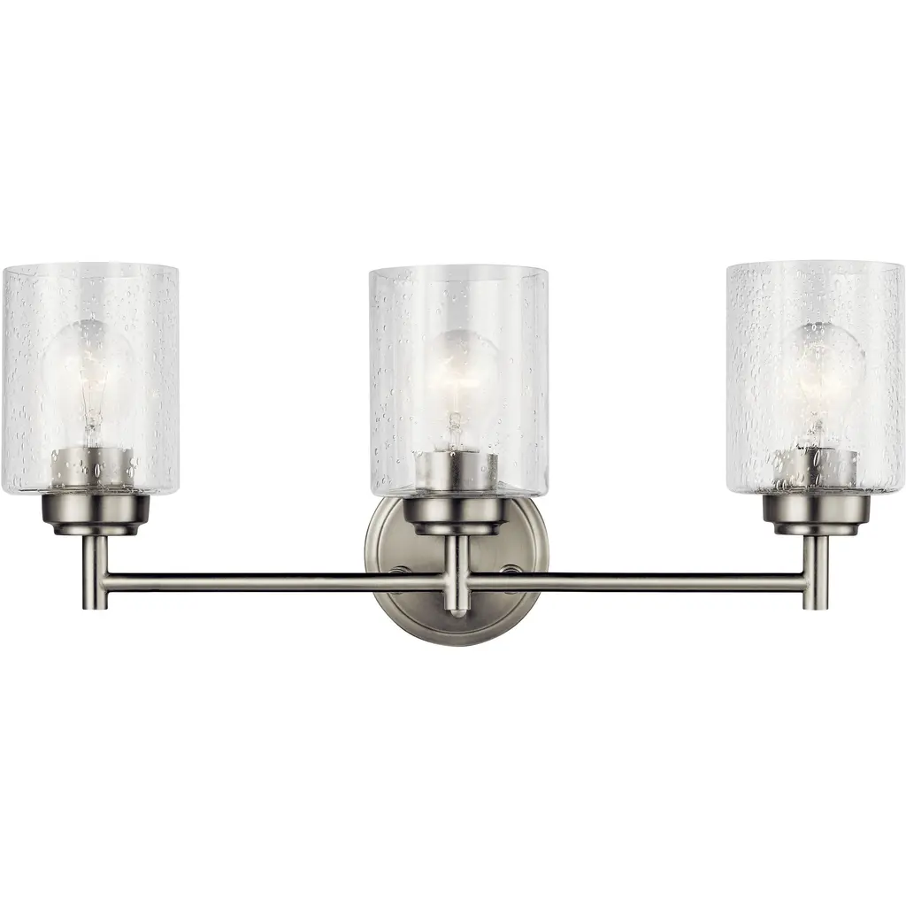 The modern Winslow 3-light 21.5in. bath light in a Brushed Nickel finish with Clear Seeded glass shade pair beautifully with the linear arms, bringing light and dimension to a space.