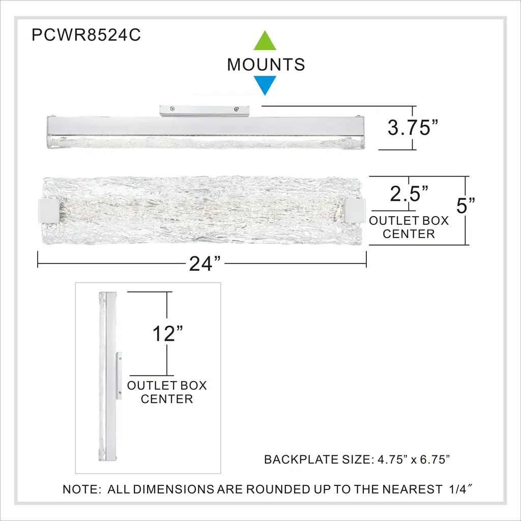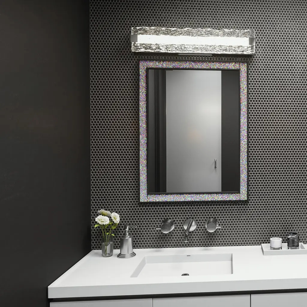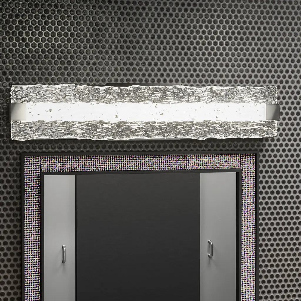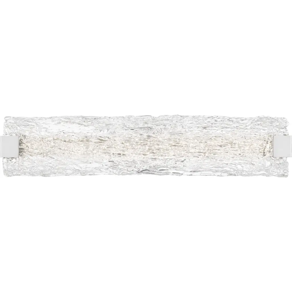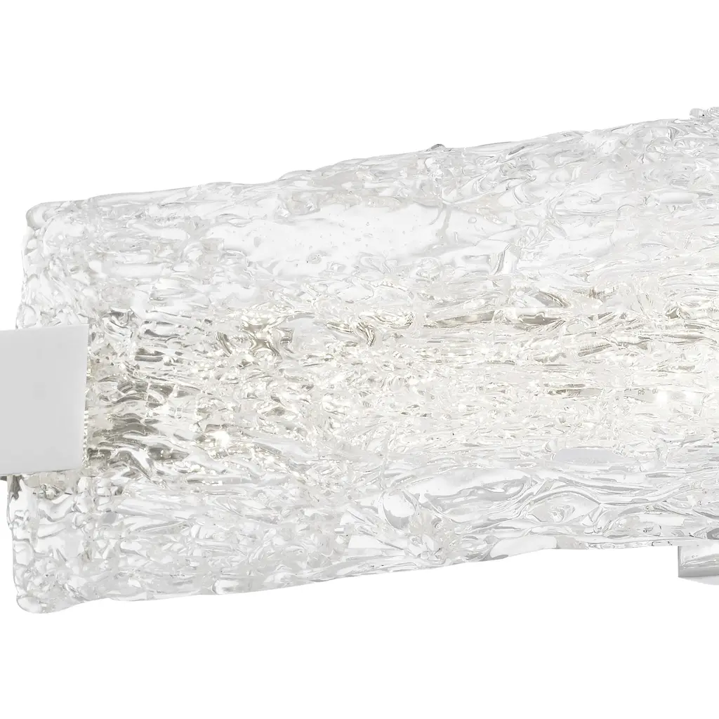 Inspired by delicate sheets of ice, the Winter collection is intense and dramatic. The integrated LED technology runs across the full length of the fixture, showcasing the unique crackling effect of the glass. Keeping with the contemporary style, the backplate and side brackets are finished in a glossy polished chrome.