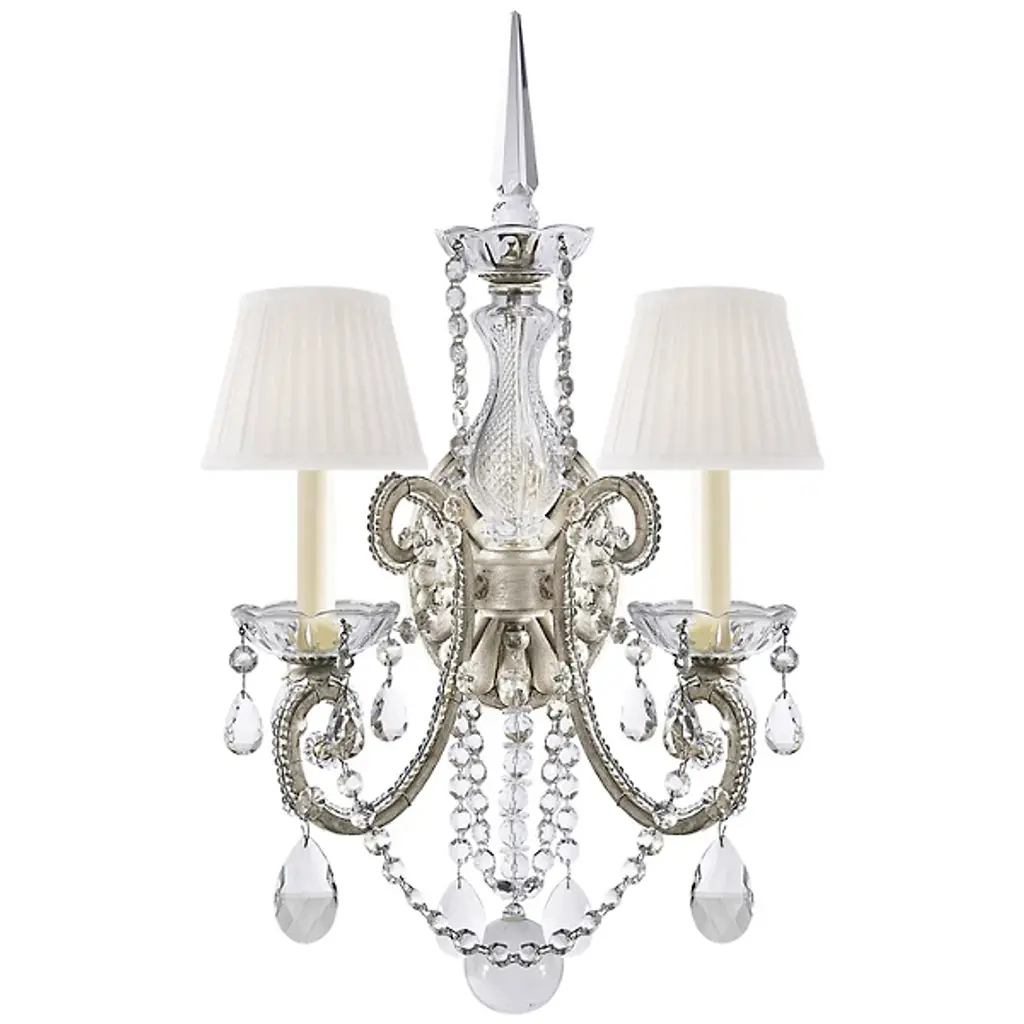 Wall sconce of steel in warm antiqued silver finish with brilliant crystal drops. Elegant, hand-tailored shade. ADA Compliant.