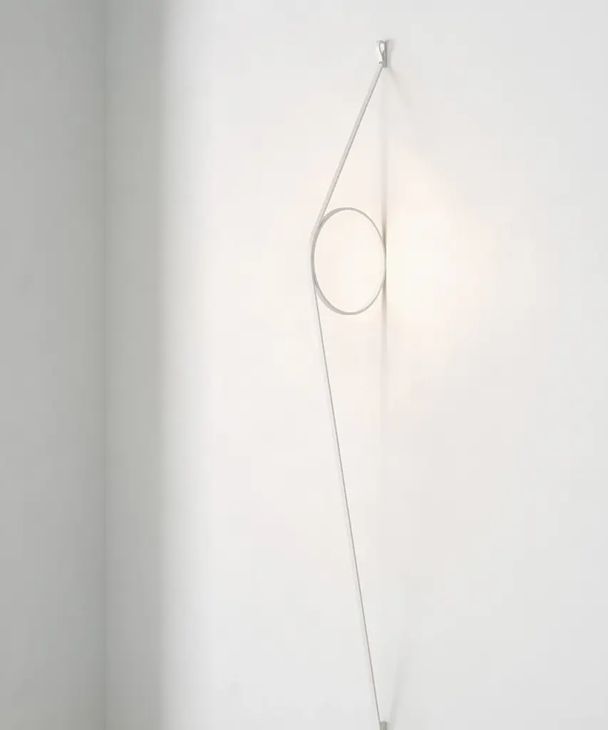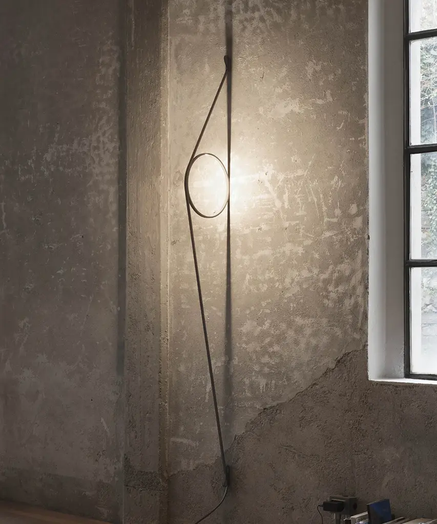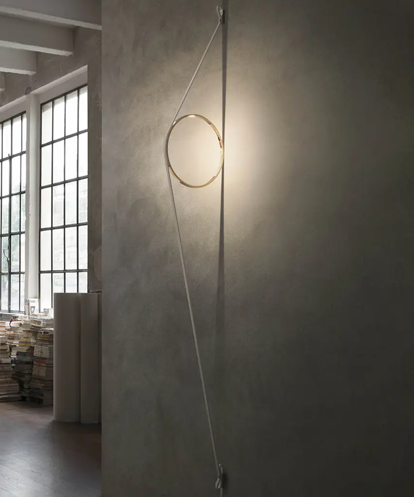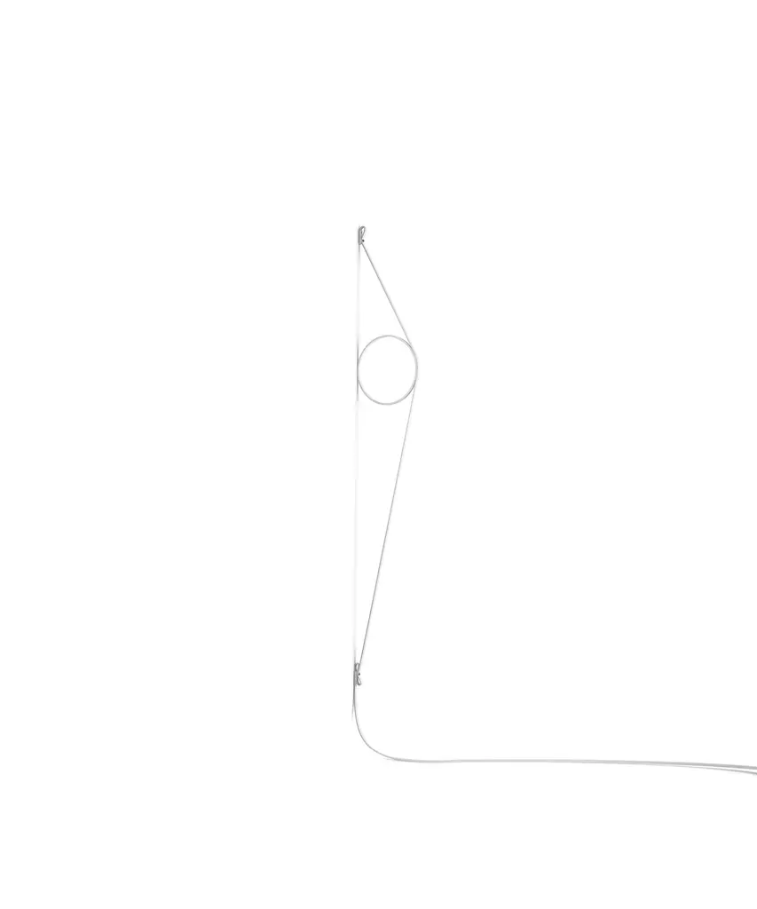 An exercise in reduction, stripped back to its most essential elements, offering beautifully rendered light from a spectacular wall sconce as you have never seen. The wire holds a simple ring fitted with an LED strip. The cable and ring are available in different color combinations and a range of finishes. Inspiration behind the design: Elevating what is hidden, and showcasing the lamp's wire, we appreciate its sculptural beauty. This authentic design is produced in Italy exclusively by Flos.