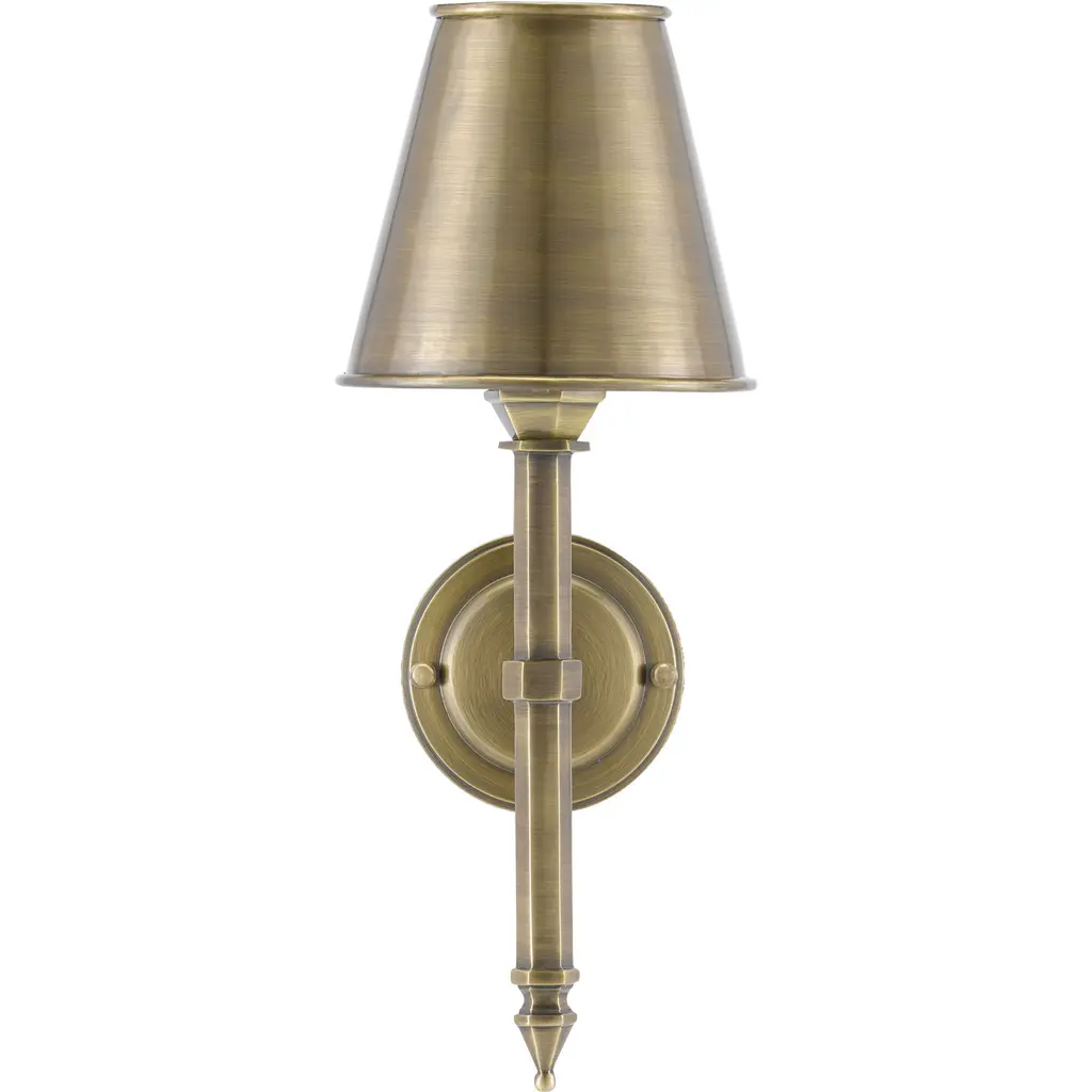 Classically-designed lighting is a hallmark of the Bunny Williams’ aesthetic, which applies to the Wollaton Wall Sconce in her collection. Made of brass in a light Moroccan antique finish, the intermingling of finely design geometric shapes and the brass shade in a matching finish are details of note. The gold wall sconce is certified for damp locations.