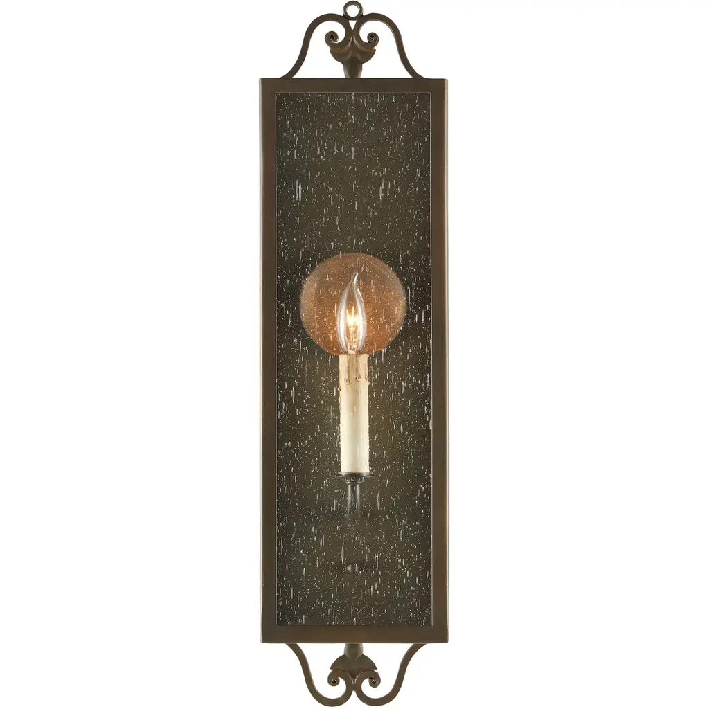 Expect a sizable dose of nostalgia to enter the room when this slender fixture is introduced. The Wolverton Wall Sconce, finished in bronze verdigris and fitted with seeded glass panels for an aged effect, holds powerful hints of Americana. The distressed reflector behind the candelabra bulb furthers the time-honored feel of this sconce. We also offer the Wolverton in a silver finish.