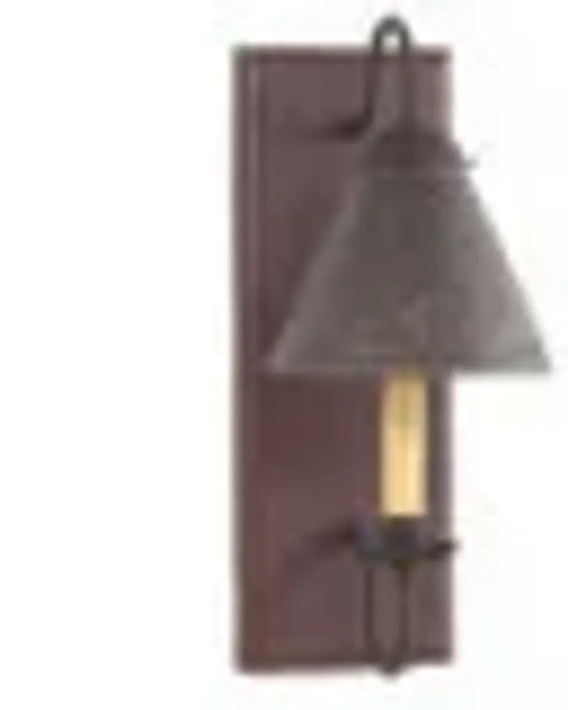 Wood & Metal Primitive Wall SconceWith Punched Tin Lamp ShadeThis stunning primitive country sconce will most certainly becomeA charmingly warm addition to whichever wall you decide to graceWith it's simple yet stylish elegance!This is a sconce turned wall light. The addition of a punched tin shade, the ambiance factor of this beautiful sconce is second to none. The gorgeous shade in completed in a country Kettle Black finish.It's size & rustic style make it so versatile and perfect to adorn almost any wall.Sweeping, textured-finished arm with crimped pan and candelabra socket create a warm inviting country style. More-so, the wood mount's textured paint finishes will guarantee an instant country elegance to your home and be a beautiful and functional focal point.All of our punched tin and country lighting offerings are individually handcrafted with old world craftsmanship, quality and style!NOTE: This is a direct-wire sconce light. Candelabra socket (60 watt max)Available in 4 Americana finishes (Black, Plantation Red, Pearwood, Vintage White) all with black textured arms and crimped candle pans.UL LISTEDMEASURES: 15"h x 6"w x 9"dThanks and be sure to check out our other fine offeringsMADE in the USA