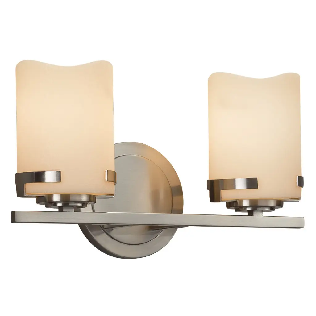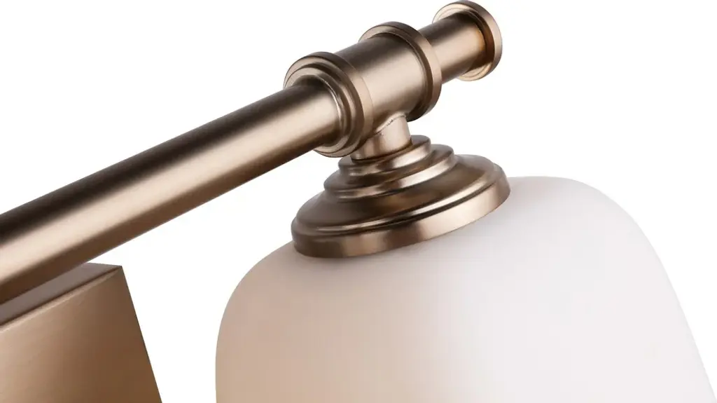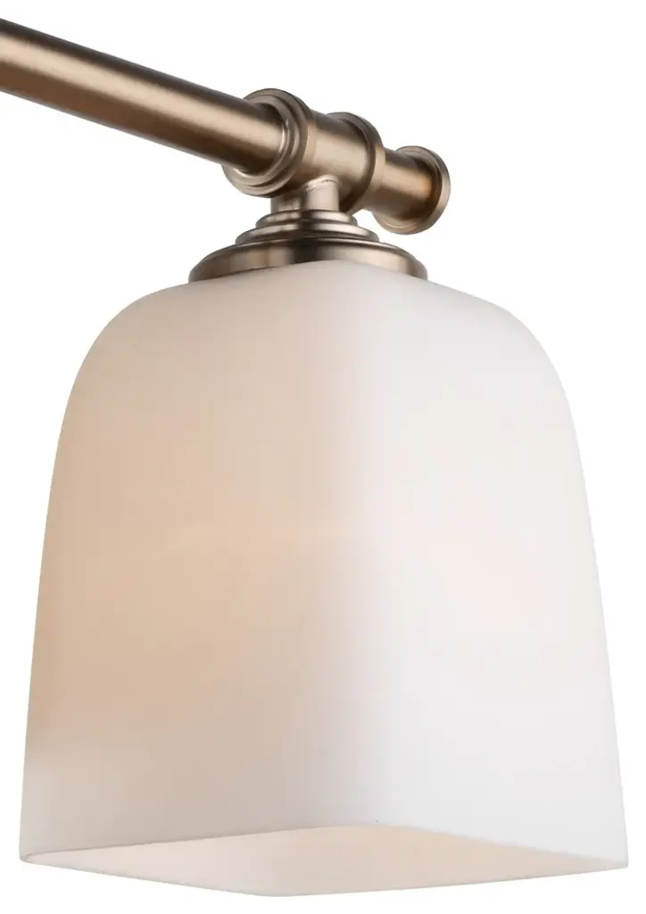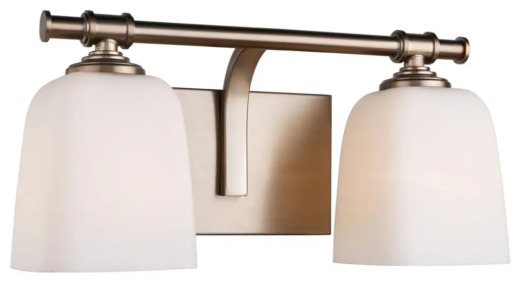 This 2-light bath has round tapered square opal glass supported by an arched frame. Its smooth design is a good fit for many transitional environments.Wattage: 60Bulbs Included? NoNumber of Bulbs: 2Bulb Type: E26