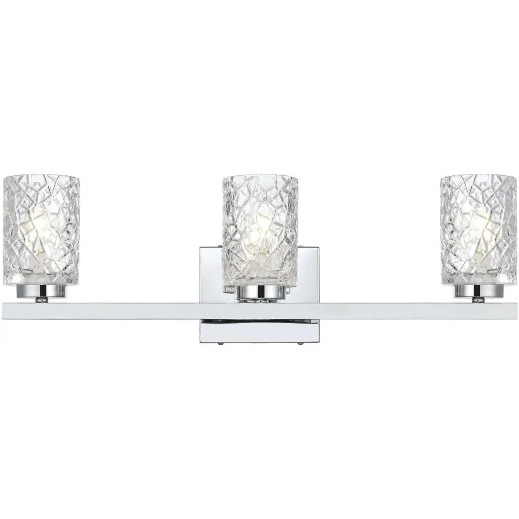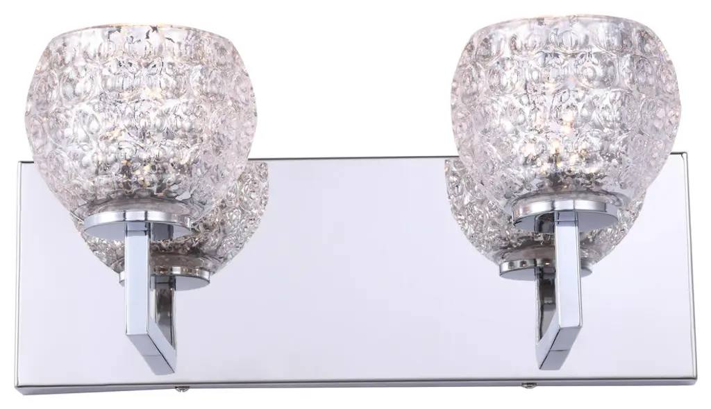 The Elise collection features several glass options on updated transitional hardware with a variety of fixtures available from mini-pendants to chandeliers to bath and wall sconces. With a quality chrome finish, this 2-light Bath can be displayed in many transitional environments.Fixture Dimensions: 13.75"W x 6.88"H x 5.63"EHalogen G9 Light Bulb IncludedCan be installed with glass facing up or down with hidden mounting points
