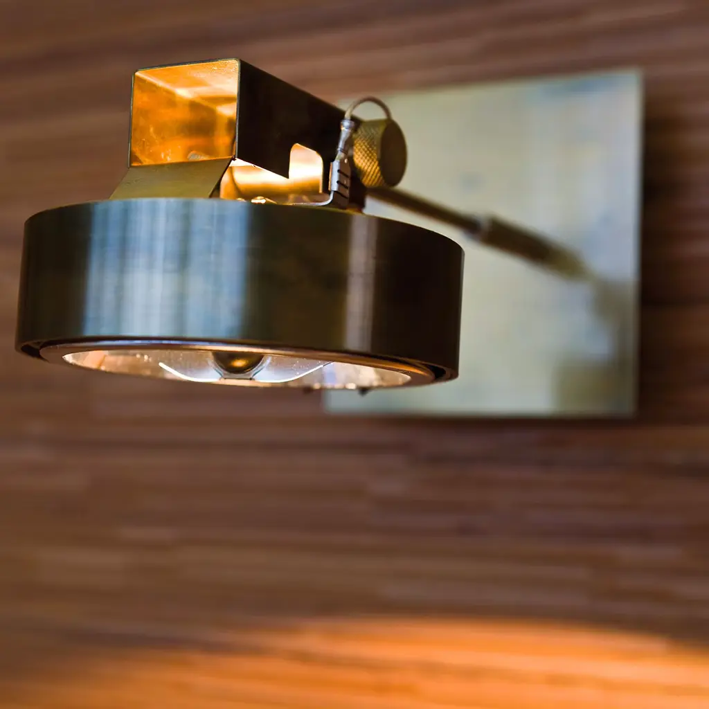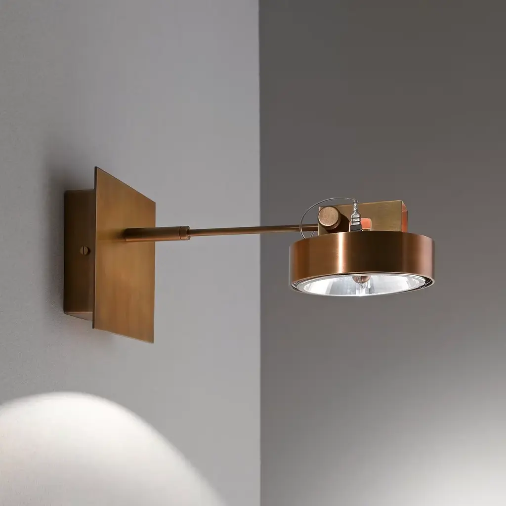 This adjustable LED lamp can be attached to the ceiling or on the walls, as a sconce. It was entirely handmade in thick brass to be used in environments where light is a fundamental element. Thanks to its design, this object is functional but adds a sophisticated allure to any room it is in.