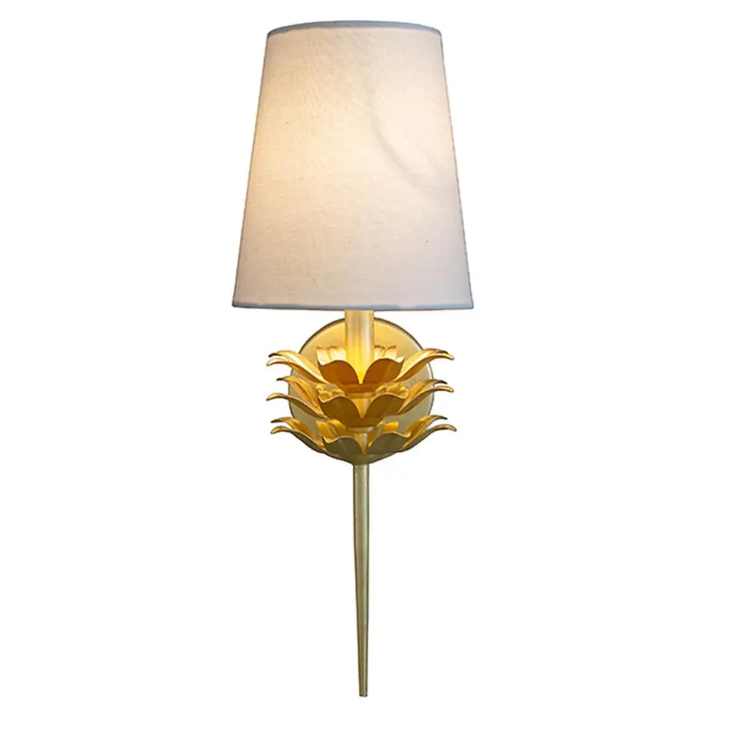 The beauty of a flower in bloom is captured in a sculpted gold wall sconce. The delicate stem rises up and blossoms into three layers of leaves surrounding a single bulb. A white linen shade sits on top of this luminous floral fixture.
