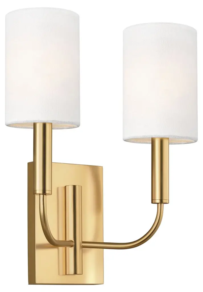 This two arm wall sconce by Worlds Away will add high style to any room. Hand finished in gold leaf with two crisp white linen shades, this wall sconce works equally well as accent lighting for your hallway or bookends for a vanity mirror. Dimensions: 12" W 18.5" H X 5" D (2) Color Options Available Light Bulb: (2) 40 W Candelabra Bulbs UL Approved Colors: Gold leaf Ships within 1-2 business days Free shipping in the U.S.